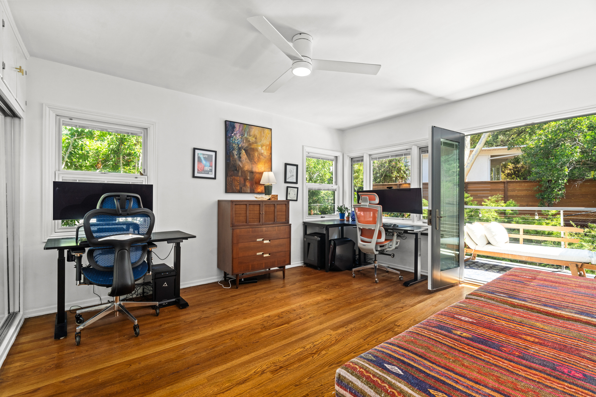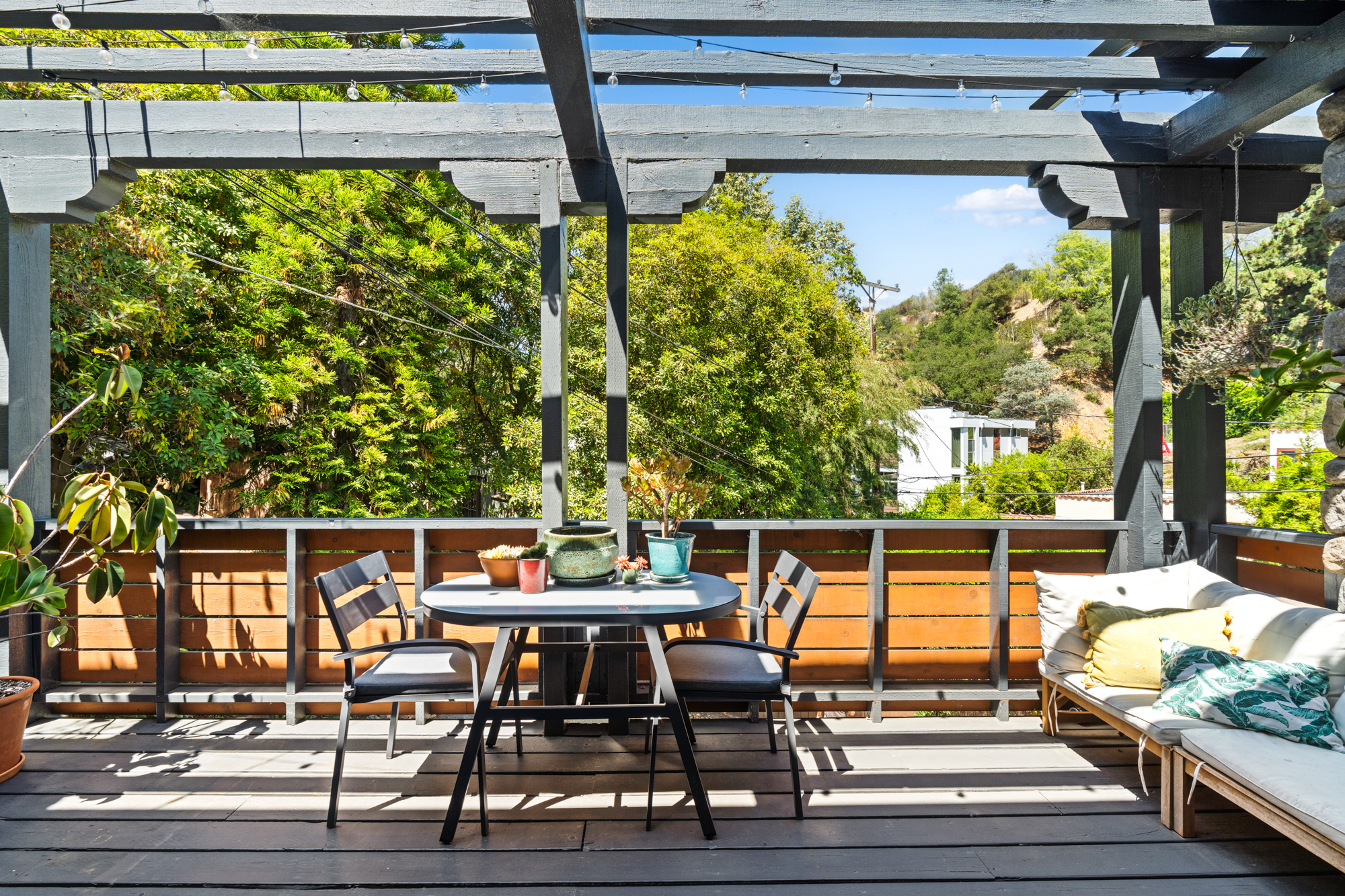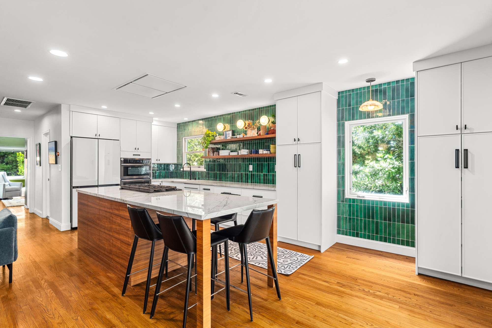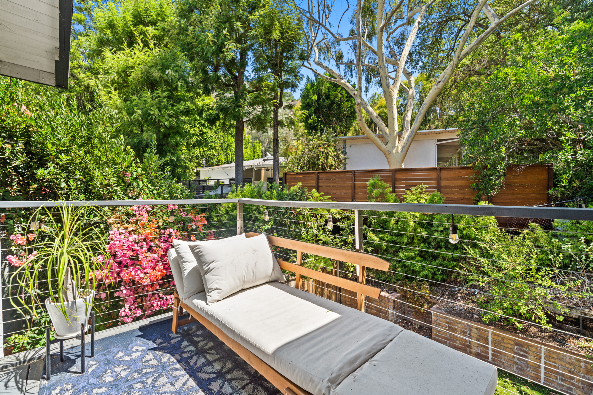 Nestled at the end of a quiet, non-through street and surrounded by lush greenery, this 1,978-square-foot, three-bedroom, three-bathroom home offers a rare sense of privacy paired with effortless indoor-outdoor living. Beautifully upgraded with designer finishes throughout, this charming retreat offers an abundance of natural light, with space to entertain on all scales. At the heart of the home, an open concept living and dining area flow seamlessly into the gourmet kitchen - complete with a large center island with breakfast bar, and professional-grade appliances. Dramatic emerald ceramic tile, bespoke marble surfaces and custom walnut cabinetry further enhance the space, which opens directly to an oversized outdoor terrace - perfect for alfresco dining. Three-bedroom suites consist of a lower-level primary, complete with sumptuous en-suite bathroom, large walk-in closet and sliding doors that open to a private covered patio, and the charming back yard with lush, mature landscaping. Two guest bedrooms share an outdoor terrace with views of the back garden, with an additional two designer-guest bathrooms for added convenience. A finished two car garage and ground floor storage room complete the home. This is a prime opportunity to lease a turn-key property in the heart of Bel Air - moments from the best dining, leisure and transportation links Los Angeles has to offer.