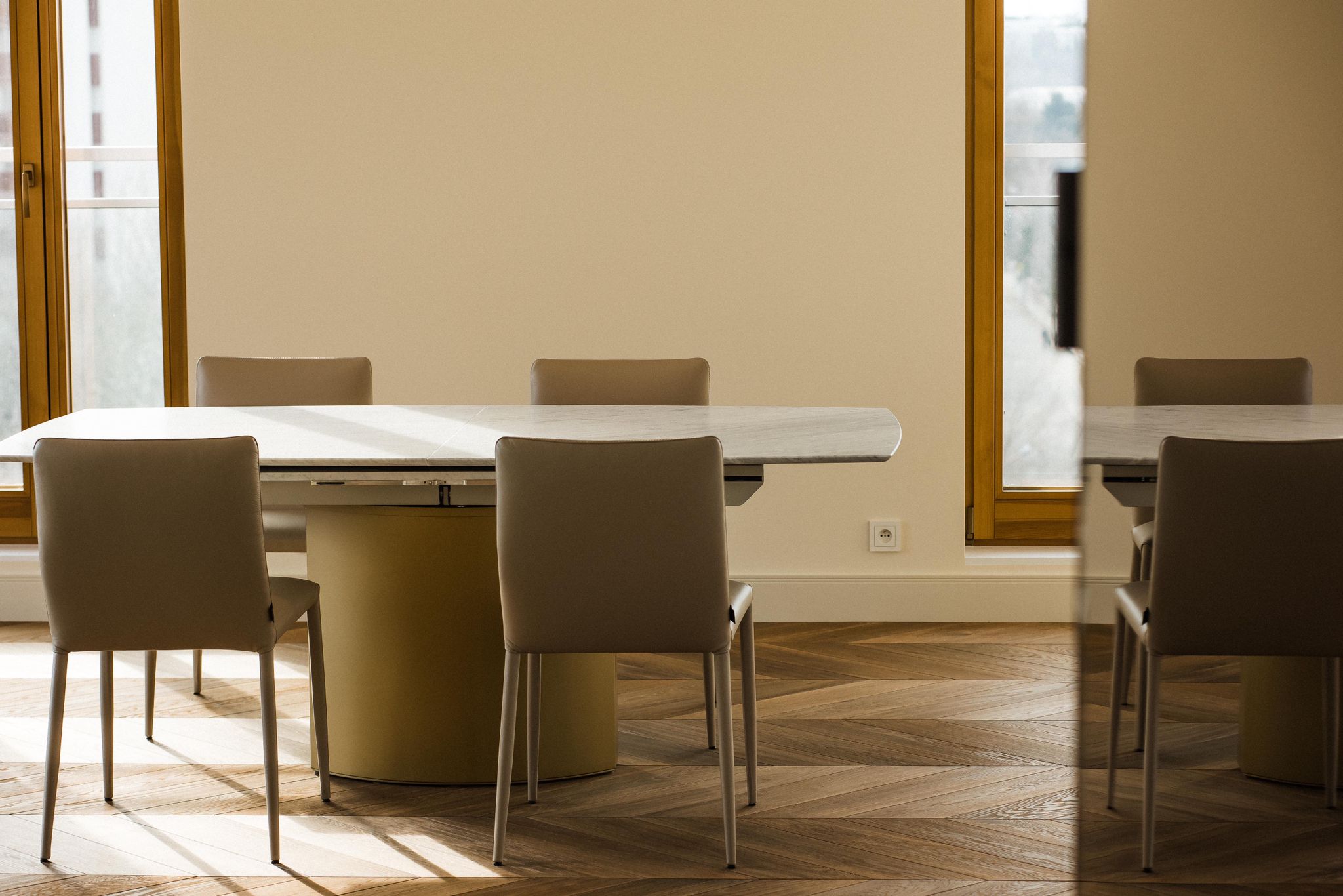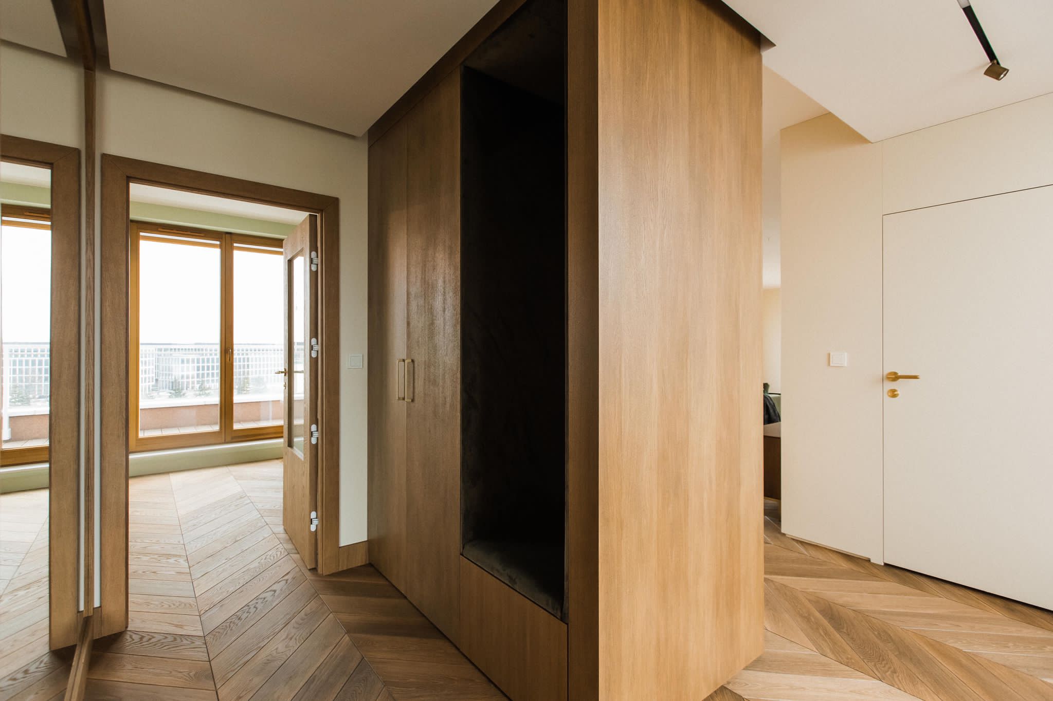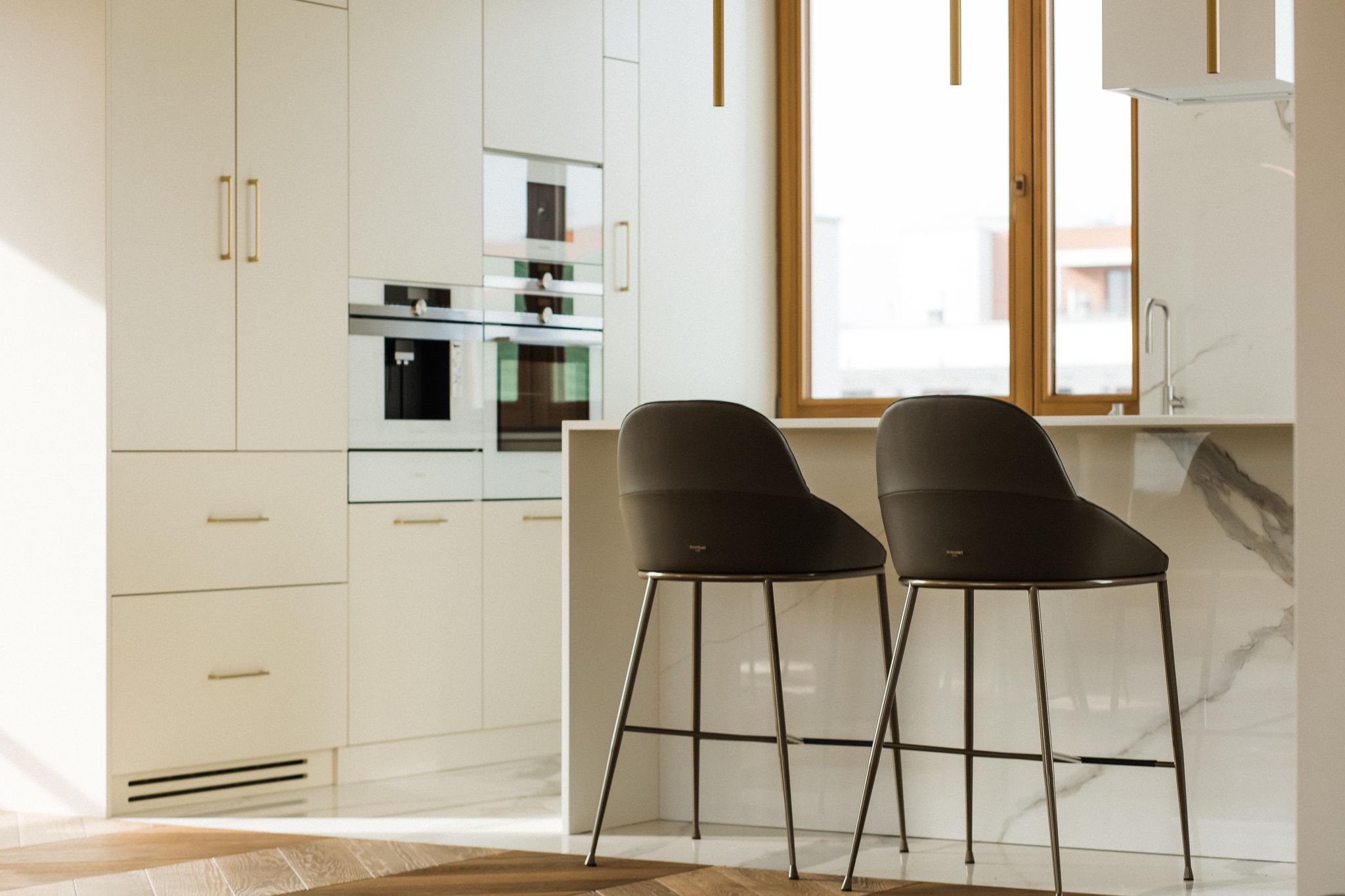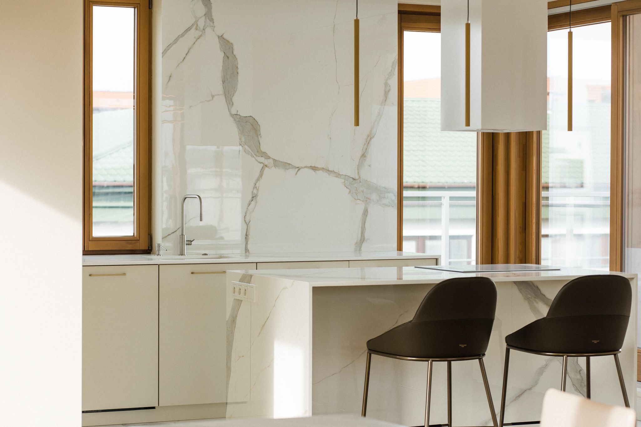 The interiors stand out for their timeless elegance and exceptional quality of finishes. Natural materials such as oak flooring, Patagonia stone and quartz sinters create a cohesive and luxurious environment. Large wooden windows and carefully designed lighting enhance the sense of space and natural light throughout the apartment.