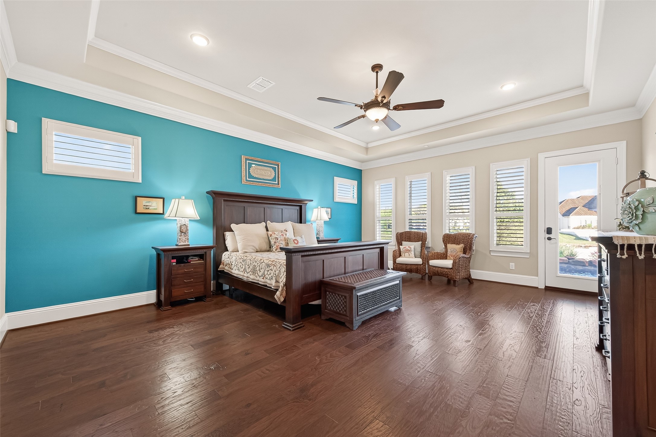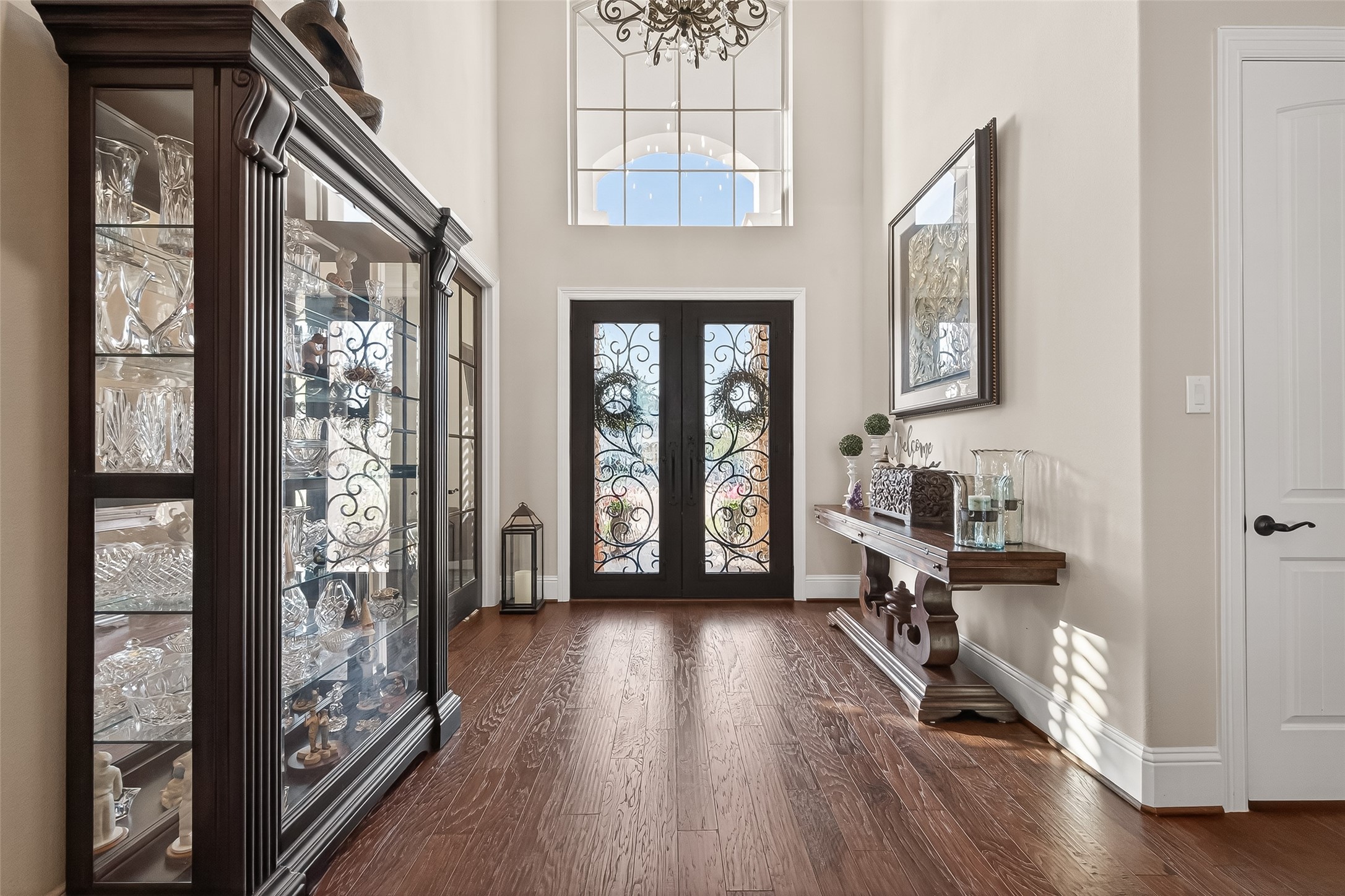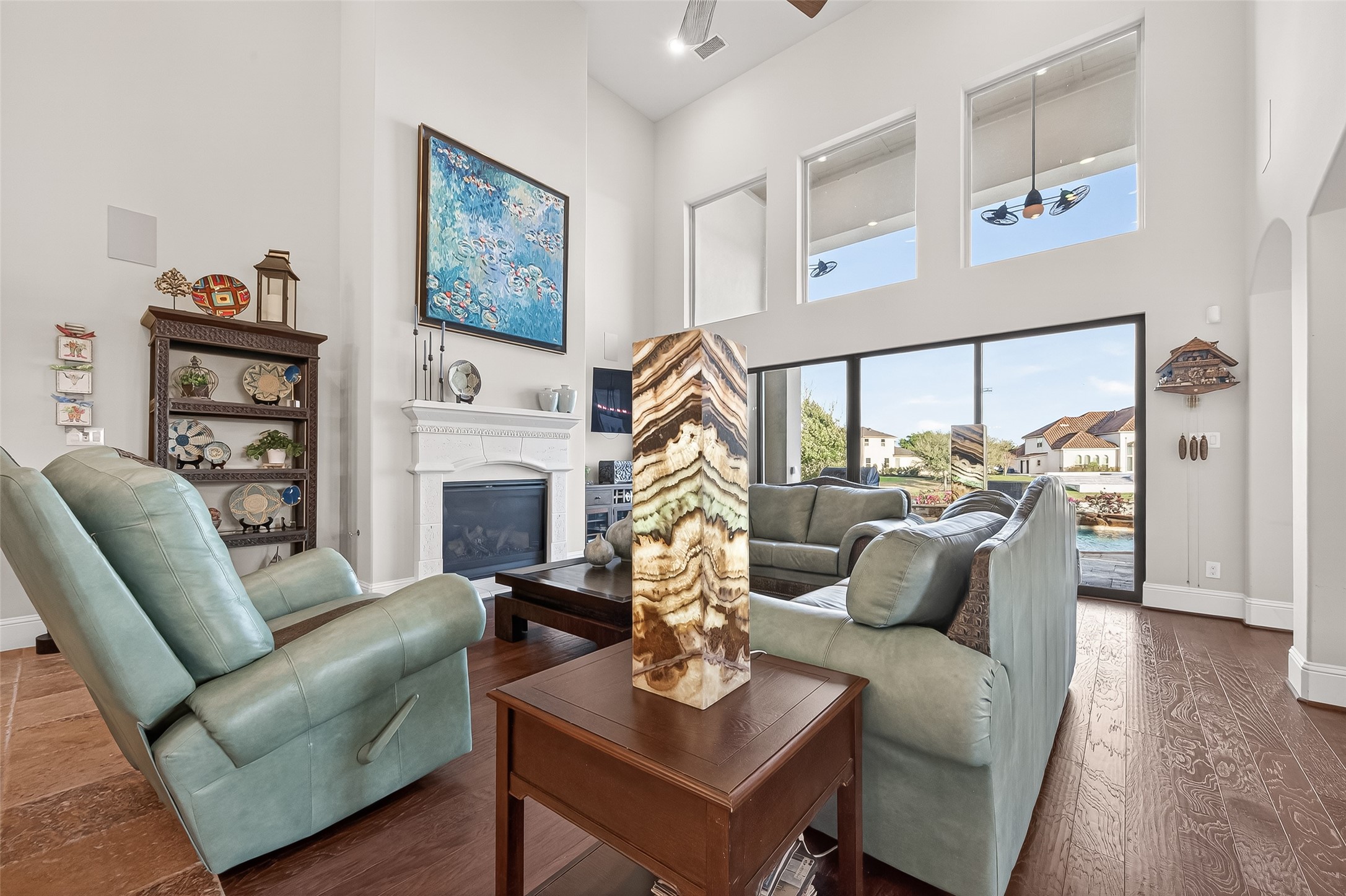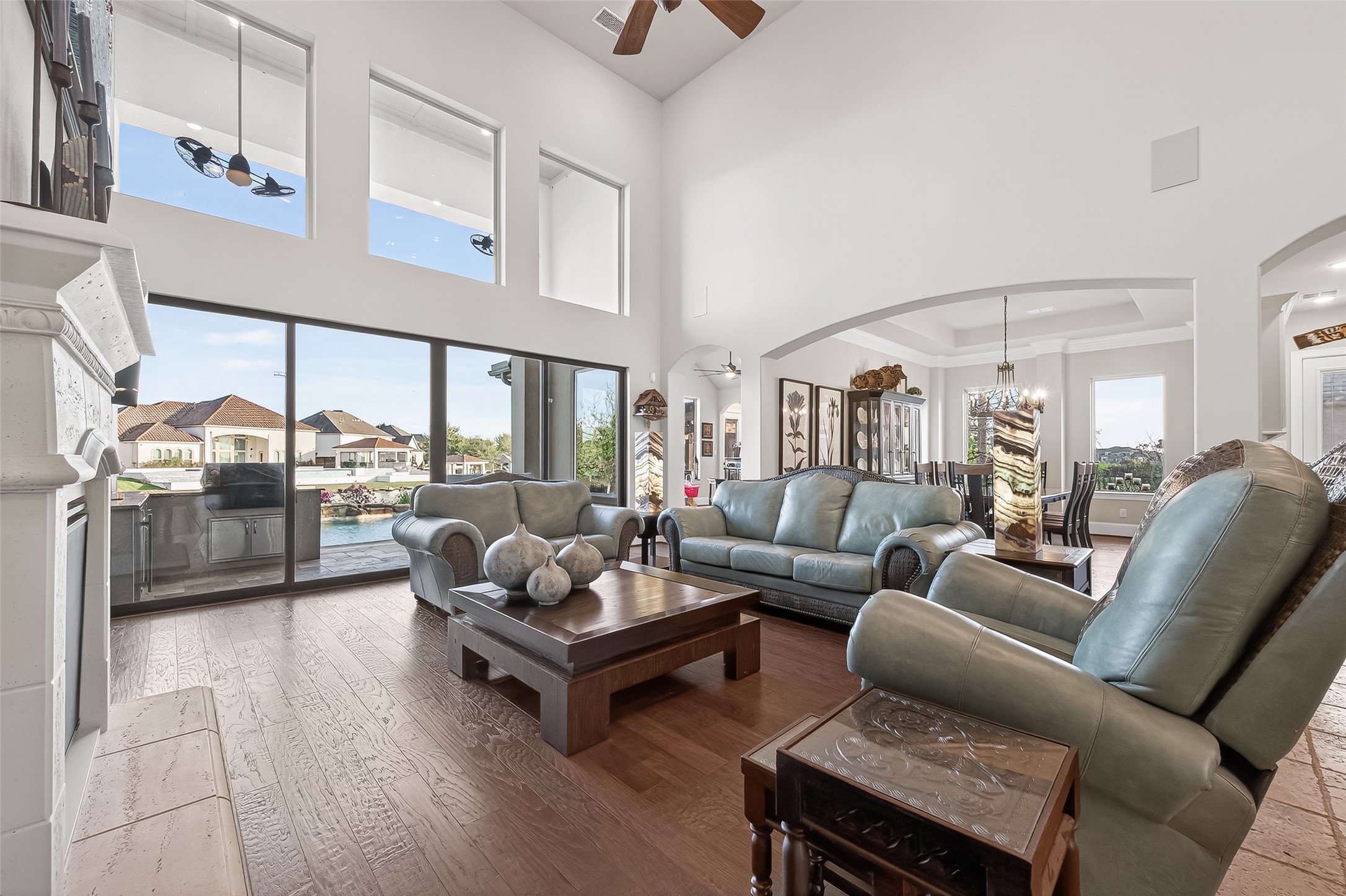 This exceptional two-story traditional home is perfectly situated on the water in the highly sought-after Towne Lake community, offering a blend of luxury, comfort, & resort-style living - nestled on a quiet cul-de-sac within a gated section. Step inside to soaring high ceilings, elegant travertine tile, rich wood flooring, and an abundance of natural light streaming through expansive sliding doors that open to your private backyard oasis. Plantation shutters add timeless charm throughout, along with a dedicated wine room complete with a refrigerator and ice maker. Two bedrooms are located downstairs along with a game room and a flex space that can be transformed into a media room. Outdoors, enjoy true waterfront living with a spectacular pool and hot tub featuring a tanning lounge area, multiple gathering spaces including a pergola seating area, outdoor kitchen, and a firepit. An outdoor shower adds convenience after a day in the sun. Whole-house is included for peace of mind.
