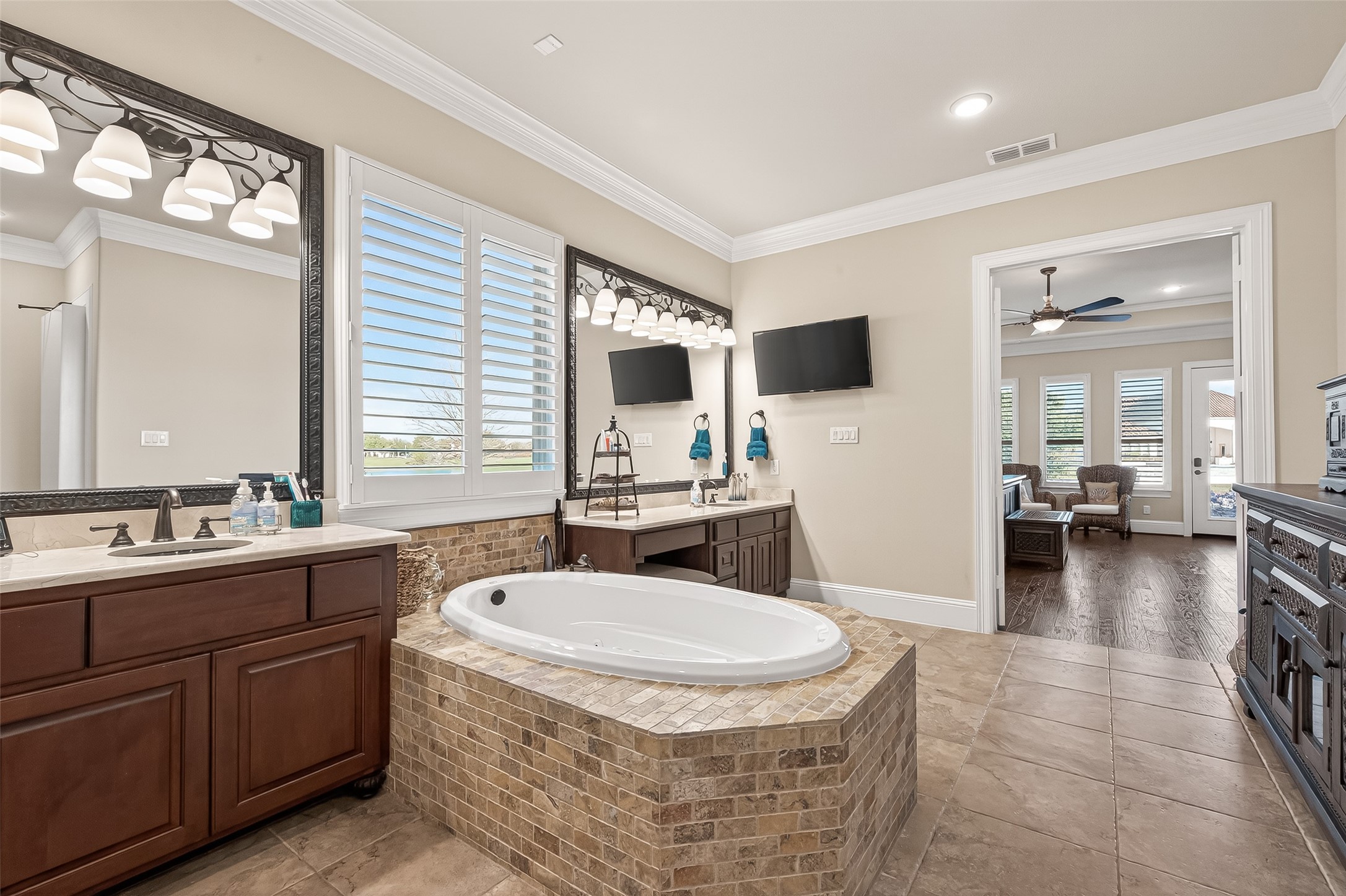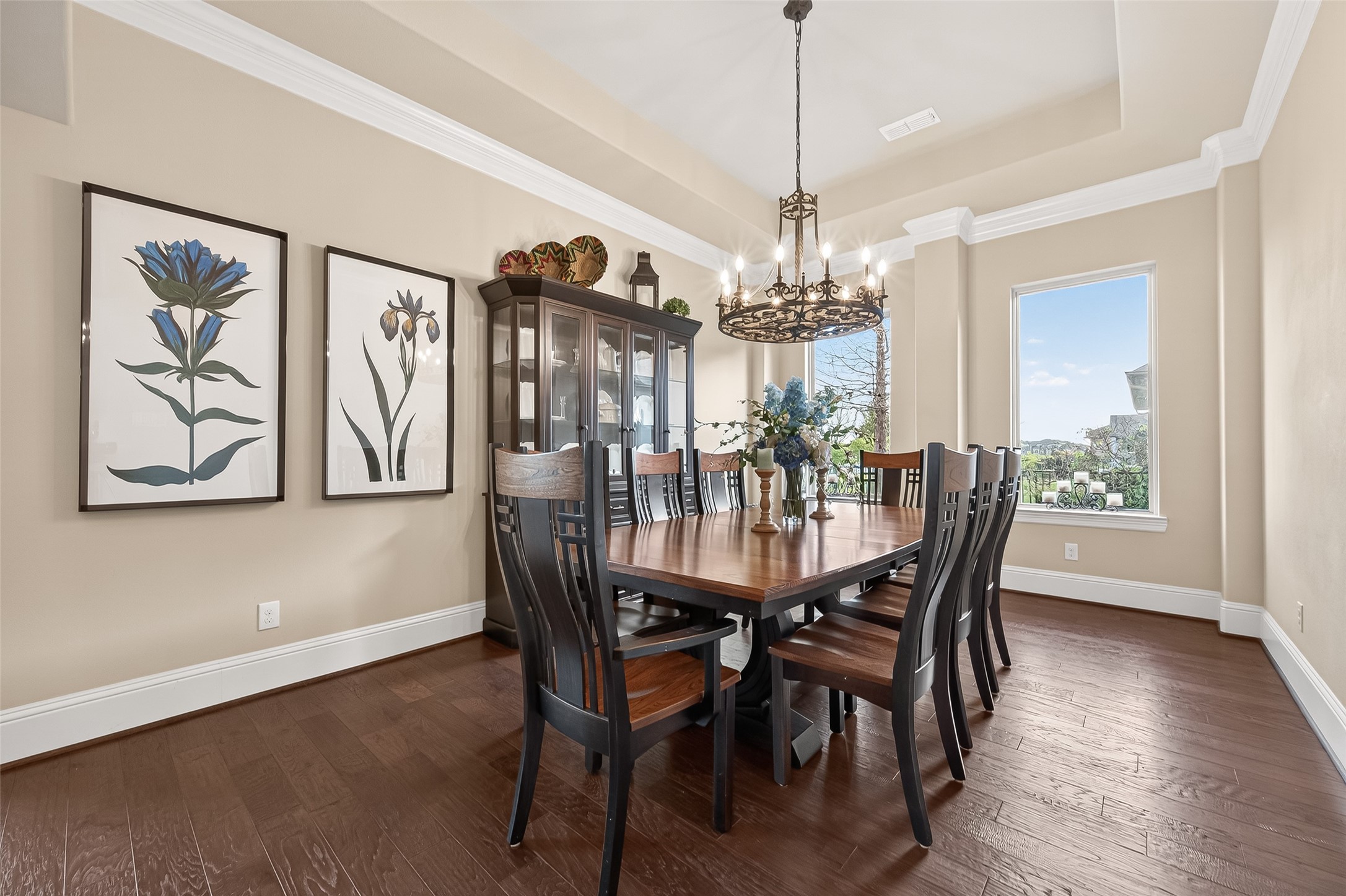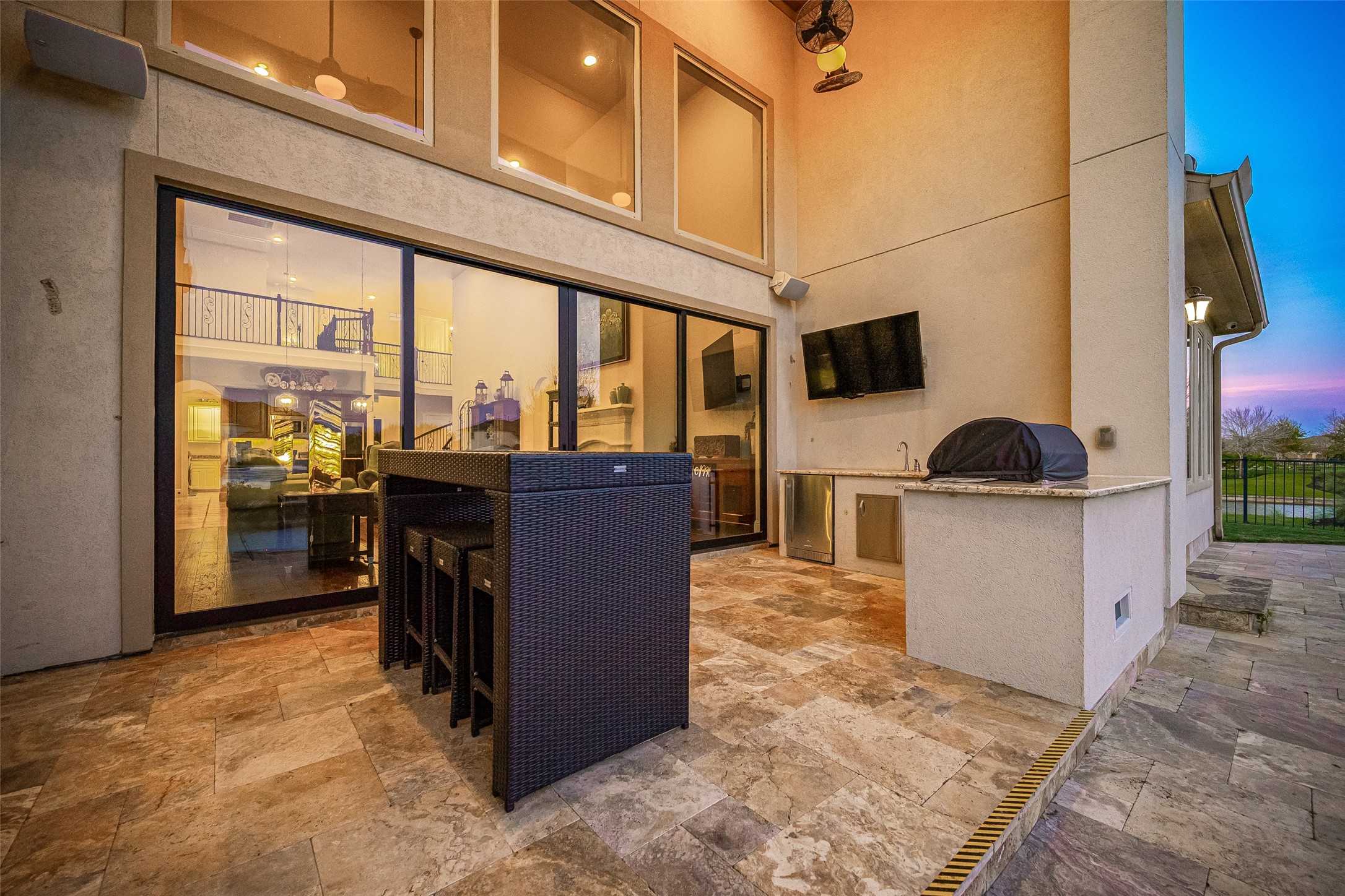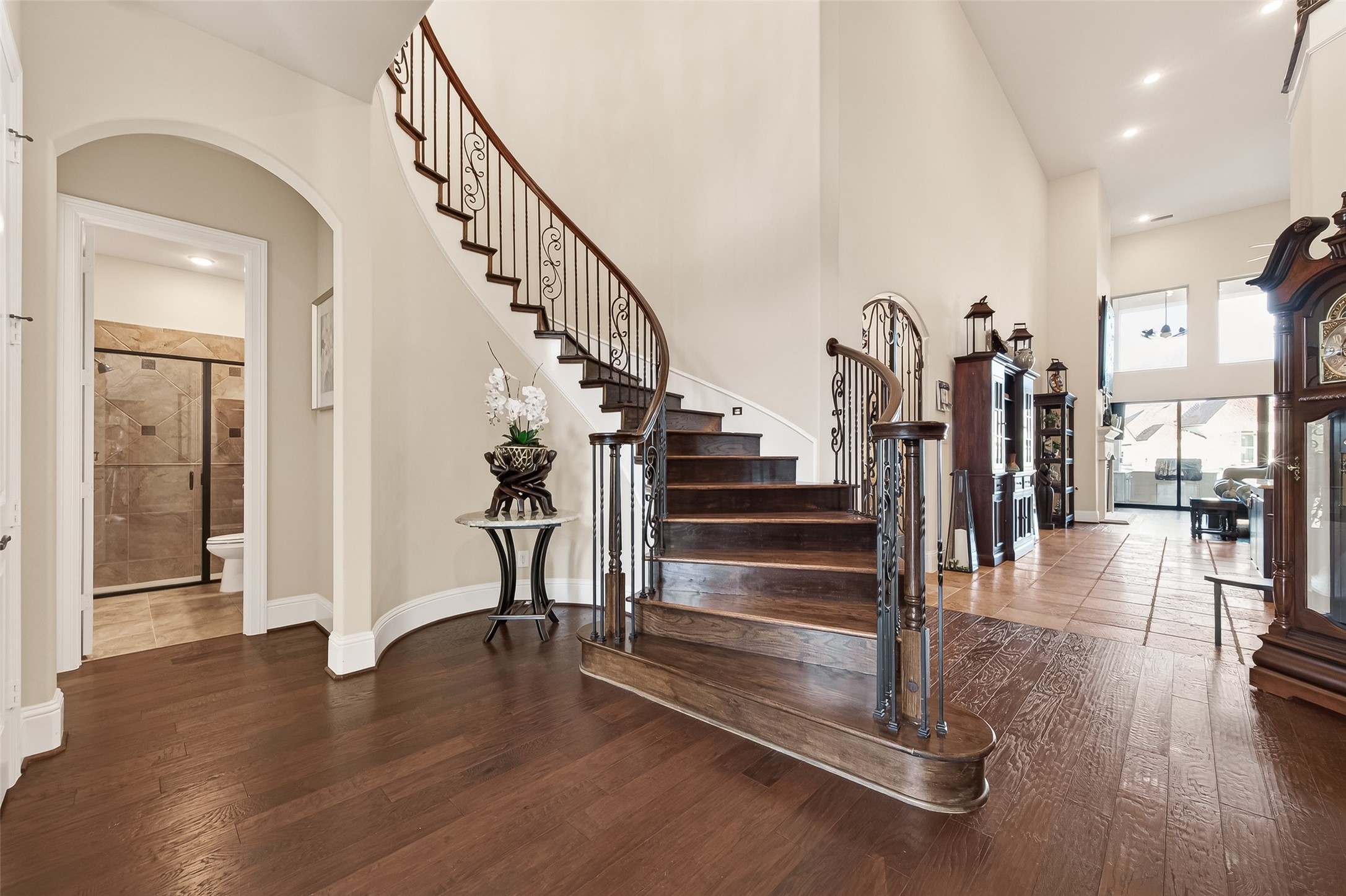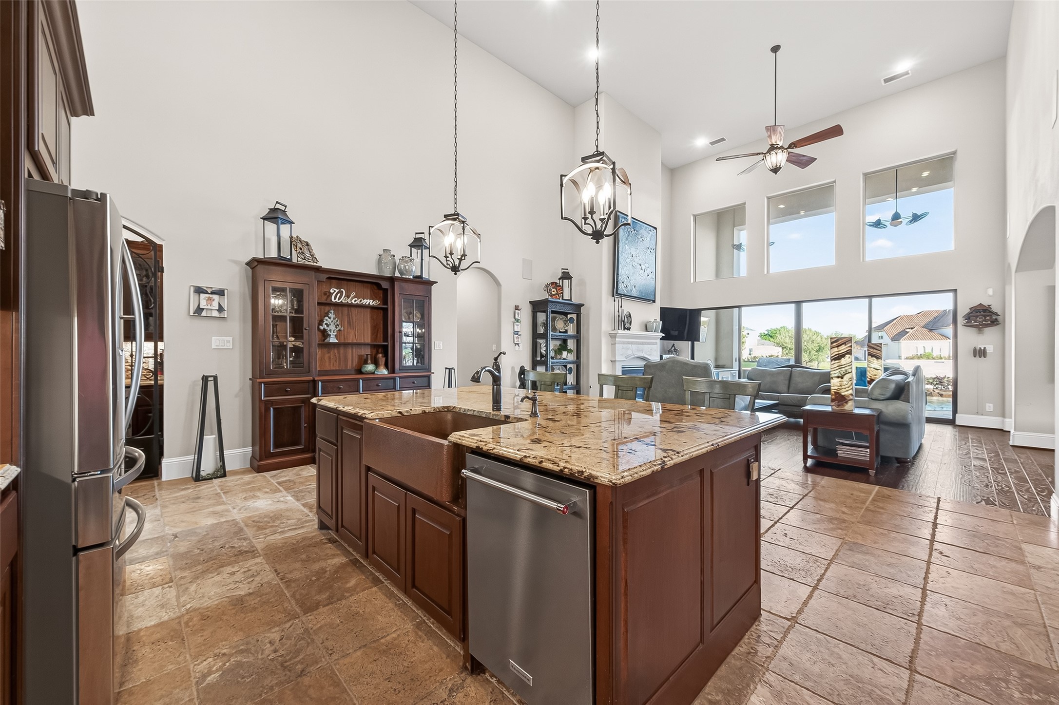 This exceptional two-story traditional home is perfectly situated on the water in the highly sought-after Towne Lake community, offering a blend of luxury, comfort, & resort-style living - nestled on a quiet cul-de-sac within a gated section. Step inside to soaring high ceilings, elegant travertine tile, rich wood flooring, and an abundance of natural light streaming through expansive sliding doors that open to your private backyard oasis. Plantation shutters add timeless charm throughout, along with a dedicated wine room complete with a refrigerator and ice maker. Two bedrooms are located downstairs along with a game room and a flex space that can be transformed into a media room. Outdoors, enjoy true waterfront living with a spectacular pool and hot tub featuring a tanning lounge area, multiple gathering spaces including a pergola seating area, outdoor kitchen, and a firepit. An outdoor shower adds convenience after a day in the sun. Whole-house is included for peace of mind.