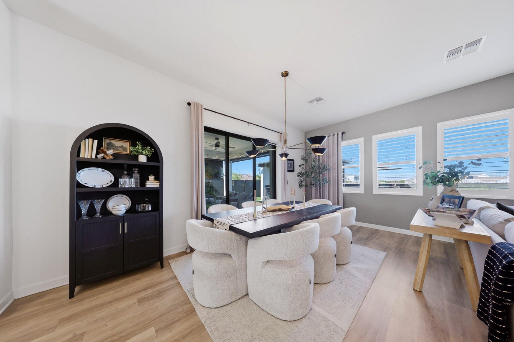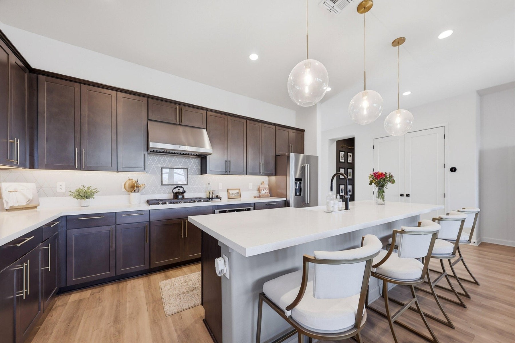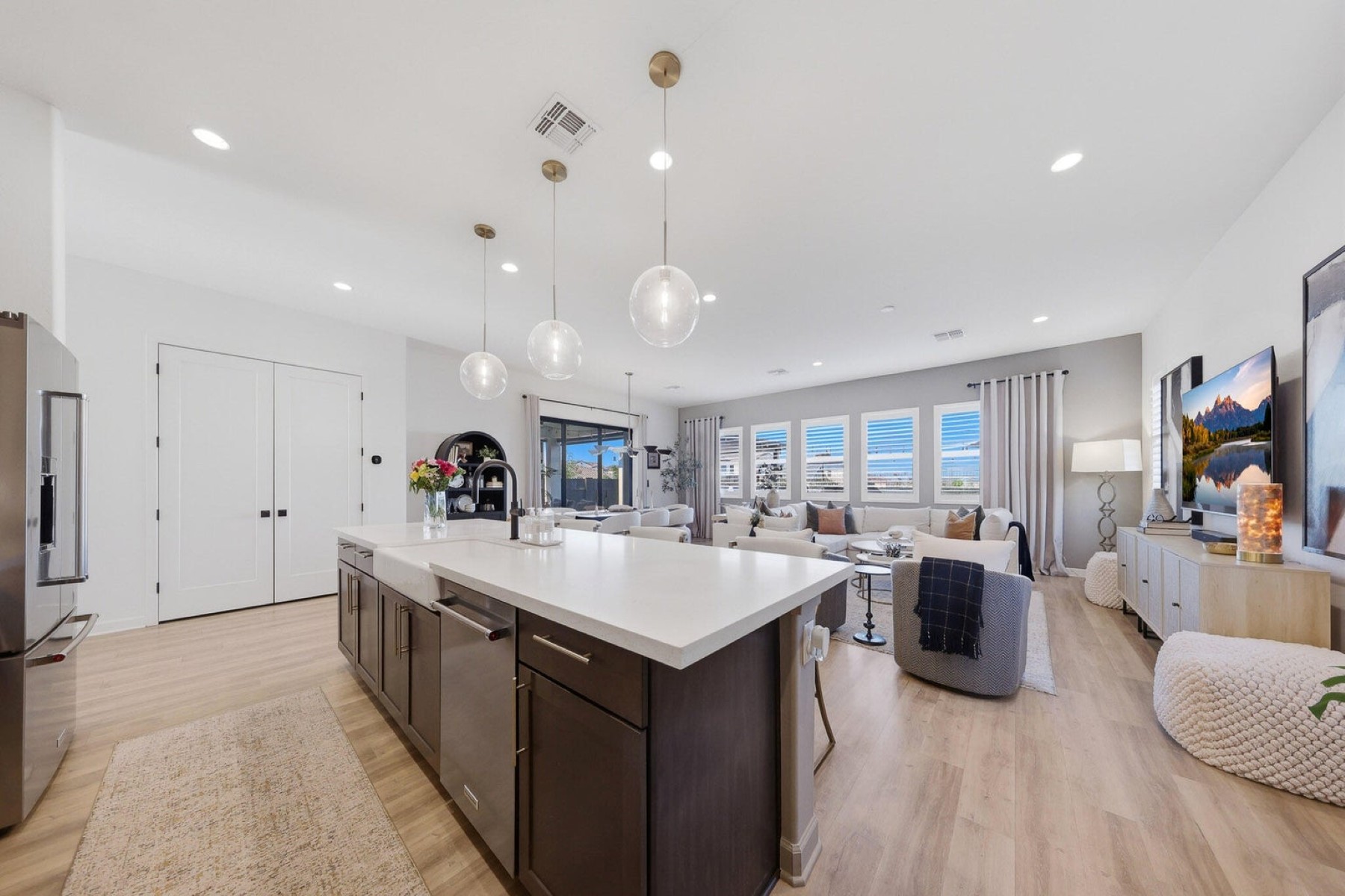 Come and check out this Impeccably beautiful Toll Brothers Jewel Box!!! The home sits on the best oversized lot in the subdivision as it backs up and sides the greenbelt areas, and it's in a cul-de-sac too! This beautifully designed, open-concept kitchen is ''one'' of the centerpieces of the home, blending style and functionality. Featuring a spacious island with sleek quartz countertops, this kitchen offers ample prep space and casual seating for four. The Rich dark wood cabinetry (with decorative pulls) provides abundant storage and creates a striking contrast against the light backsplash and countertops, while under-cabinet lighting adds a warm, inviting ambiance. The suite of stainless steel appliances, including double built-in wall ovens, gas cook-top with SS hood, and a French door KitchenAid Refrigerator delivers modern convenience and a polished look. Globe pendant lighting above the island, complements the recessed lighting throughout. The kitchen flows effortlessly into the adjacent living and dining areas, enhancing the home's open feel and making it ideal for gatherings. Speaking of entertaining, don't miss that Gorgeous Outdoor Space and Entertaining area! Here you have a custom-built pavilion featuring a tongue-and-groove ceiling, and an outdoor kitchen, equipped with a built-in grill, stainless steel appliances, a dedicated beverage refrigerator and ample stone countertop prep space. It all comes with a wall-mounted 86in television, perfect for hosting game day or alfresco dinner parties. Beyond the pavilion, the yard transitions into a multi-zoned retreat designed for relaxation where you have an above ground Spa, an in-ground gas Fire Pit Lounge space, covered Patio area with Pro automated Black-out privacy Shades and a Low-Maintenance yard, which is finished with professional-grade artificial turf and geometric Travertine pavers, offering a lush, green aesthetic without the upkeep. All of this is tied together by elegant bistro string lighting that crisscrosses the yard.Throughout the home you have Custom closet systems in all of the closets, Plantations Shutters on all of the windows (including the garage), raised panel doors, and ultimately pride of ownership all over at this Contemporary Farmhouse home! The Preserve at San Tan Community offers Pickle Ball, Bocce Court, Basket Ball Court, Pool table & Ping Pong Table Area, along with and Amphitheater Pavilion with Built in BBQ station, Fire Pit seating areas, Hammocks and a Frisbee field too! The home is 4 miles away from Pecan Lake Entertainment. It is a family-friendly haven featuring amusement park attractions, event spaces, and a diverse culinary experience. From savory BBQ to delightful gelato, and includes amazing pizza, fresh salads, flavorful pasta dishes, and more. Renowned as one of Queen Creek's top destinations, they cater to all ages with activities like mini golf, virtual reality, go-karts, arcades, escape rooms, axe throwing, karaoke, and the serene beauty of the botanical gardens. This home is also 2.2 miles away from San Tan flats Steakhouse Saloon that has live music, catering to Western Entertainment.