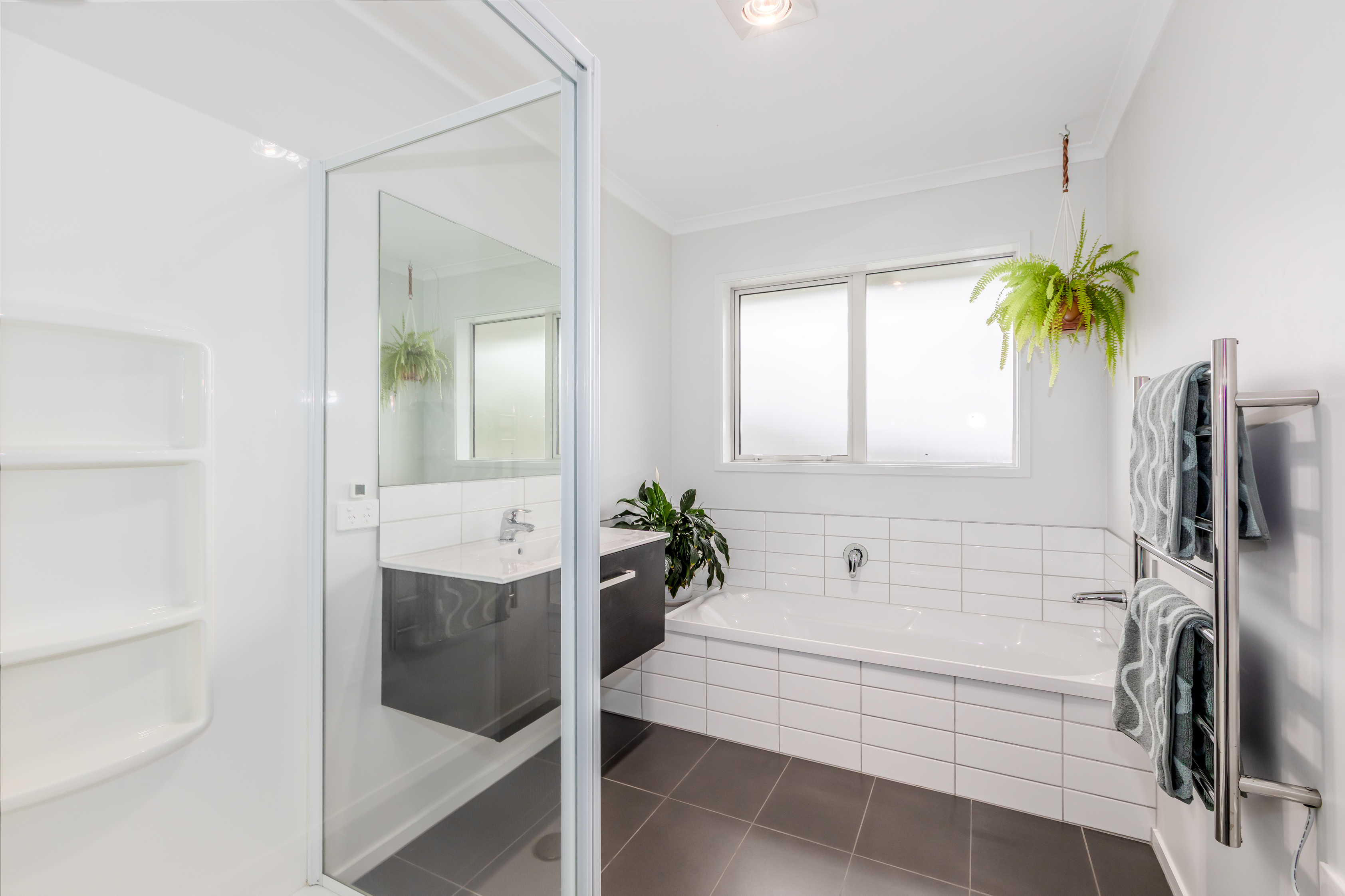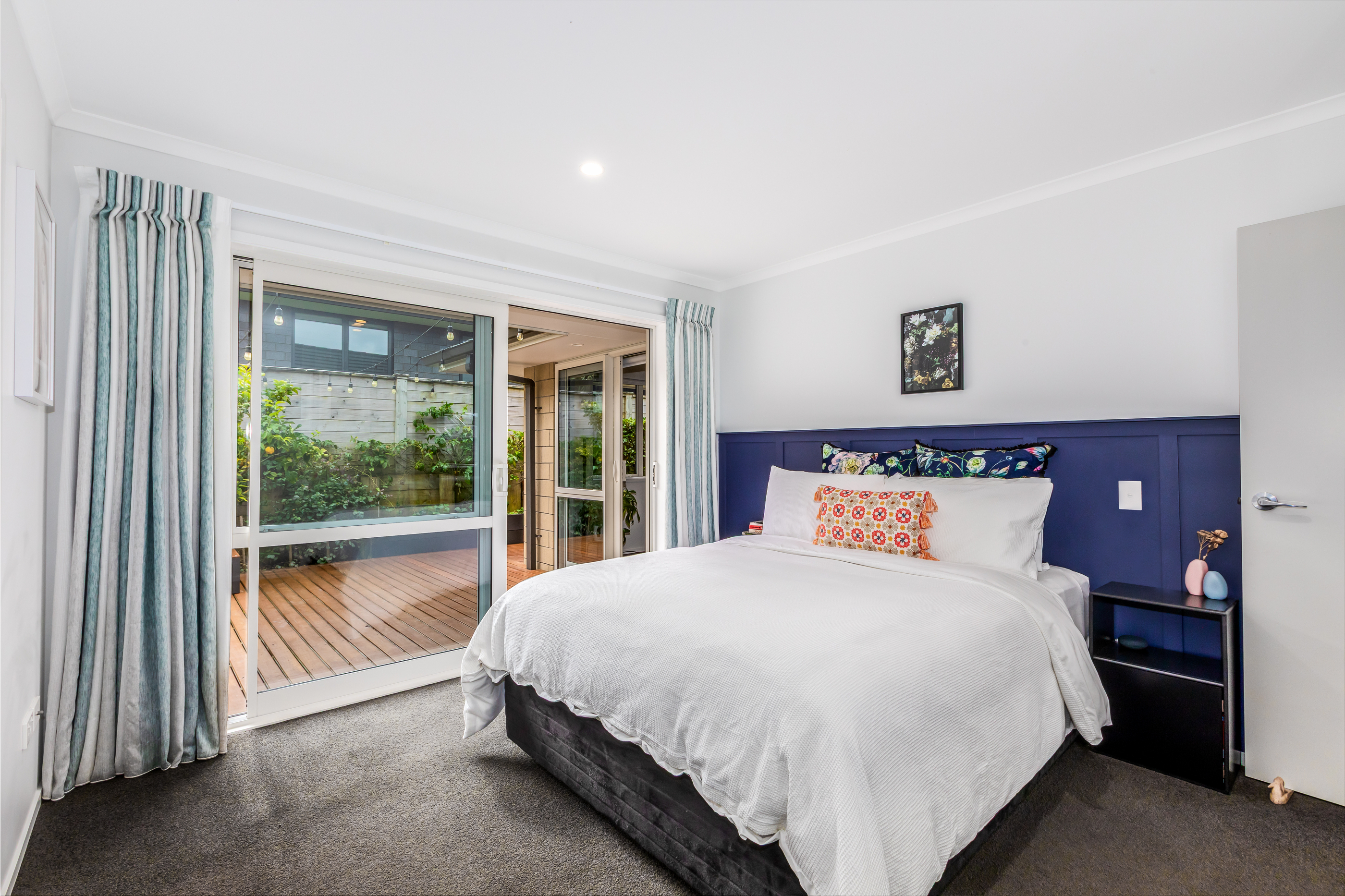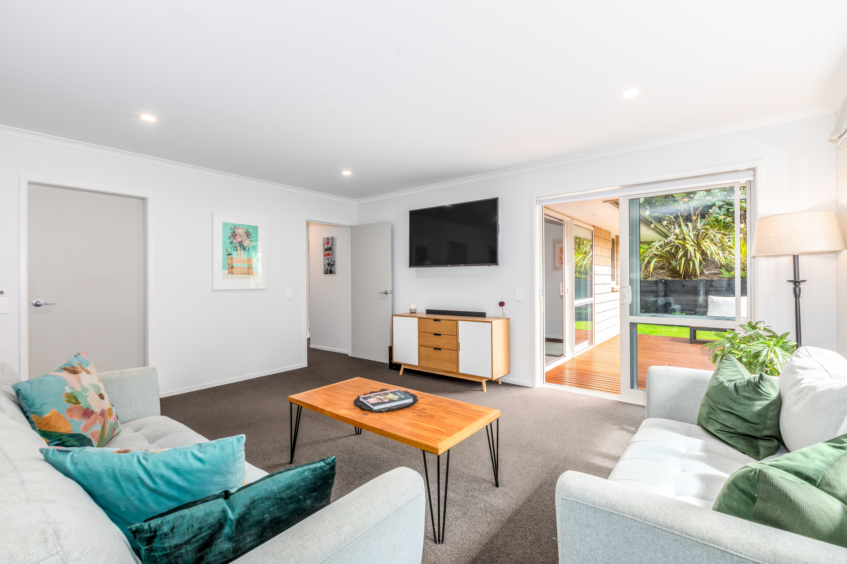 Three double bedrooms, including a light and bright master bedroom featuring a walk-in wardrobe, en-suite bathroom and ranch slider access to the deck. There’s a family bathroom and separate toilet, with the laundry conveniently located in the garage.