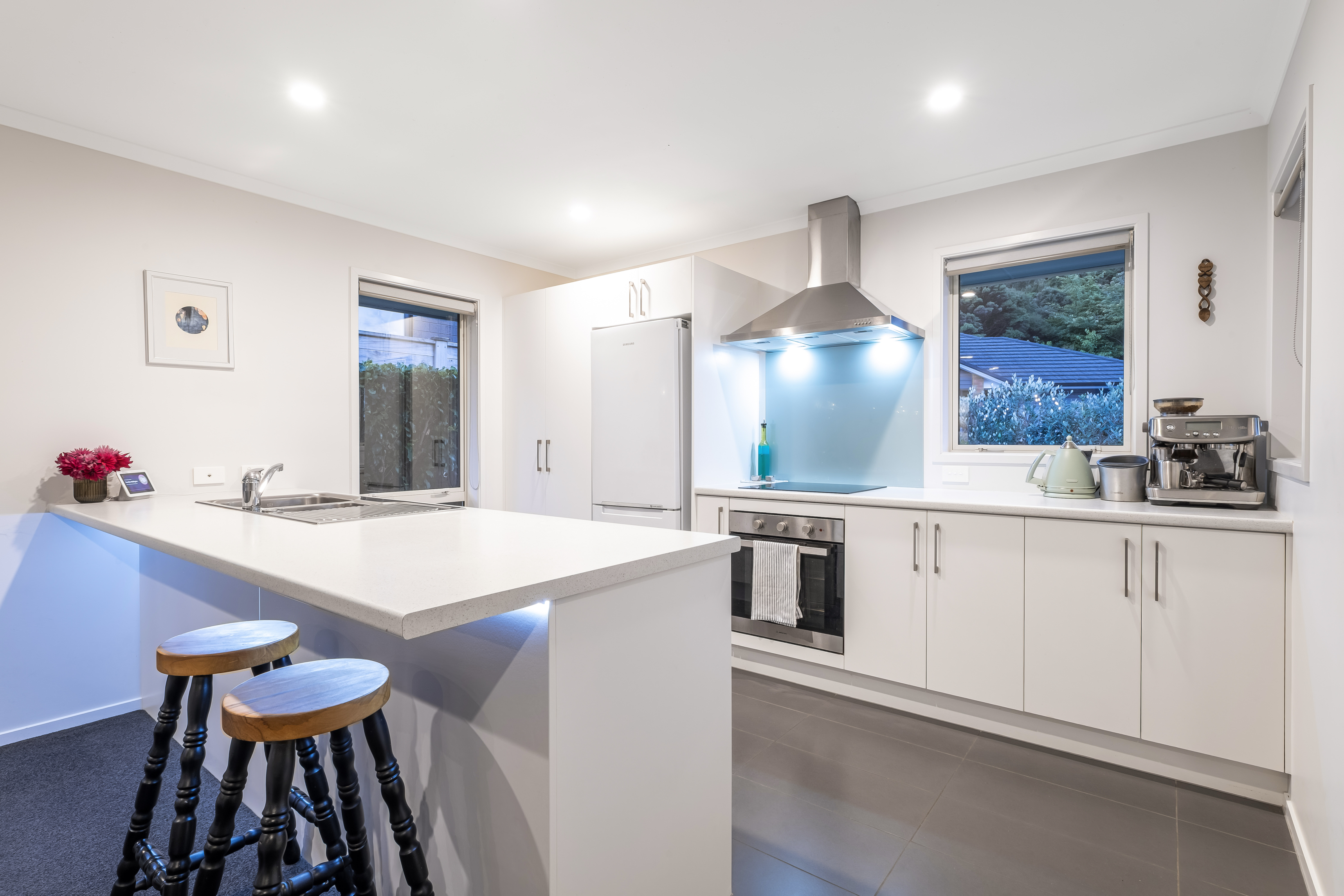 The spacious open plan layout includes a modern kitchen with an oversized island bench, dining area and generous living room that opens to a sunny deck and garden, making for easy outdoor entertaining and relaxation.