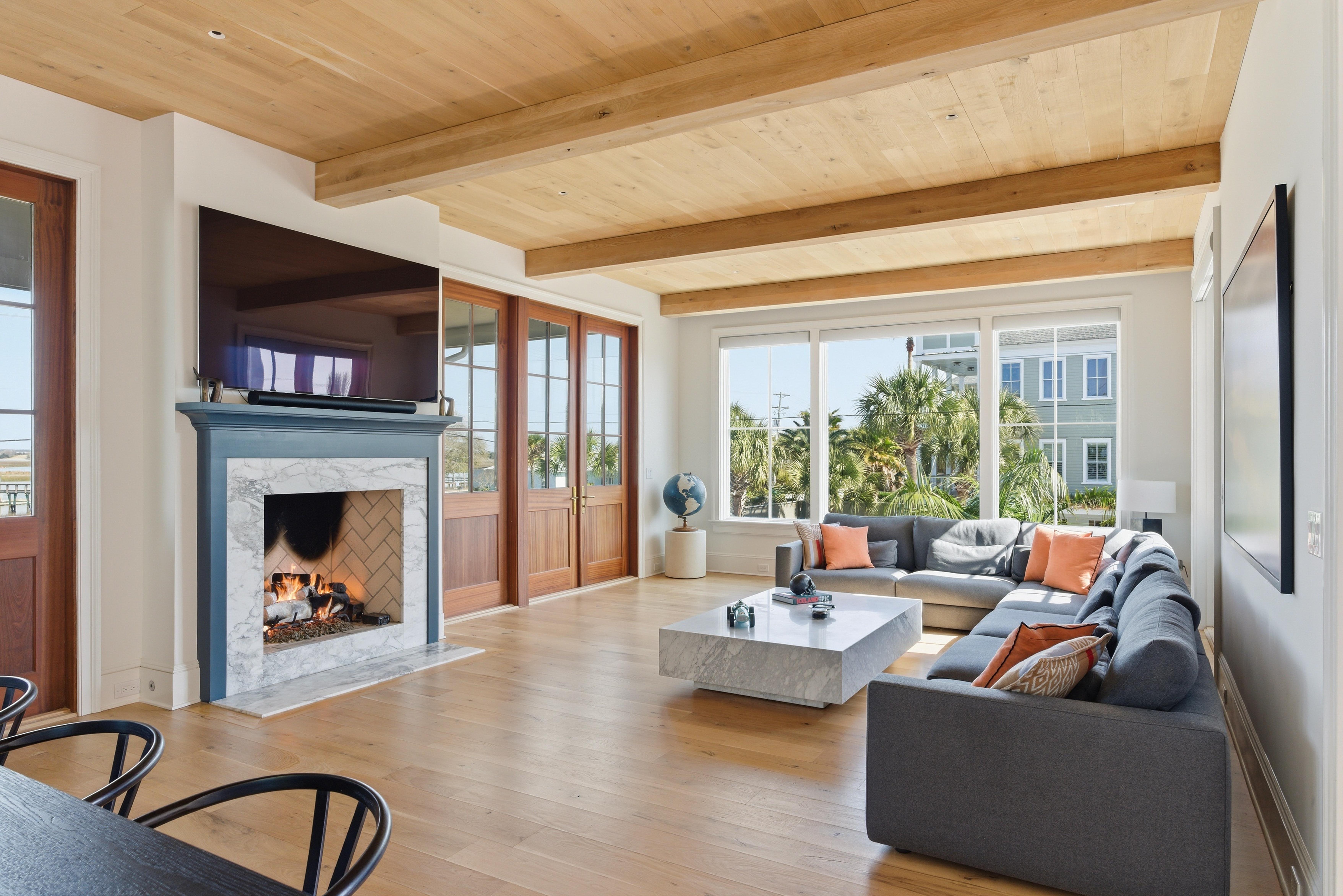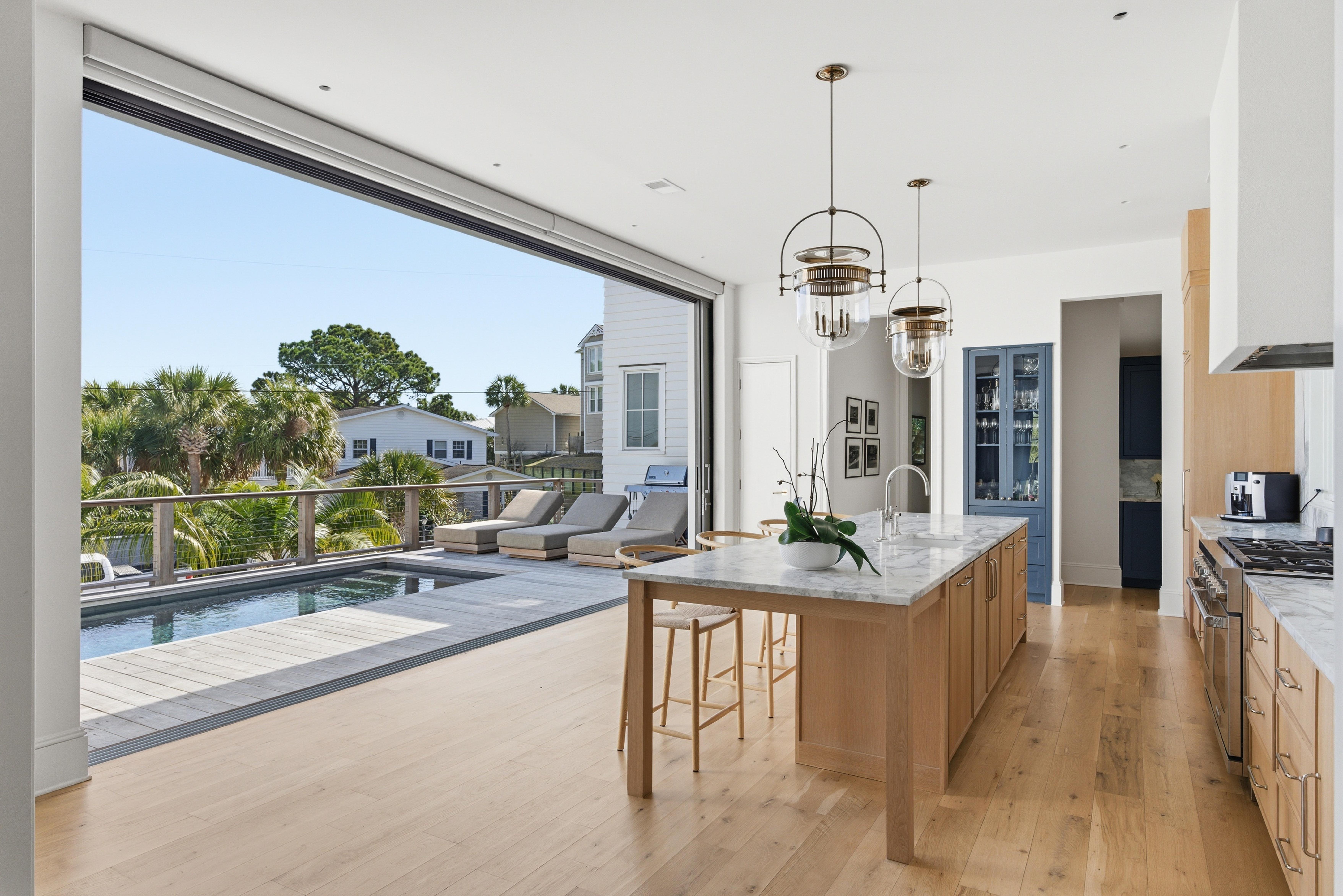 A rare opportunity on Isle of Palms, this newly constructed coastal residence pairs refined design with exceptional craftsmanship and sweeping views across the Intracoastal Waterway. The main living level is designed for seamless indoor and outdoor living. A dramatic wall of retractable glass doors opens fully to the elevated pool terrace, creating a natural extension of the kitchen and living spaces. The terrace includes a lounge area and pool bar/prep space for grilling. The chef's kitchen features custom cabinetry, marble surfaces, a generous island with seating, professional-grade appliances, and a butler's pantry.