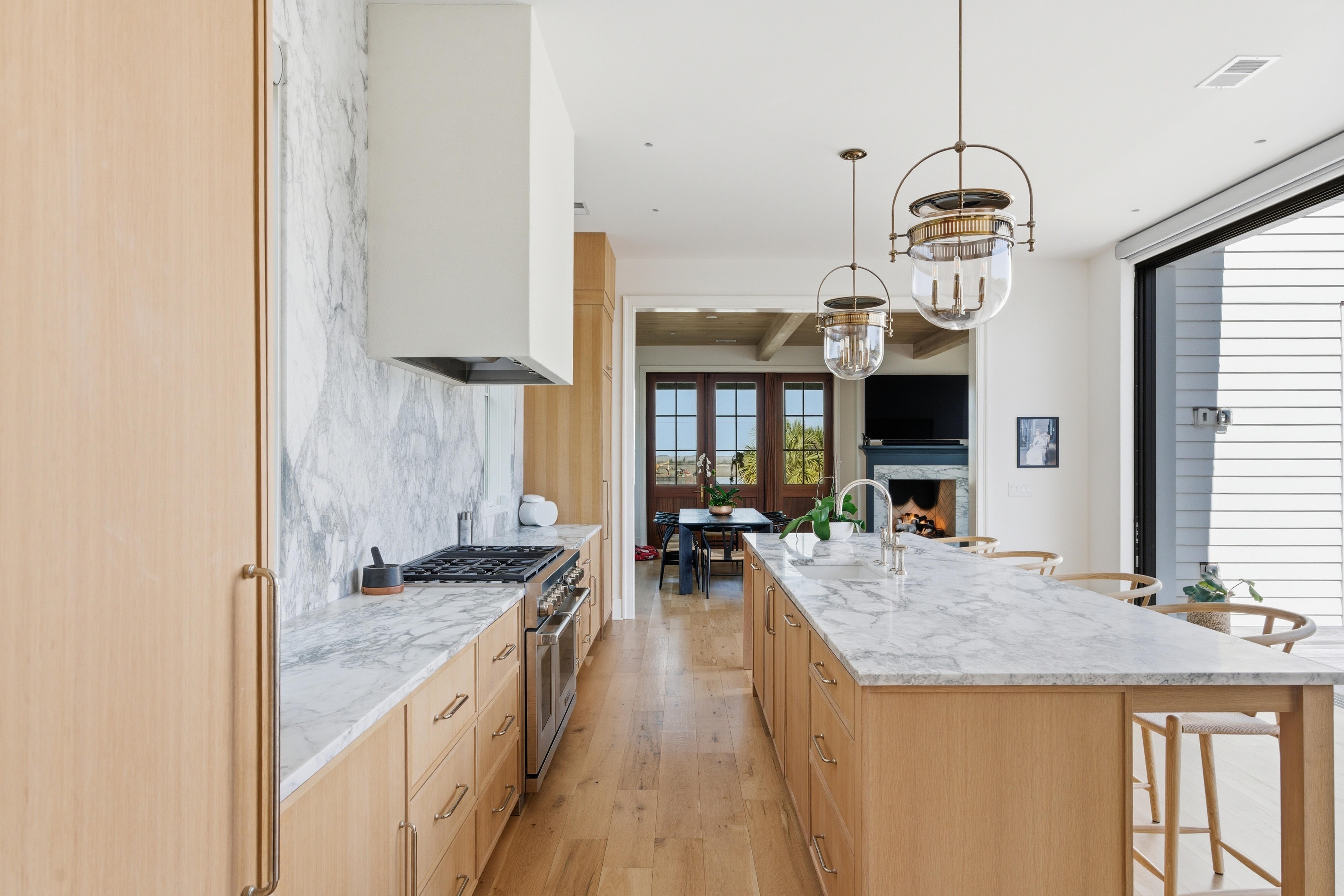 The living room, highlighted by a white oak wood-paneled ceiling and Italian marble fireplace, invites natural light through expansive windows and opens directly to the covered porch overlooking the water. The porch captures coastal breezes and offers year-round outdoor living with a built-in fireplace. The dining area sits adjacent to the living room and kitchen in an open-concept layout ideal for entertaining. A convenient elevator provides access to the main living level from the garage.