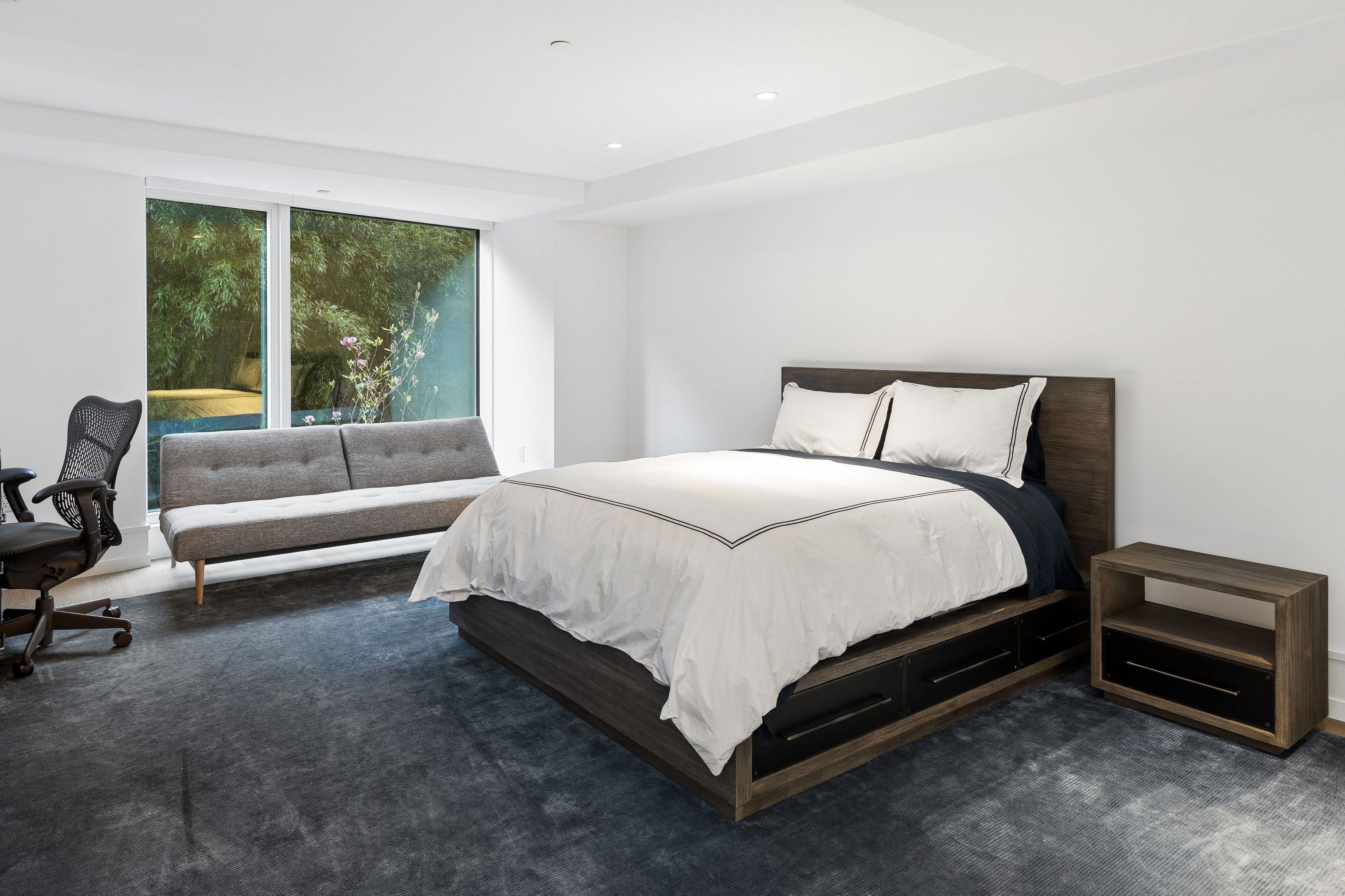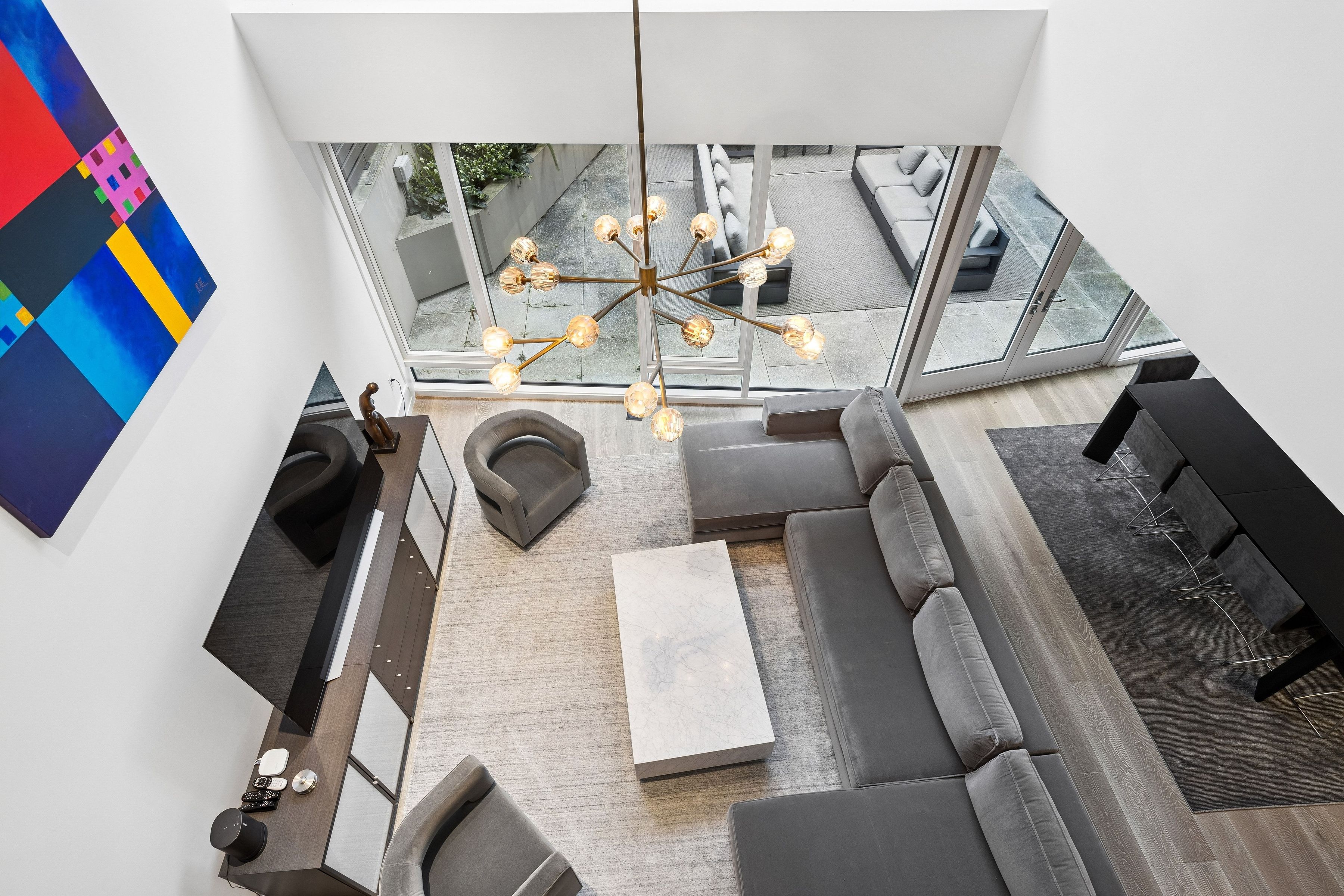 The main level is defined by volume with double-height ceilings and walls of glass framing the 845sq.ft. outdoor terrace. A beautifully appointed kitchen—featuring Arclinea cabinetry, marble surfaces, and Gaggenau appliances—anchors the space, flowing seamlessly into informal living and dining areas. French doors open to the terrace offering a quiet extension of the home for both everyday living and entertaining.