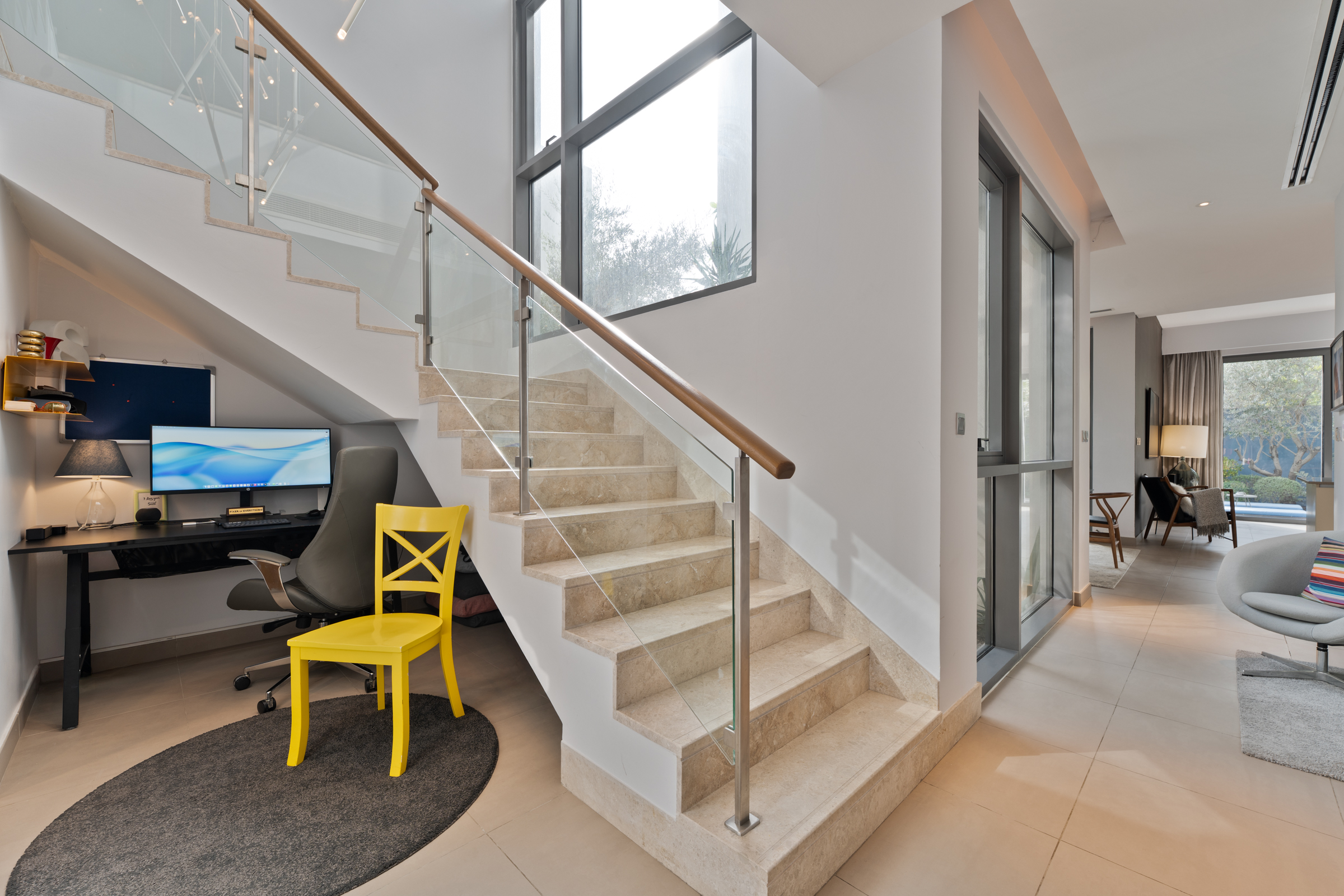 Inside, the living spaces feature a fluid flow, with the open-concept reception sharing the space with a well-appointed kitchen with a breakfast counter, and a dining room — arranged in a separate pocket. This area is amply-lit by floor-to-ceiling windows that also deliver a seamless indoor-outdoor connection with the manicured backyard. A study rests beneath the stairs.