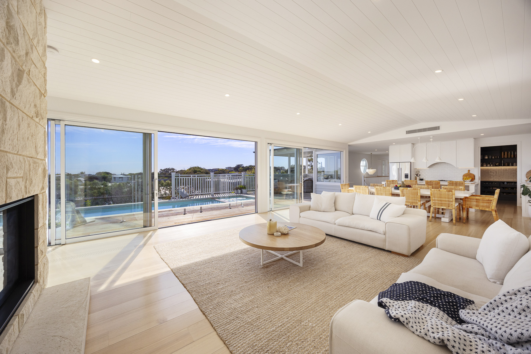 The main living level hosts an expansive open-plan domain with a superbly appointed kitchen and butler’s pantry, complete with marble benchtops and premium Miele appliances. Large sliding glass doors dissolve the boundary between inside and out, opening to a private second-storey terrace with pool, spa, outdoor kitchen and dining — all framed by outlooks across Port Phillip Bay toward the Melbourne skyline.