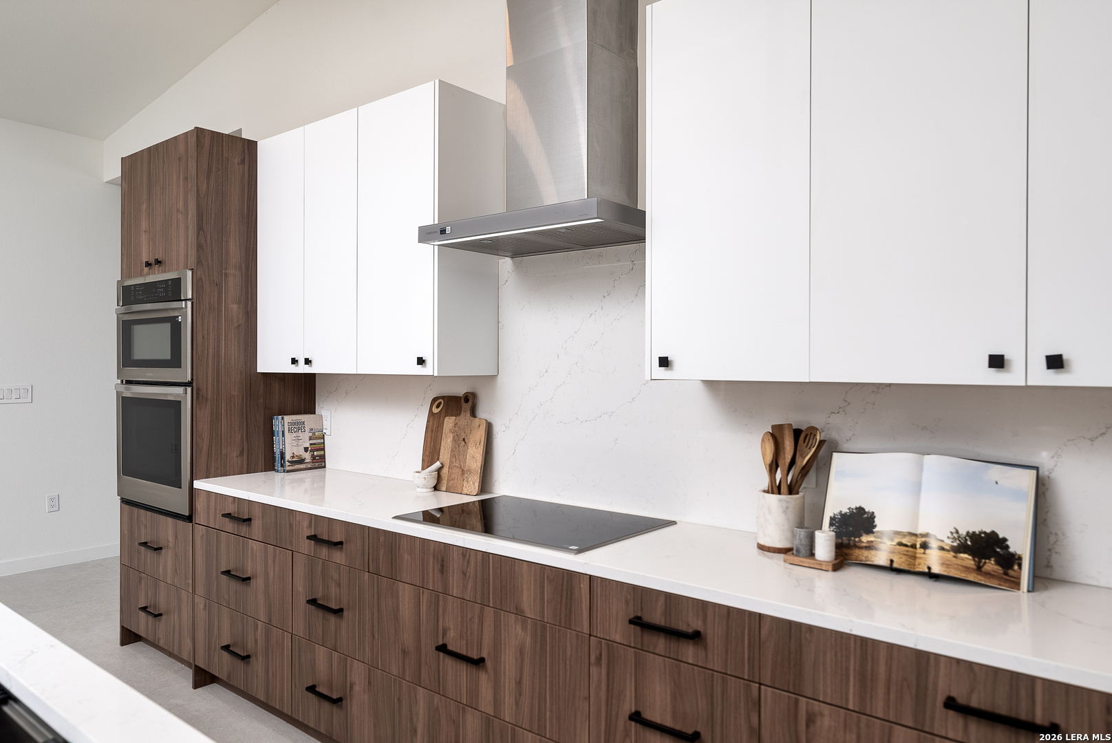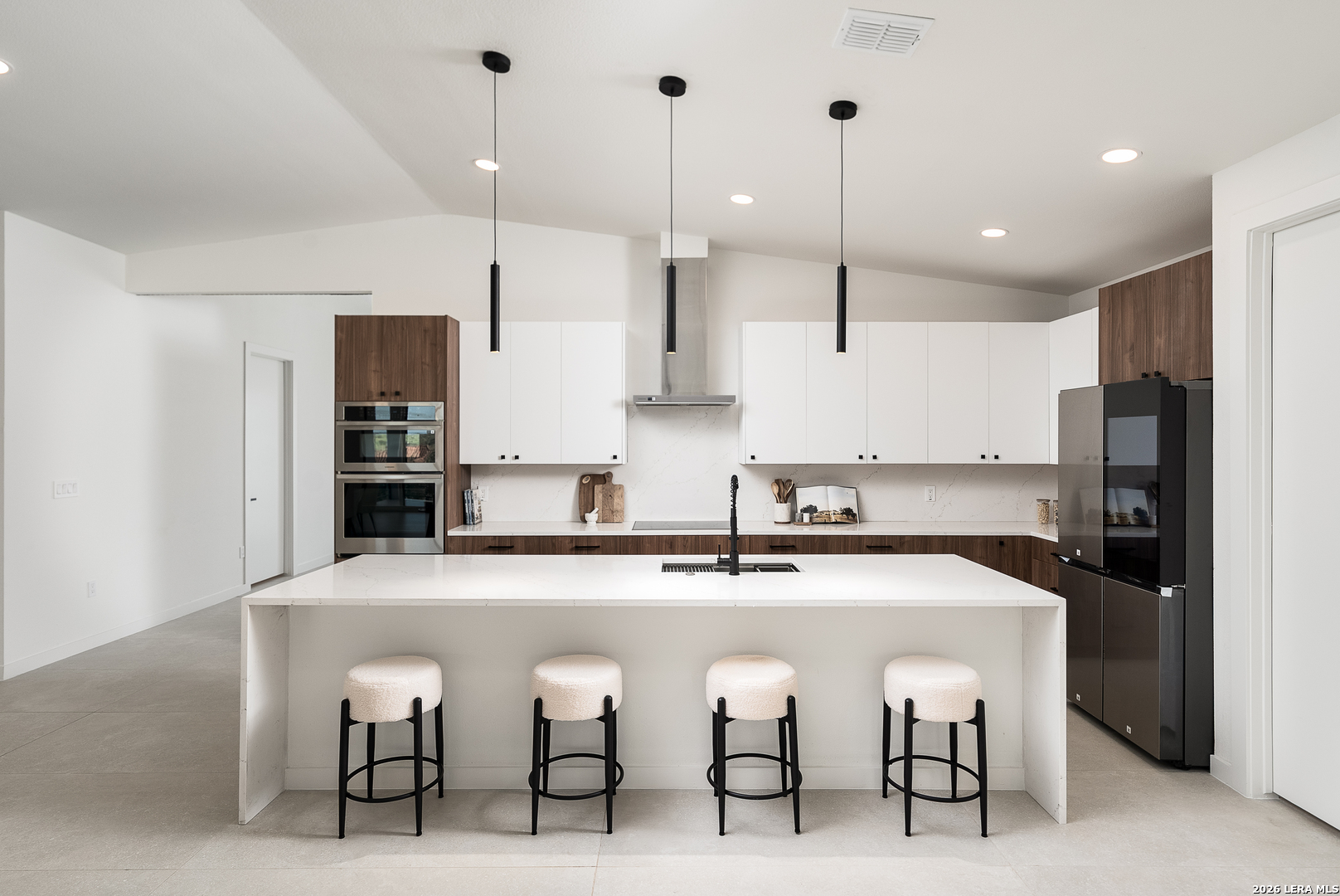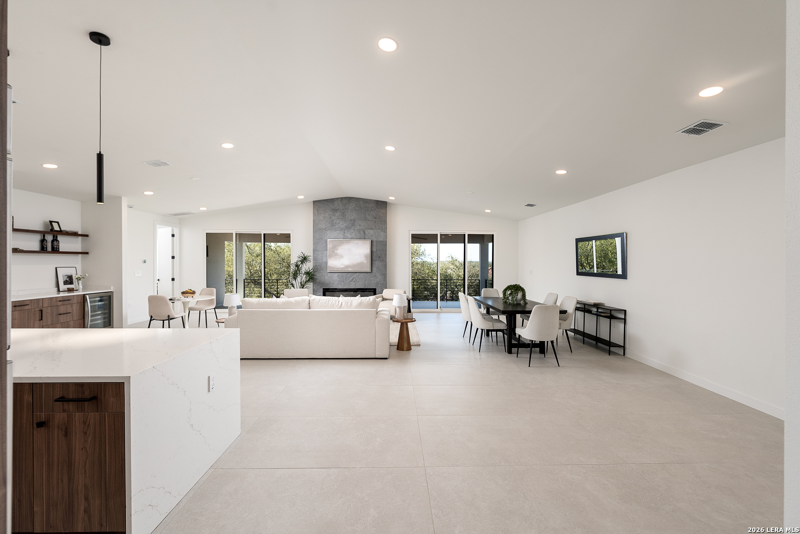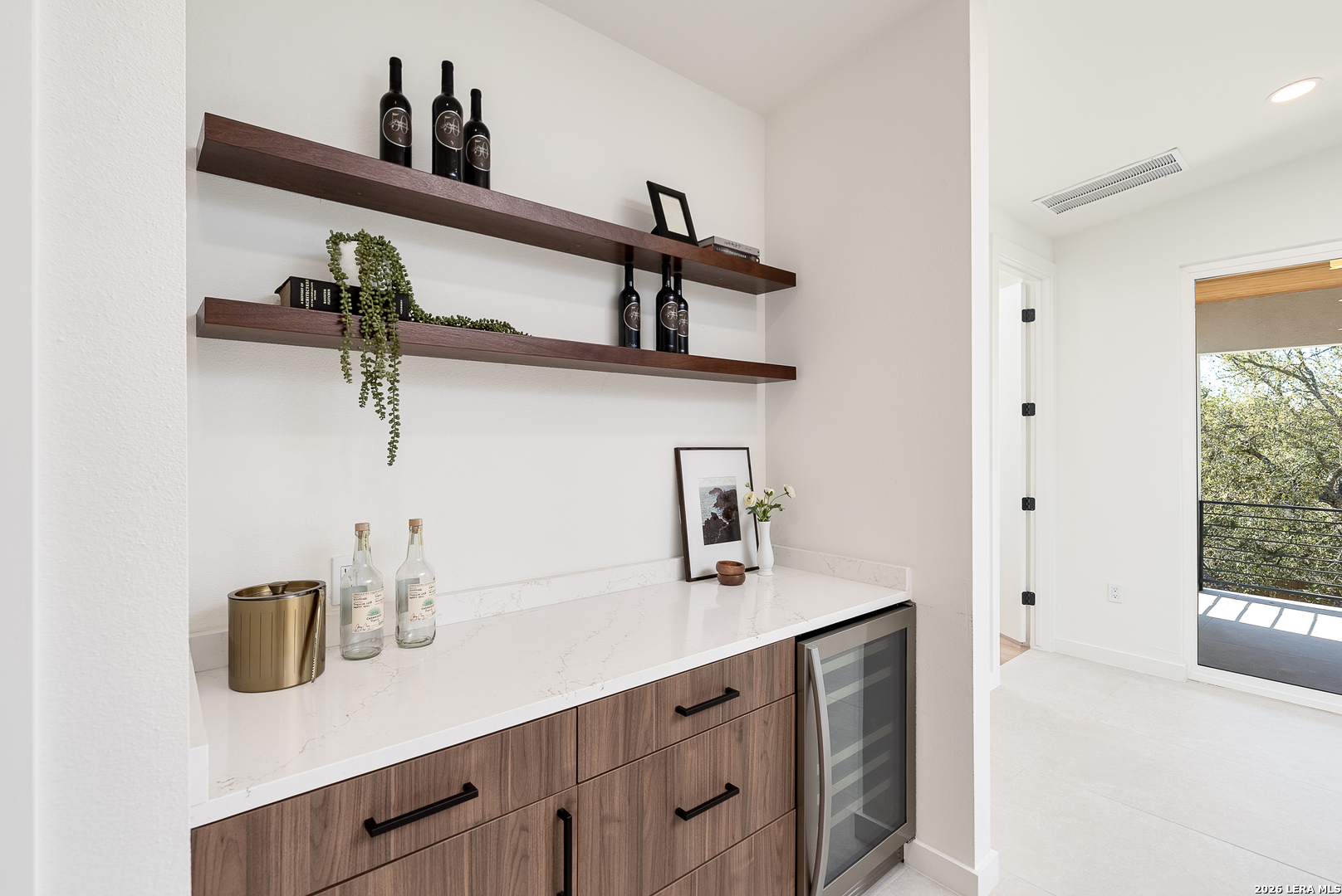 OPEN HOUSE SATURDAY MARCH 28TH 12:00PM -3:00PM // Set on nearly half an acre beneath a canopy of mature oaks in the coveted Timberwood Park community, this striking new construction residence is a true expression of modern luxury and architectural elegance. Clean lines, sleek finishes, and thoughtfully curated design elements come together to create a home that feels both sophisticated and effortlessly livable. Spanning approximately 3,029 square feet, this 4-bedroom, 4 full bath, and 1 half bath home is designed to impress at every turn. From the moment you enter, you're welcomed by expansive interiors, soaring ceilings, and breathtaking long-range scenic views that unfold throughout the home-seamlessly blending indoor and outdoor living. At the heart of the home, the chef-inspired kitchen is a true showpiece, featuring contemporary custom cabinetry, stunning quartz countertops with a dramatic waterfall- edge island, and a full suite of stainless steel Samsung appliances, including a built-in oven, cooktop, dishwasher, and refrigerator. Designed for both everyday living and elevated entertaining, the space flows beautifully into two distinct dining areas and a stylish dry bar complete with a wine fridge. The primary suite is a private retreat, offering spa-like indulgence with a luxurious walk-in shower, a sculptural floating soaking tub, and dual vanities-creating a serene escape framed by peaceful natural views. Each additional bedroom is generously sized and complete with its own walk-in closet, ensuring comfort and privacy for all. Throughout the home, a refined palette of ceramic tile and wood-like flooring (with no carpet) enhances both durability and design continuity. Additional highlights includes two HVAC systems for optimal efficiency, an indoor utility room with sink, a spacious walk-in pantry with refrigerator setup, and dedicated walk-in storage off the garage. Designed for seamless indoor-outdoor living, oversized sliding glass doors open to a covered patio with its own outdoor fireplace-perfect for enjoying tranquil evenings overlooking the expansive backyard and treetop vistas. The property offers ample space for future customization, all while maintaining privacy and serenity. A spacious two-car garage and long, flat driveway provide both convenience and curb appeal, completing this exceptional offering. This is more than a home-it's a modern sanctuary where luxury, design, and nature exist in perfect harmony.
