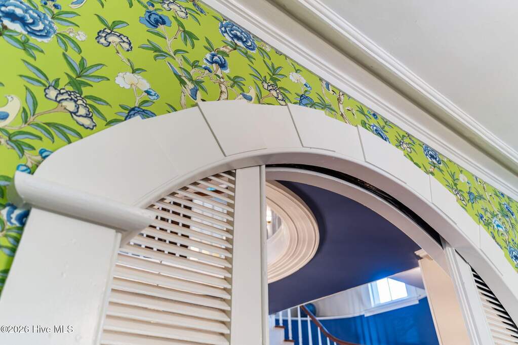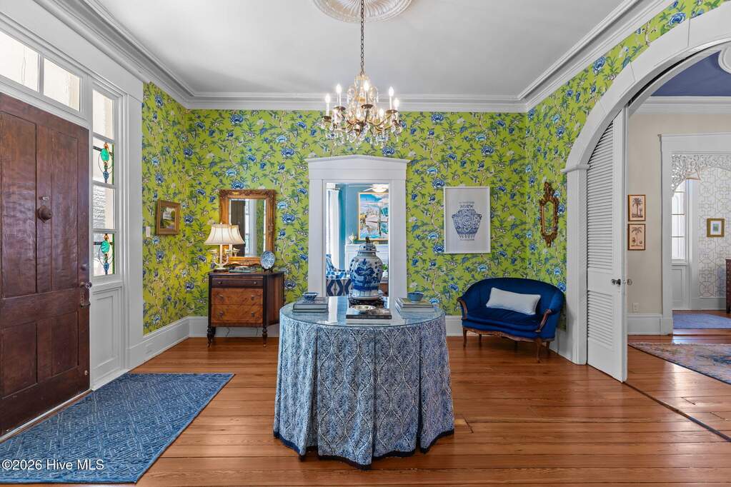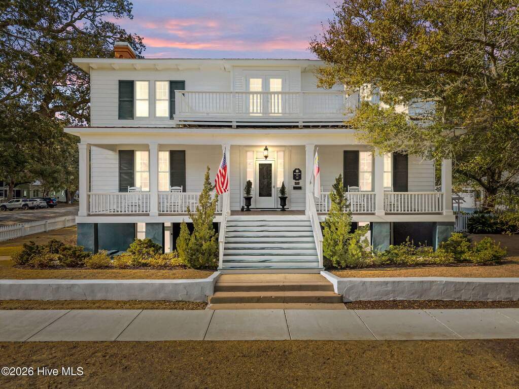 Along Southport's iconic East Bay Street with elevated views of the Cape Fear River, this private residence historically known as The Brunswick Inn offers a rare high-bluff setting with sweeping water views and walkability to the waterfront, dining, and shops. Once a summer retreat for North Carolina Governors, your home has been fully renovated and restored to combine historic architecture with modern luxury. Spanning approximately 6,025 SF across three finished levels, including a 1,645 SF finished lower level, the residence features 6 bedrooms and 5.5 baths with heart pine floors, intricate moldings, signature Southport bow detailing, and soaring ceilings that enhance natural light throughout. A defining architectural feature, the central rotunda creates a rare circular floor plan and sense of arrival, complemented by a prominent staircase and wide halls that reinforce scale and flow. Formal living and dining rooms are anchored by fireplaces and statement lighting, offering true entertaining spaces. The fully remodeled kitchen is thoughtfully executed with high-end appliances and finishes that complement the home's historic character without overpowering it. Bedrooms are individually styled, many with fireplaces, strong natural light, and water views, supporting both residential living and hospitality use. The front porch is positioned to capture direct river views and coastal breezes, creating a true indoor-outdoor lifestyle. Grounds are framed by mature oaks and include an irrigation system, pond with water feature, French drains, river rock detailing, decorative brick parking, and new picket and privacy fencing. Exterior updates include Low-E storm windows and glass front door, updated chimney caps and flashings, rebuilt side porch with metal roof, and a 2025 rebuilt upper balcony with new French doors and rear stoop roof replacement. Interior improvements include a full kitchen remodel, complete renovation of all bathrooms, refinished hardwoods with antique board replacement, updated lighting throughout, and enhanced pantry and laundry spaces. The fully finished lower level, with multiple private entrances, offers flexibility for guest suites, extended living, or income-producing use. Major systems include a Generac whole-house generator, Rinnai tankless water heater, Halo whole-house filtration system, nine Mitsubishi mini-split systems for individualized climate control, new HVAC ductwork with attic insulation, updated electrical with increased amperage, new natural gas line, and full sewer replacement. Some furnishings are negotiable, offering a potential turnkey opportunity.