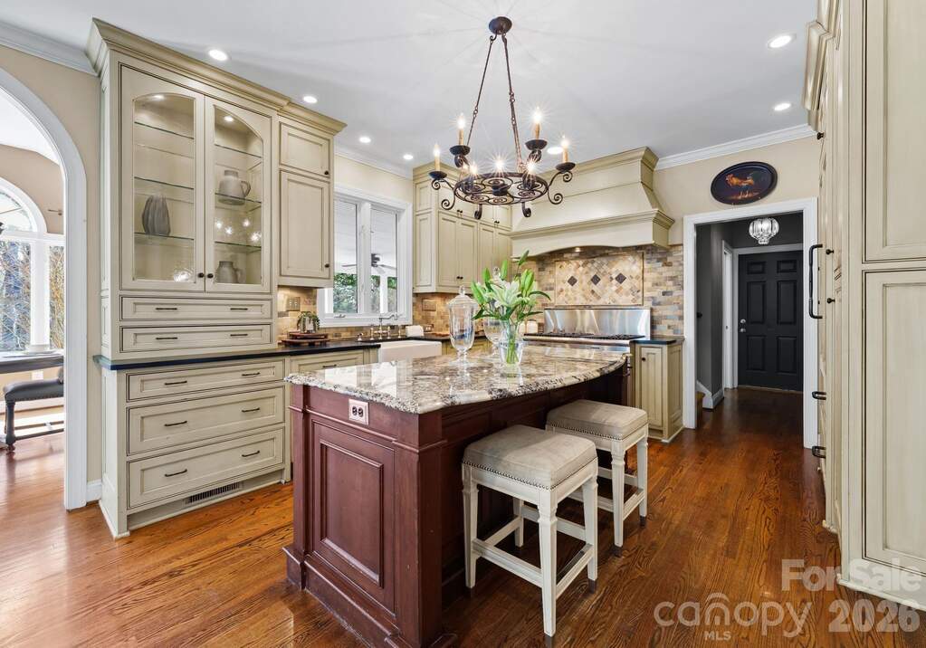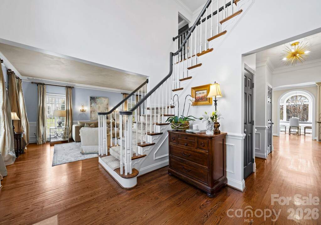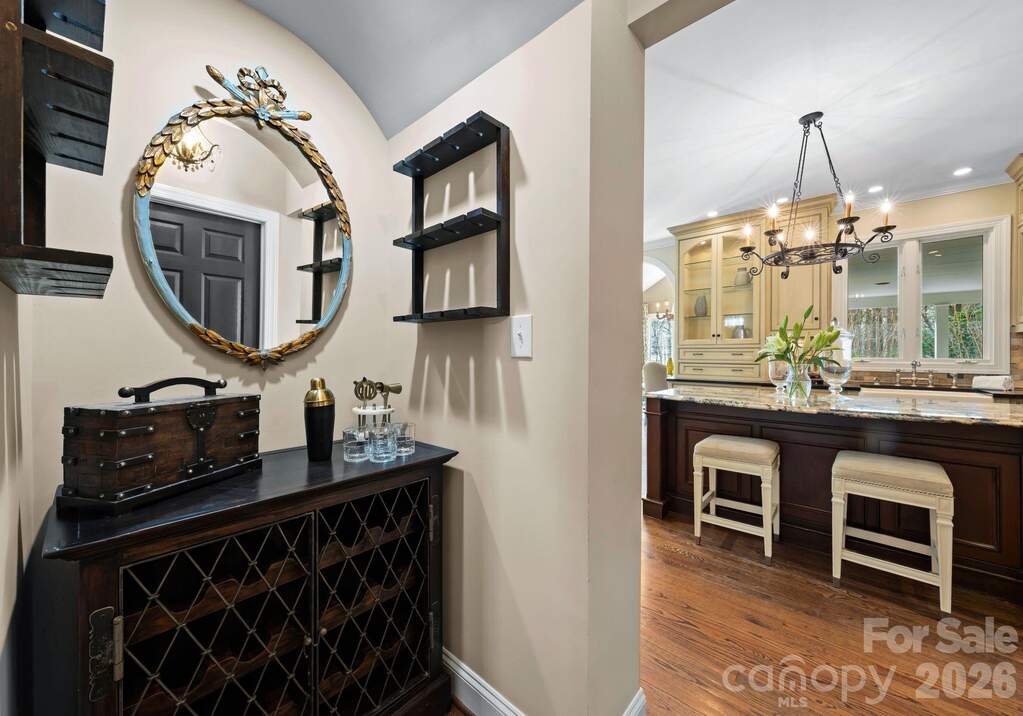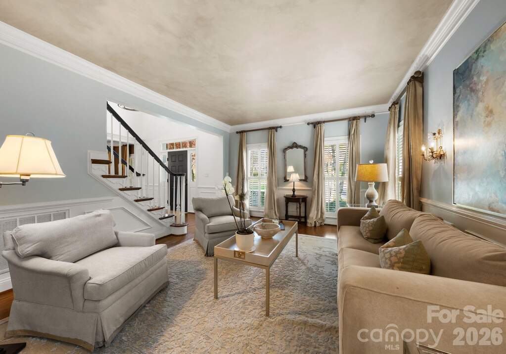 Tucked away on a picturesque corner lot in the highly desirable Preserve at Belingrath community, this elegant residence offers a refined blend of timeless architecture, updated finishes, and expansive living spaces. Spanning over 5,600 square feet across three beautifully finished levels, the home showcases crown molding throughout, designer lighting, and thoughtfully curated architectural details. A grand two-story foyer creates a striking first impression, opening to warm, inviting spaces including a formal dining room and a sophisticated sitting room. The main living area is centered around a beautiful brick fireplace, creating a natural gathering space. The kitchen serves as the heart of the home, featuring floor-to-ceiling custom cabinetry, an oversized island, premium appliances, under-cabinet lighting, and a well-appointed butler's pantry with wine display and walk-in storage. The adjacent breakfast area and living spaces flow seamlessly to the screened porch and outdoor patio for effortless indoor-outdoor living. Upstairs, the primary suite offers a private retreat with a tray ceiling, custom built-ins, dual walk-in closets, and a spacious bath with dual vanities and an expansive tiled shower. Three additional bedrooms, including a guest suite with an ensuite bath, provide flexibility, while a versatile bonus room is ideal for a media room, playroom, fitness space, or home office. The finished lower level is a standout, offering an exceptional extension of living and entertaining space. It features multiple gathering areas, a full bar with cabinetry and refrigeration, built-in shelving, and a dedicated entertainment area, along with a private guest bedroom, full bathroom, and flexible space for a home office, gym, or lounge. With direct access to the backyard, this level seamlessly connects indoor and outdoor living. Outdoor living is equally impressive, with a screened porch, multiple patios, and a beautifully landscaped, fully fenced backyard. The tiered yard design, mature trees, and stone accents create a sense of privacy and character, while the included playset with slides and swings adds a functional and inviting space for recreation. Additional highlights include a circular driveway addition, a two-car garage with built-in storage and a ChargePoint EV charger, and well-designed drop zone and laundry areas. Recent upgrades include extensively refreshed paint, new lighting, updated appliances, and a tankless water heater. Located in a welcoming, established neighborhood known for its friendly atmosphere and tree-lined streets, this home offers a true sense of community. Just minutes from SouthPark, enjoy premier shopping, dining, and everyday conveniences, along with easy access to major roadways, Uptown Charlotte, top-rated public and private schools, and nearby parks.