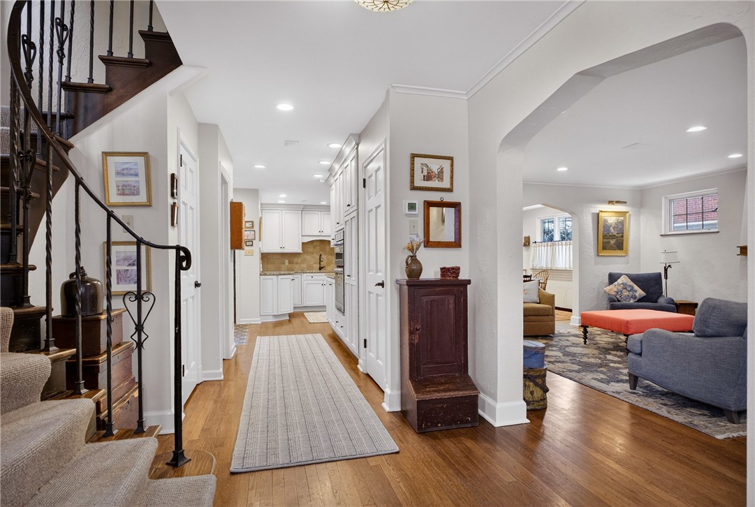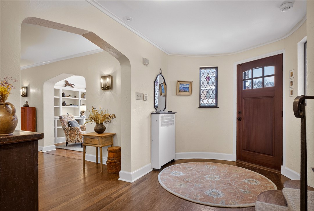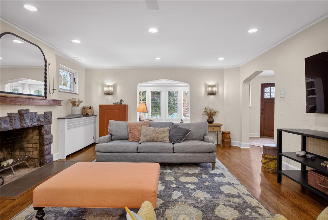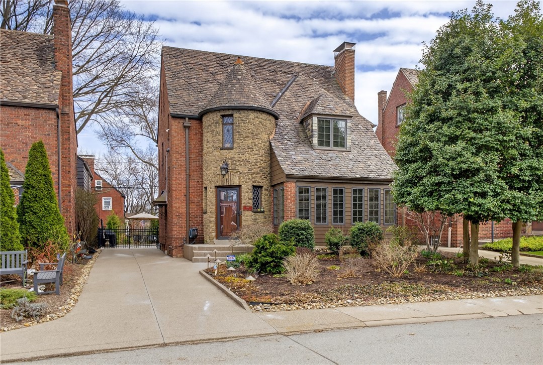 Nestled on a private cul-de-sac in the heart of Point Breeze, this updated 4-bedroom, 3.5-bath brick and stone home blends classic architecture with modern functionality in one of Pittsburgh's most sought-after neighborhoods. A distinctive turret-style entry introduces timeless details including a curved staircase with wrought-iron banister, original moldings, arched openings, and stained glass accents. The main level offers excellent flow for everyday living and entertaining, featuring a spacious living room, sunlit front sitting room (ideal for a home office), and a centrally located, updated kitchen with granite countertops, custom cabinetry, stainless steel appliances, and direct connection to the dining area with built-in storage. Hardwood floors, updated lighting, and integrated Bose speakers enhance the home's comfort and livability. The second floor includes three bedrooms, highlighted by a generous primary suite with updated en suite bath and sitting area. A full hall bath and flexible secondary bedroom layout provide additional functionality. The third floor offers a private suite with bedroom, walk-in closet, and full bath - ideal for guests, office, or bonus space. Outdoor living features a brick patio, built-in fire pit, mature landscaping, and a rare, level yard for the neighborhood. A two-car attached garage adds convenience. Located minutes from Frick Park, Mellon Park, and The Frick Pittsburgh, with easy access to Shadyside, Squirrel Hill, Bakery Square, major hospitals, universities, and downtown.