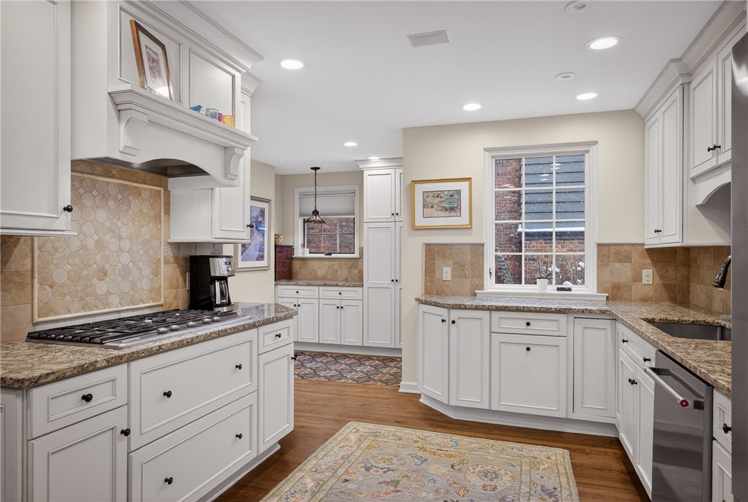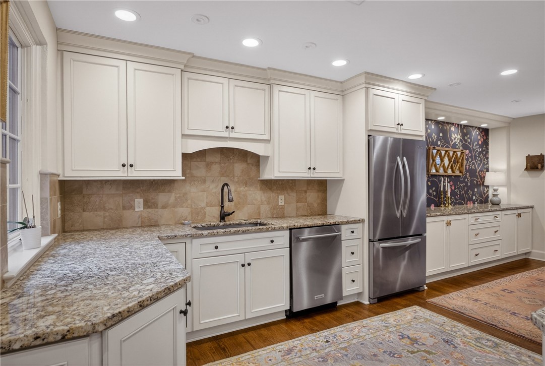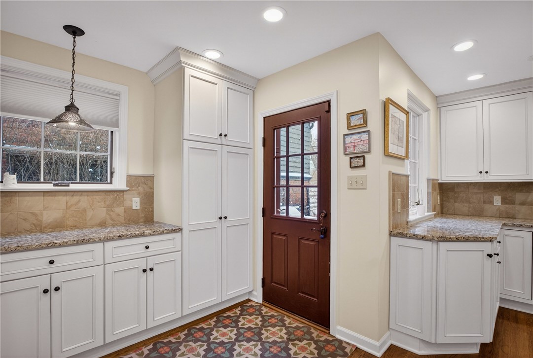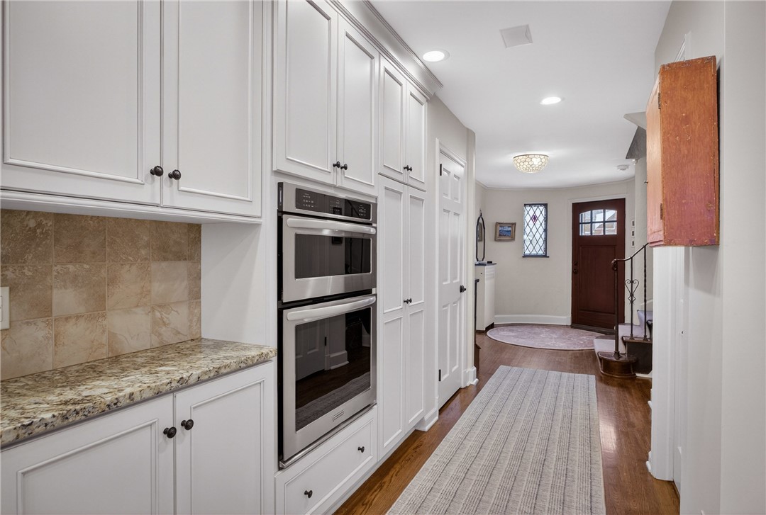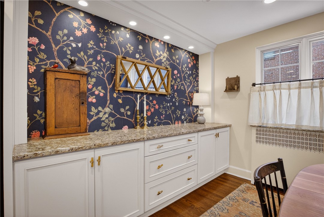 Nestled on a private cul-de-sac in the heart of Point Breeze, this updated 4-bedroom, 3.5-bath brick and stone home blends classic architecture with modern functionality in one of Pittsburgh's most sought-after neighborhoods. A distinctive turret-style entry introduces timeless details including a curved staircase with wrought-iron banister, original moldings, arched openings, and stained glass accents. The main level offers excellent flow for everyday living and entertaining, featuring a spacious living room, sunlit front sitting room (ideal for a home office), and a centrally located, updated kitchen with granite countertops, custom cabinetry, stainless steel appliances, and direct connection to the dining area with built-in storage. Hardwood floors, updated lighting, and integrated Bose speakers enhance the home's comfort and livability. The second floor includes three bedrooms, highlighted by a generous primary suite with updated en suite bath and sitting area. A full hall bath and flexible secondary bedroom layout provide additional functionality. The third floor offers a private suite with bedroom, walk-in closet, and full bath - ideal for guests, office, or bonus space. Outdoor living features a brick patio, built-in fire pit, mature landscaping, and a rare, level yard for the neighborhood. A two-car attached garage adds convenience. Located minutes from Frick Park, Mellon Park, and The Frick Pittsburgh, with easy access to Shadyside, Squirrel Hill, Bakery Square, major hospitals, universities, and downtown.