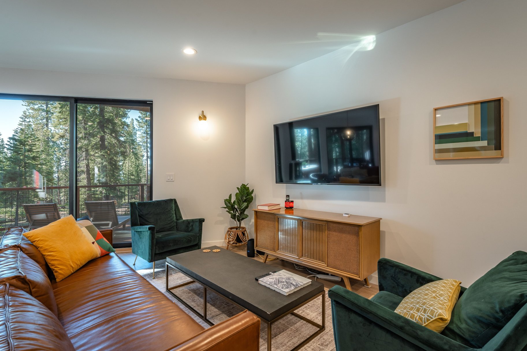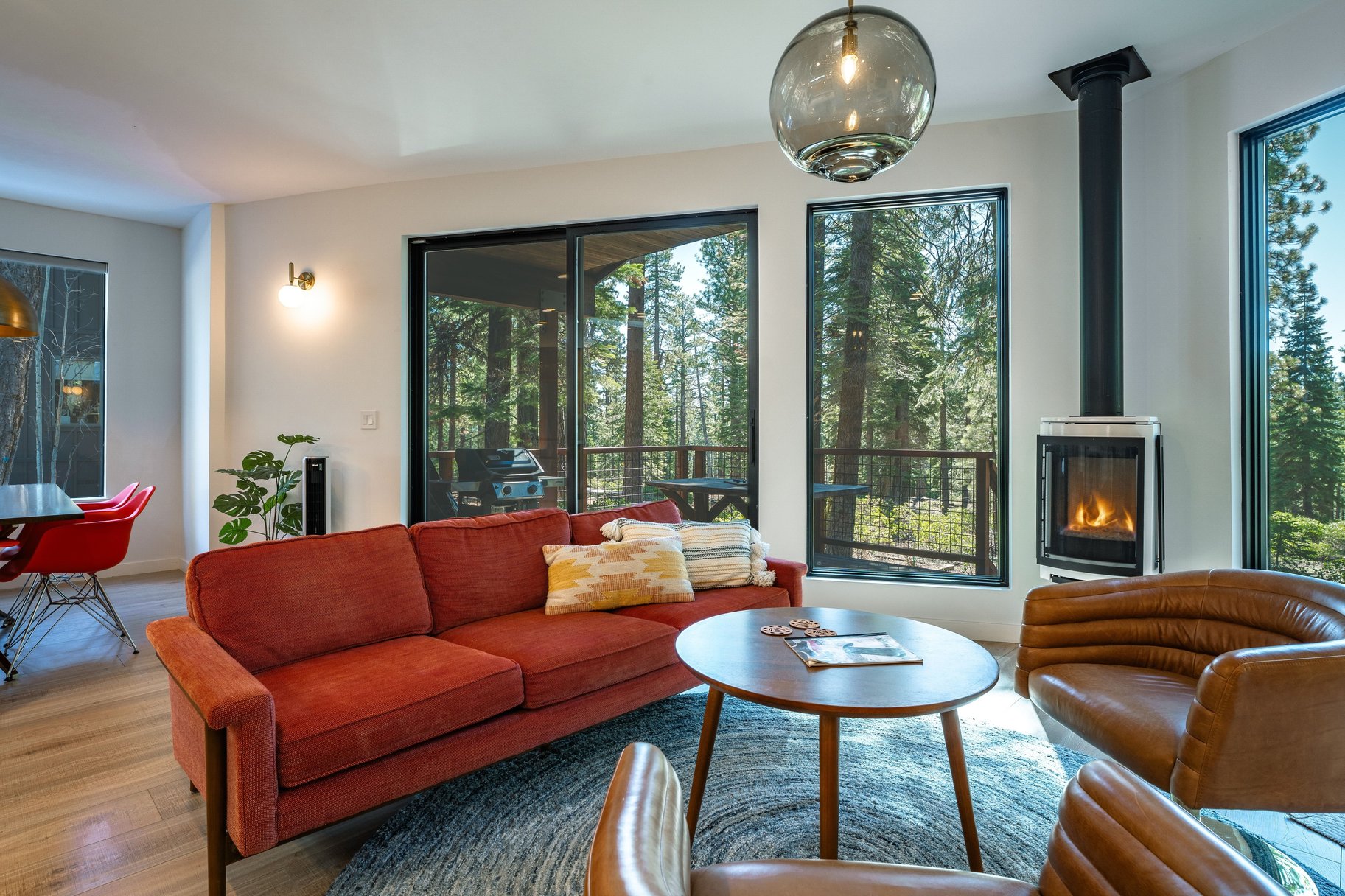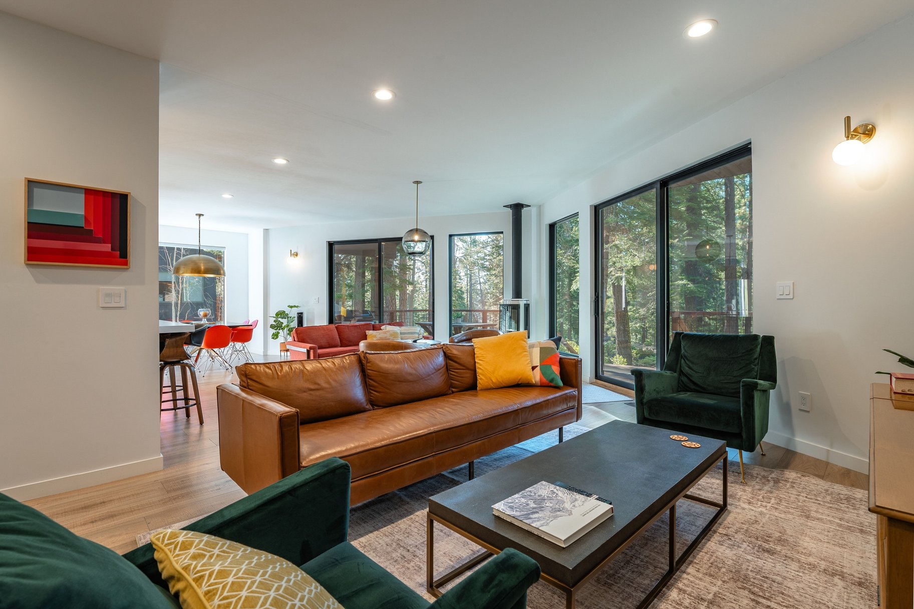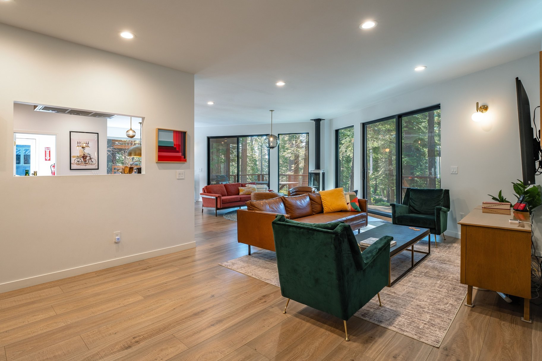 At the heart of the home, an open-concept great room with walls of glass brings the outdoors in. Creating a seamless flow to the backyard and capturing tranquil forest views, the great room is accented by an abundant use of glass, European lighting, and two sitting areas around a modern fireplace. The chef’s kitchen is equally impressive, equipped with a gas range and casual bar seating—perfect for both everyday living and entertaining. A spacious back deck and outdoor hot tub only add to the home's special features. Additional functional highlights include a roomy entrance with a drop zone for gear with heated floors, and access to the two-car garage, essential for Tahoe living. Offered turnkey and well-equipped, this house is ready to be enjoyed immediately.