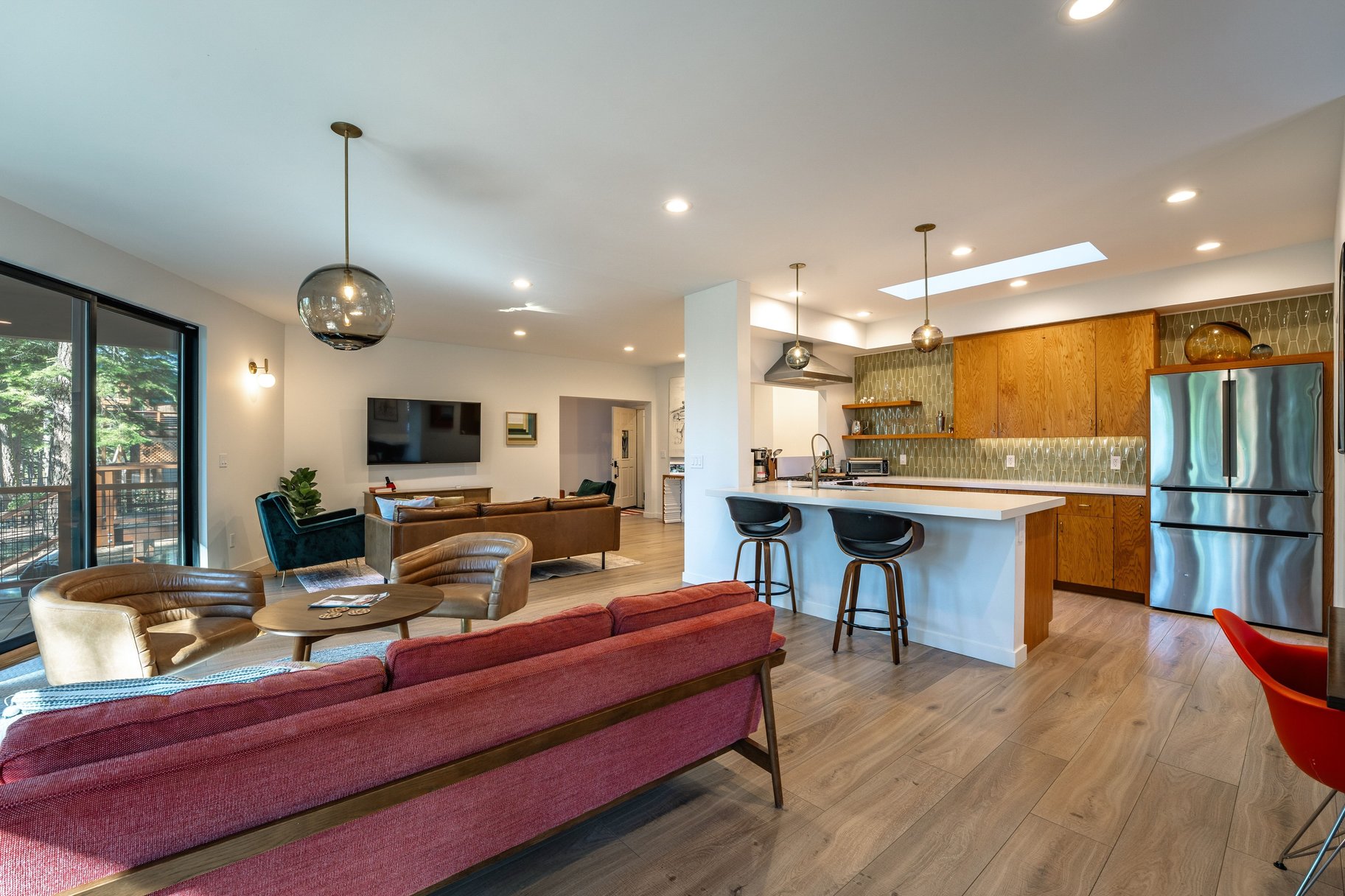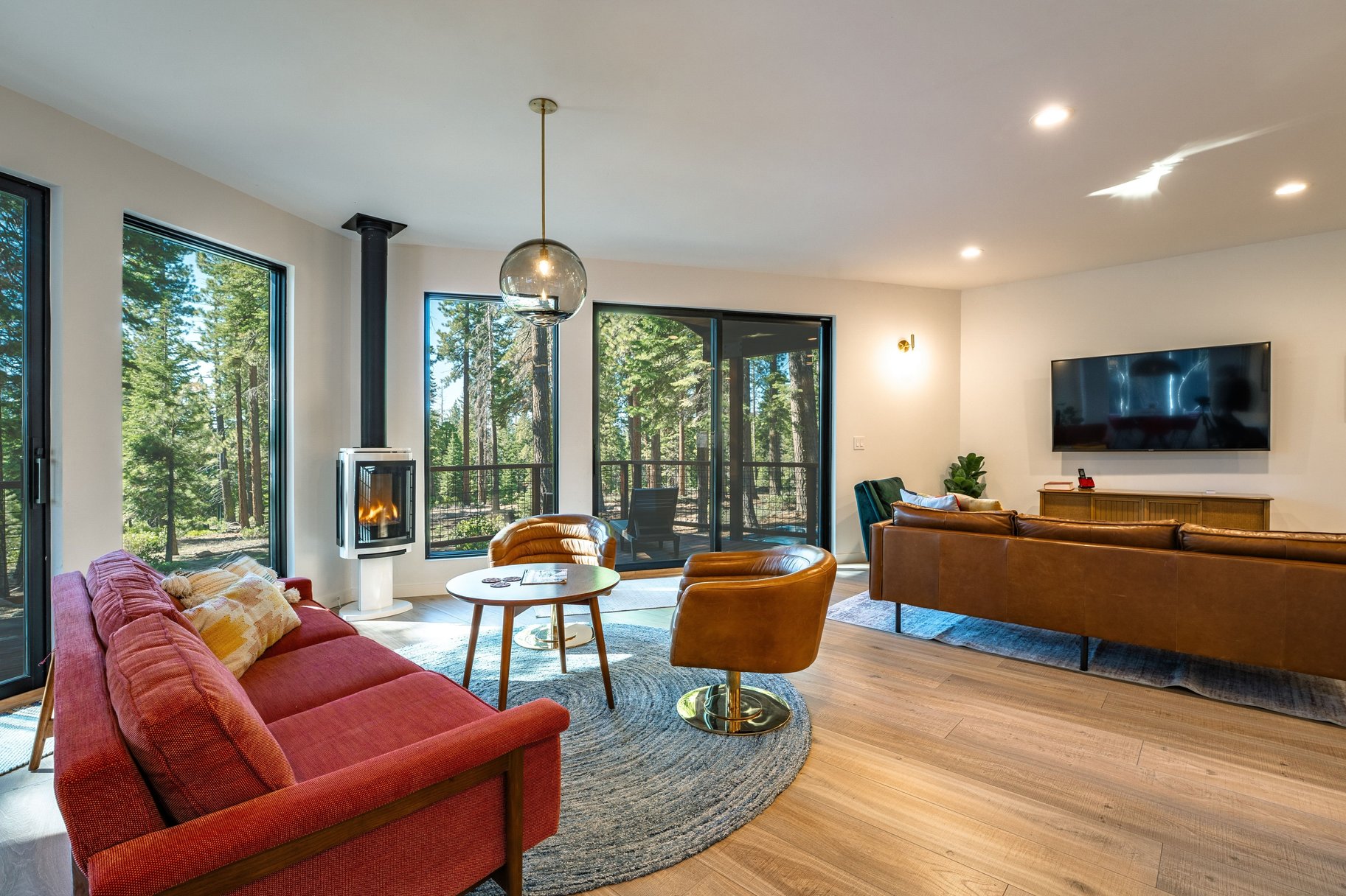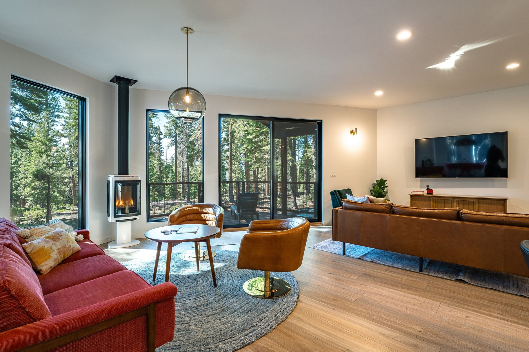 At the heart of the home, an open-concept great room with walls of glass brings the outdoors in. Creating a seamless flow to the backyard and capturing tranquil forest views, the great room is accented by an abundant use of glass, European lighting, and two sitting areas around a modern fireplace. The chef’s kitchen is equally impressive, equipped with a gas range and casual bar seating—perfect for both everyday living and entertaining. A spacious back deck and outdoor hot tub only add to the home's special features. Additional functional highlights include a roomy entrance with a drop zone for gear with heated floors, and access to the two-car garage, essential for Tahoe living. Offered turnkey and well-equipped, this house is ready to be enjoyed immediately.