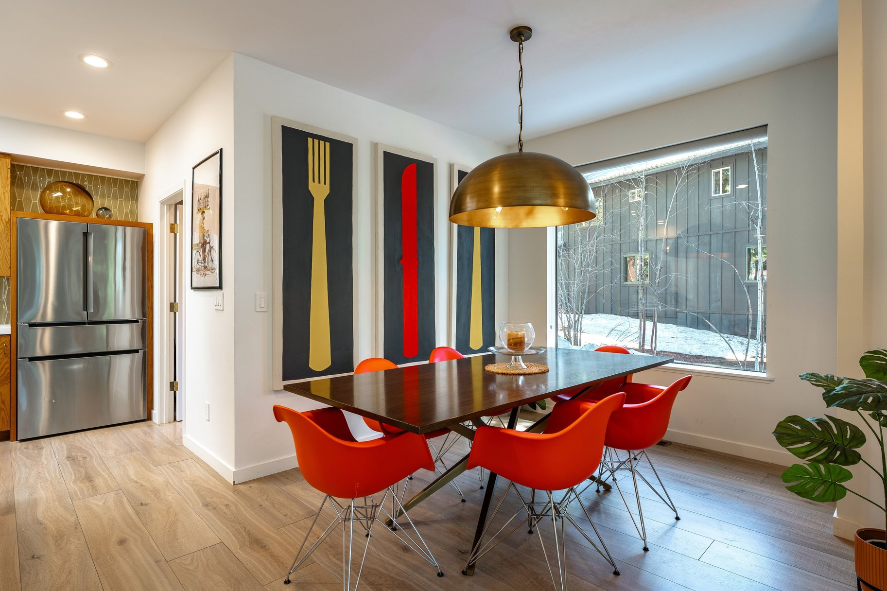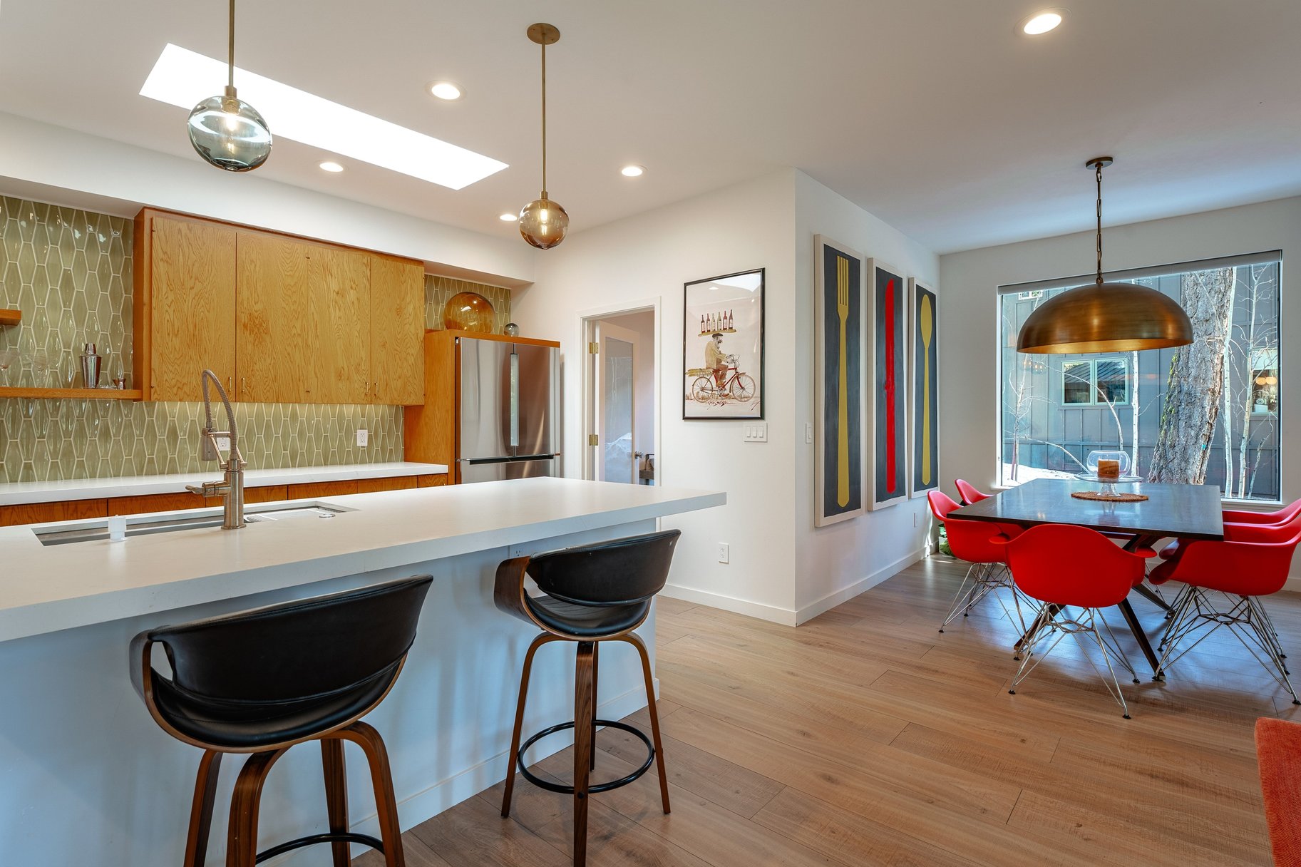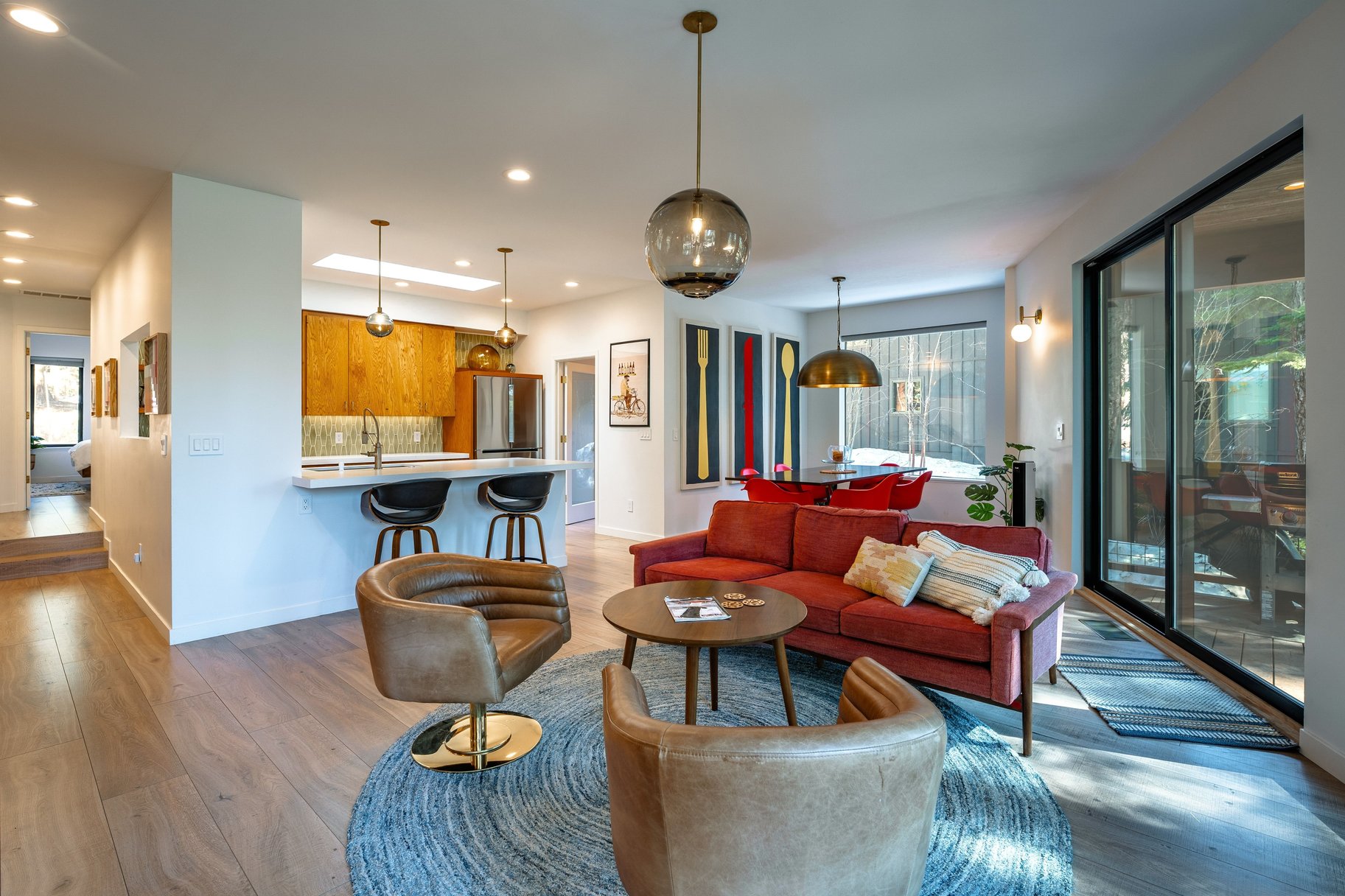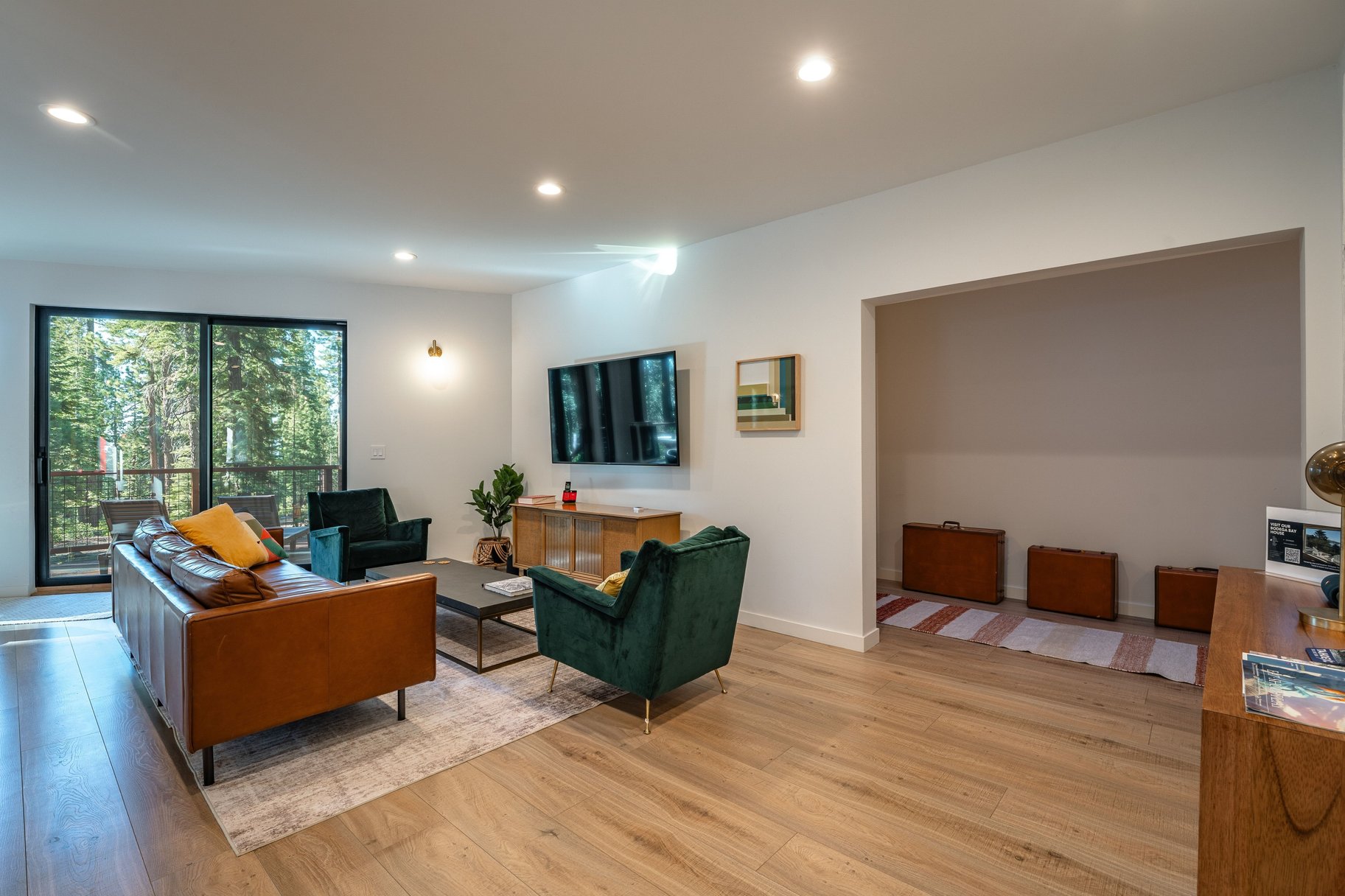 At the heart of the home, an open-concept great room with walls of glass brings the outdoors in. Creating a seamless flow to the backyard and capturing tranquil forest views, the great room is accented by an abundant use of glass, European lighting, and two sitting areas around a modern fireplace. The chef’s kitchen is equally impressive, equipped with a gas range and casual bar seating—perfect for both everyday living and entertaining. A spacious back deck and outdoor hot tub only add to the home's special features. Additional functional highlights include a roomy entrance with a drop zone for gear with heated floors, and access to the two-car garage, essential for Tahoe living. Offered turnkey and well-equipped, this house is ready to be enjoyed immediately.