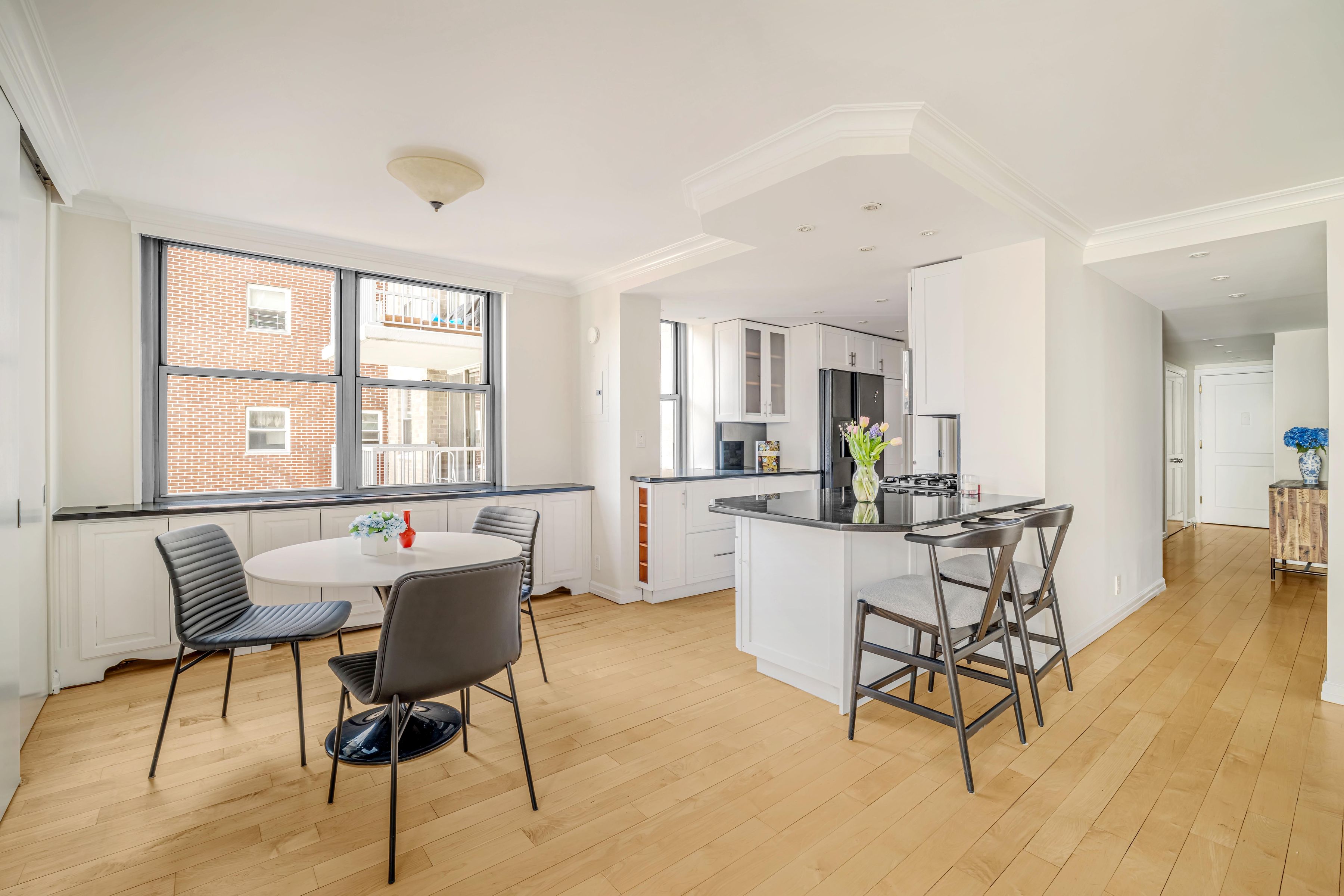 This rarely available and renovated junior-4, H-line at 444 East 86th Street #14H is currently configured as a spacious one-bedroom with a den (plus a dedicated dining area), but it converts easily into a true two-bedroom layout—perfect for those seeking versatility. The generous layout features beautiful hardwood floors throughout and exceptional closet space everywhere. An inviting entrance hall with two large closets opens to a bright, generously proportioned north-facing living room and separate dining area. The open, windowed eat-in kitchen is a highlight—flooded with natural light, boasting ample storage, and featuring a convenient breakfast bar ideal for casual meals or entertaining. A versatile den (easily used as a second bedroom) complements the oversized primary bedroom, which enjoys excellent natural light, an ensuite full bathroom, and two generous closets. Enjoy a beautiful private balcony—a serene outdoor oasis perfect for morning coffee or evening relaxation. Building amenities are terrific: full-time doorman, live-in superintendent, attentive staff, central laundry room, on-site garage, fitness center/gym, and pet friendly. Pied a terres & Washer/Dryer allowed. Location is unbeatable—just one block from the Second Avenue Subway (Q train), express buses, Carl Schurz Park, the scenic East River Promenade, and Fairway Market. The neighborhood offers top-rated public and private schools, plus endless dining, shopping, and cultural options in Yorkville. Don't miss this bright, move-in-ready gem!