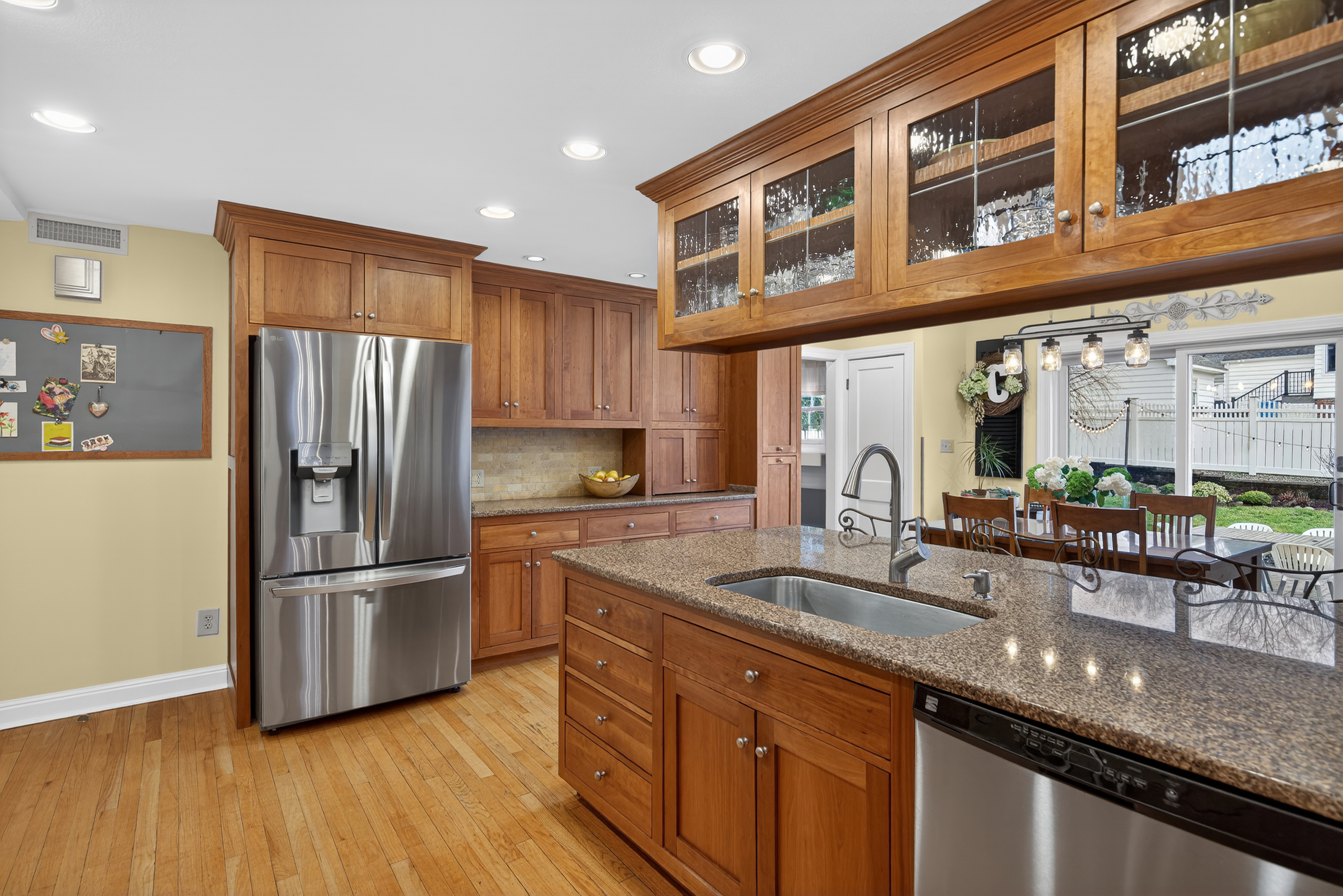Spring Glen at its absolute finest! This stunningly updated home blends timeless charm with modern comfort in one of the neighborhood's most desirable settings. Professionally landscaped yard makes a lasting impression, complete with an irrigation system, beautiful perennial plantings. A brand new walkway welcomes you inside to a warm and inviting living room featuring a new gas fireplace and built-ins. An elegant arched entry leads to the formal dining room, where classic wainscoting and crown molding create the perfect backdrop. The real showstopper is the custom kitchen, designed for both beauty and function. Cherry cabinetry, some with glass doors, granite countertops & high-end appliances make this space exceptional. A generous breakfast bar comfortably seats four, while two skylights flood the kitchen with natural light throughout the day. The kitchen opens seamlessly to the family room and overlooks the spectacular fenced backyard and patio, creating an ideal flow for entertaining. Upstairs offers 4 bedrooms and 2 full baths, including a picture-perfect primary suite w/ cathedral ceilings, abundant closet space, & a renovated spa-like bathroom. Finished lower level provides flexible space. Additional conveniences with a garage that opens directly into the mudroom. Extensive updates include a new roof, gas furnace, central air, new driveway, Trex decking, & much more. A truly special Spring Glen home where every detail has been thoughtfully designed.
