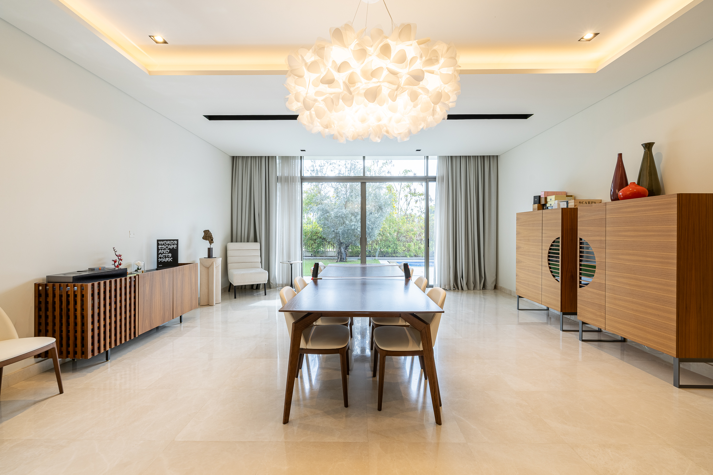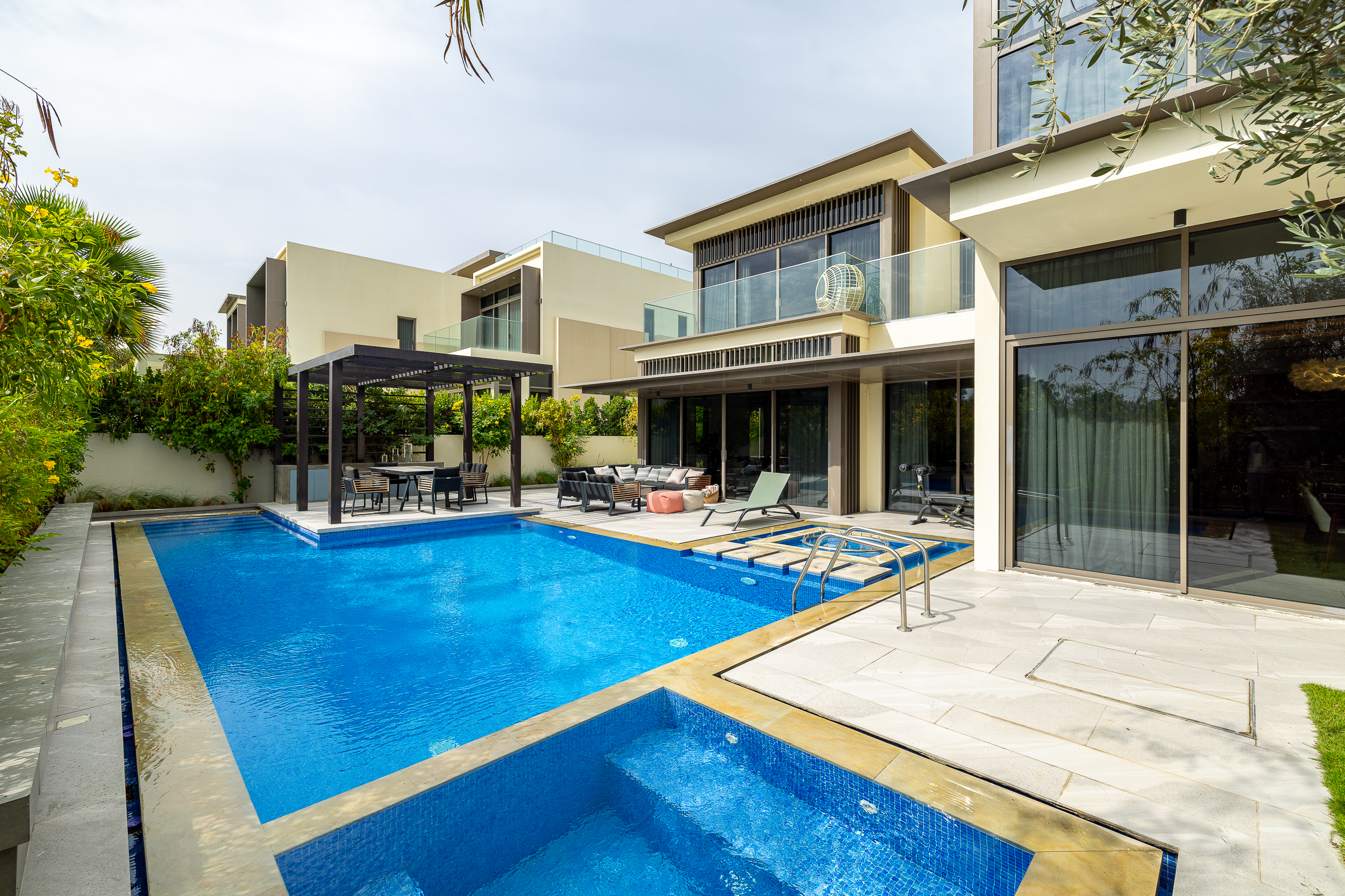 Expansive floor-to-ceiling glazing blurs the boundary between inside and out, revealing a resort-style garden complete with a swimming pool, Jacuzzi, water feature, and a shaded pergola that shelters an outdoor dining area and summer kitchen — perfect for elevated alfresco entertaining. The extended courtyard with lush landscaping elevates both privacy and atmosphere.