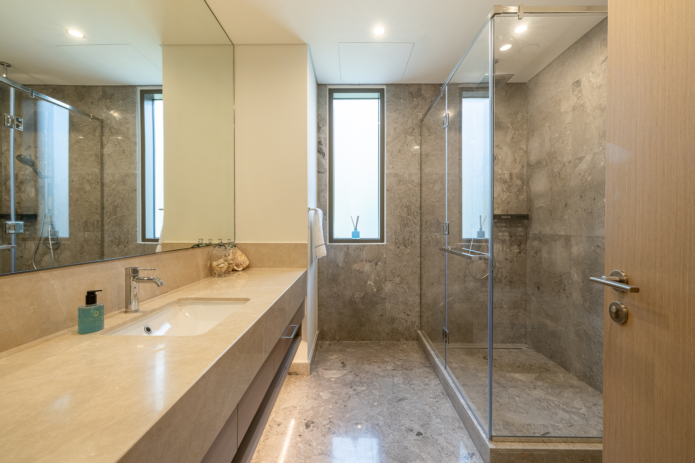 Bedrooms are generously proportioned, each accompanied by a sophisticated en-suite and serene balconies, some capturing uninterrupted park views. The home also benefits from four parking spaces.