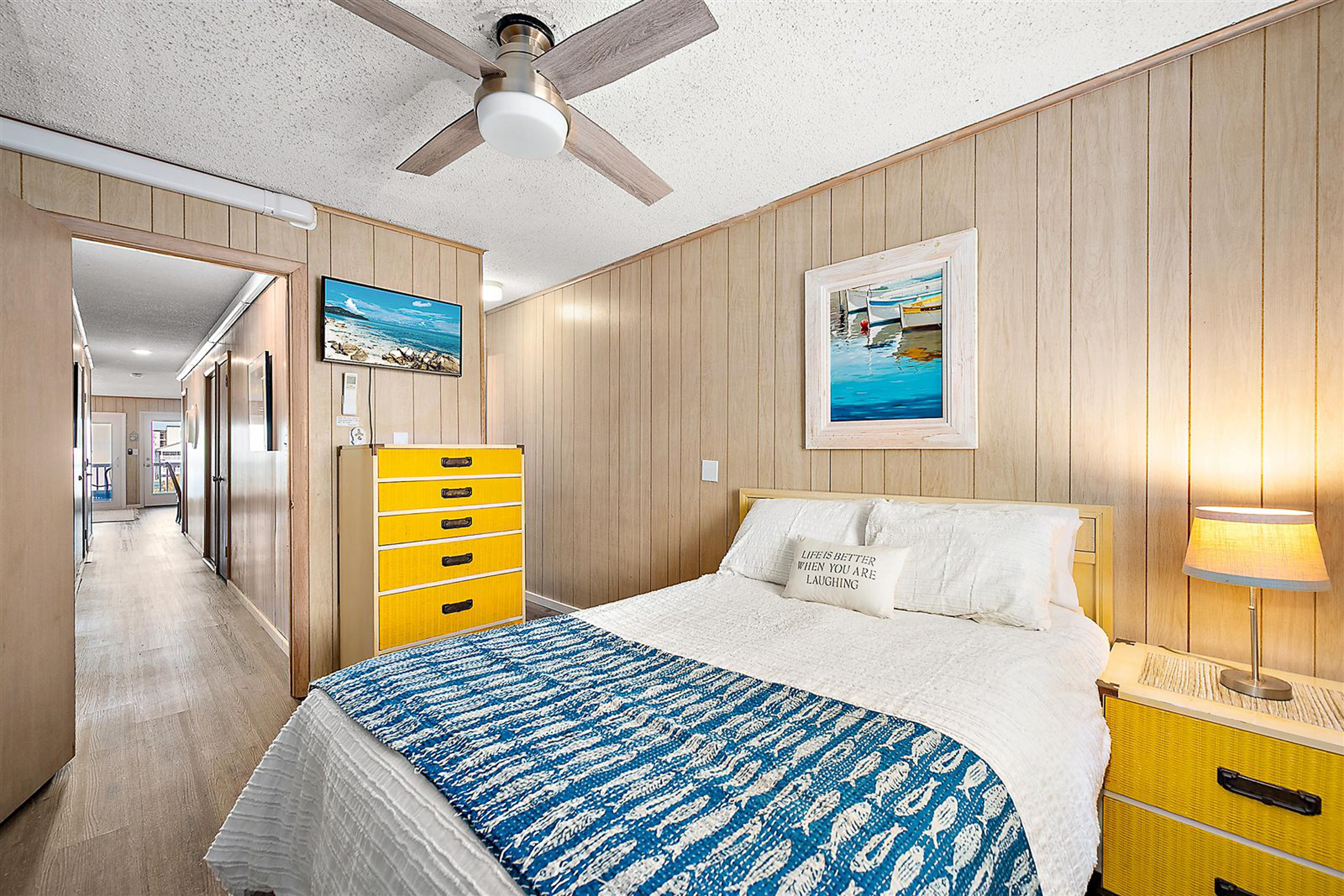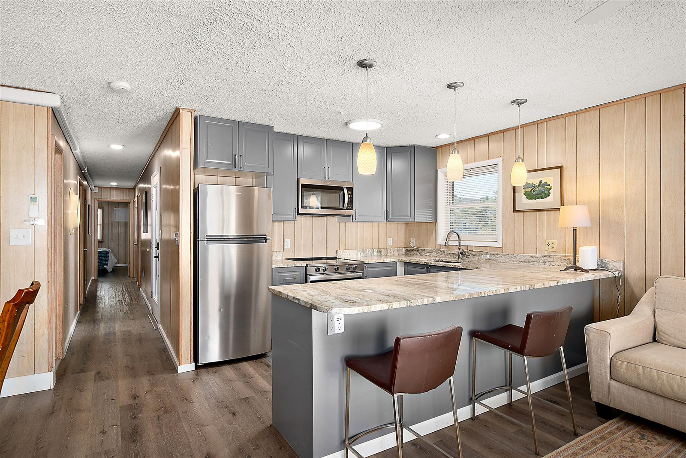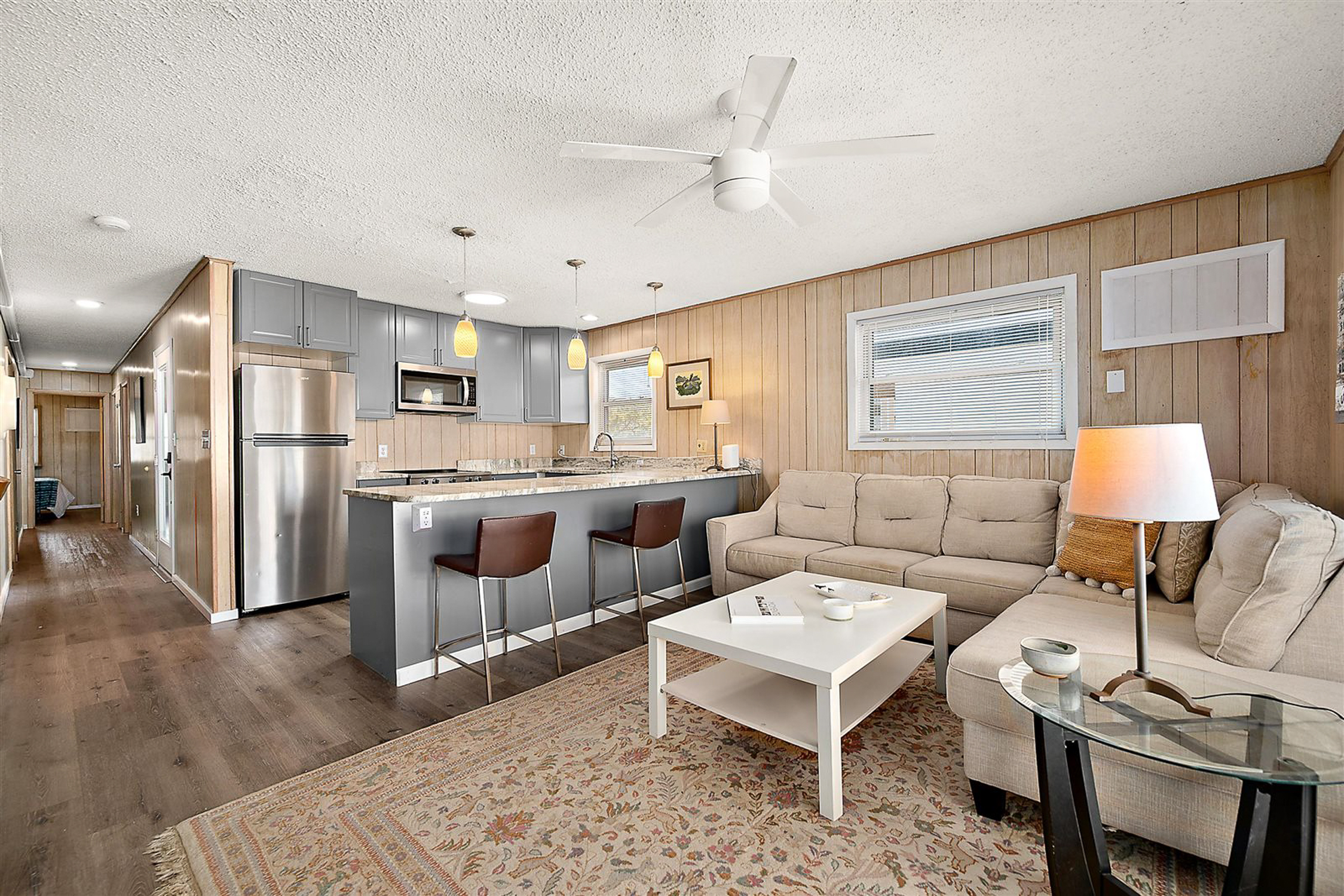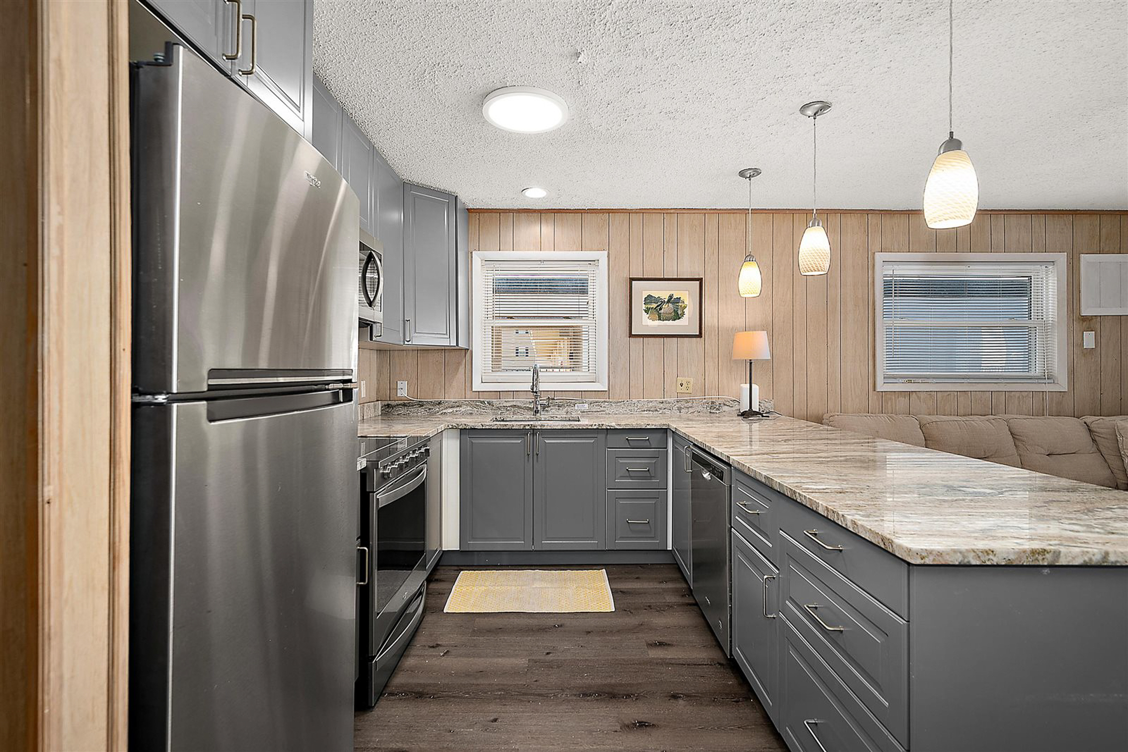 The renovated kitchen features granite countertops, stainless steel appliances, upgraded cabinetry, stylish pendant lighting, and convenient counter seating—ideal for gathering after a day at the beach. The spacious layout includes three bright bedrooms with generous closet space, including a primary suite with an en-suite bath. A separate laundry room with a full-size washer and dryer adds everyday convenience for owners and guests alike.