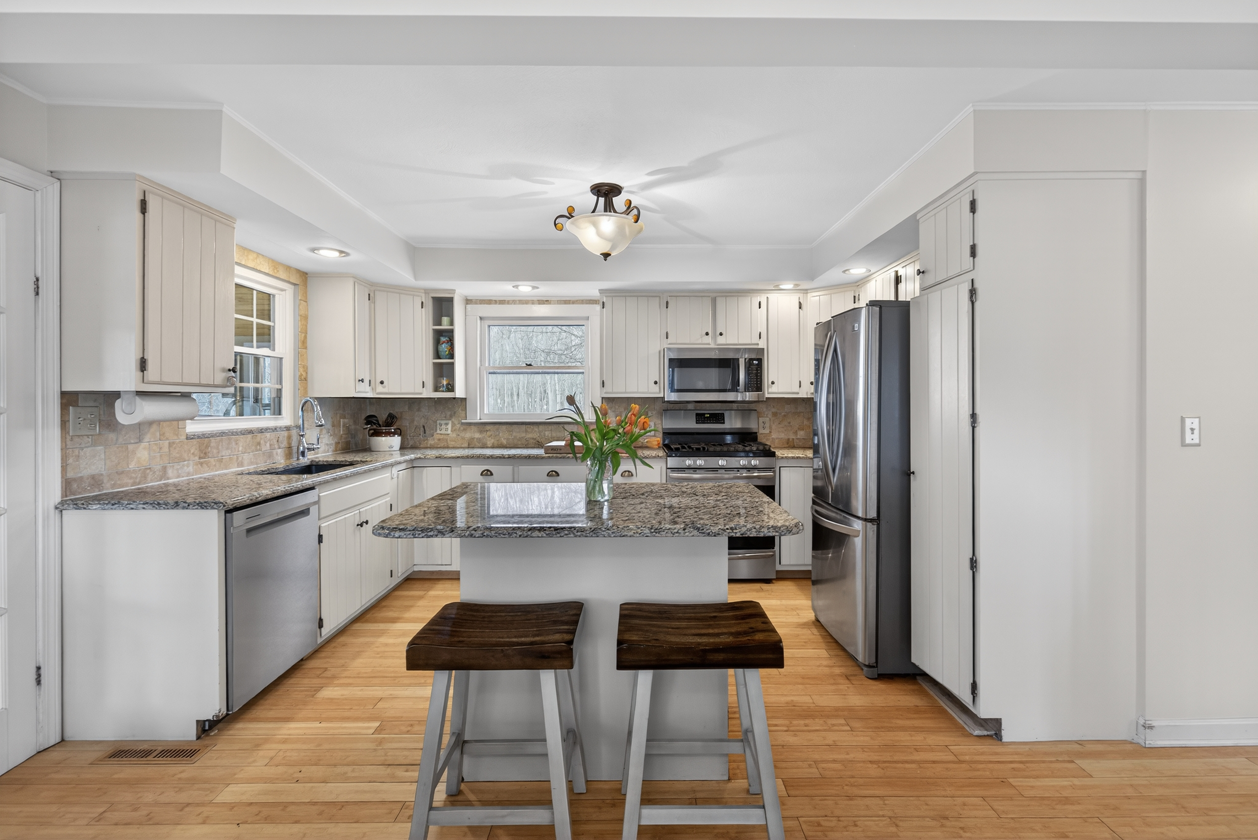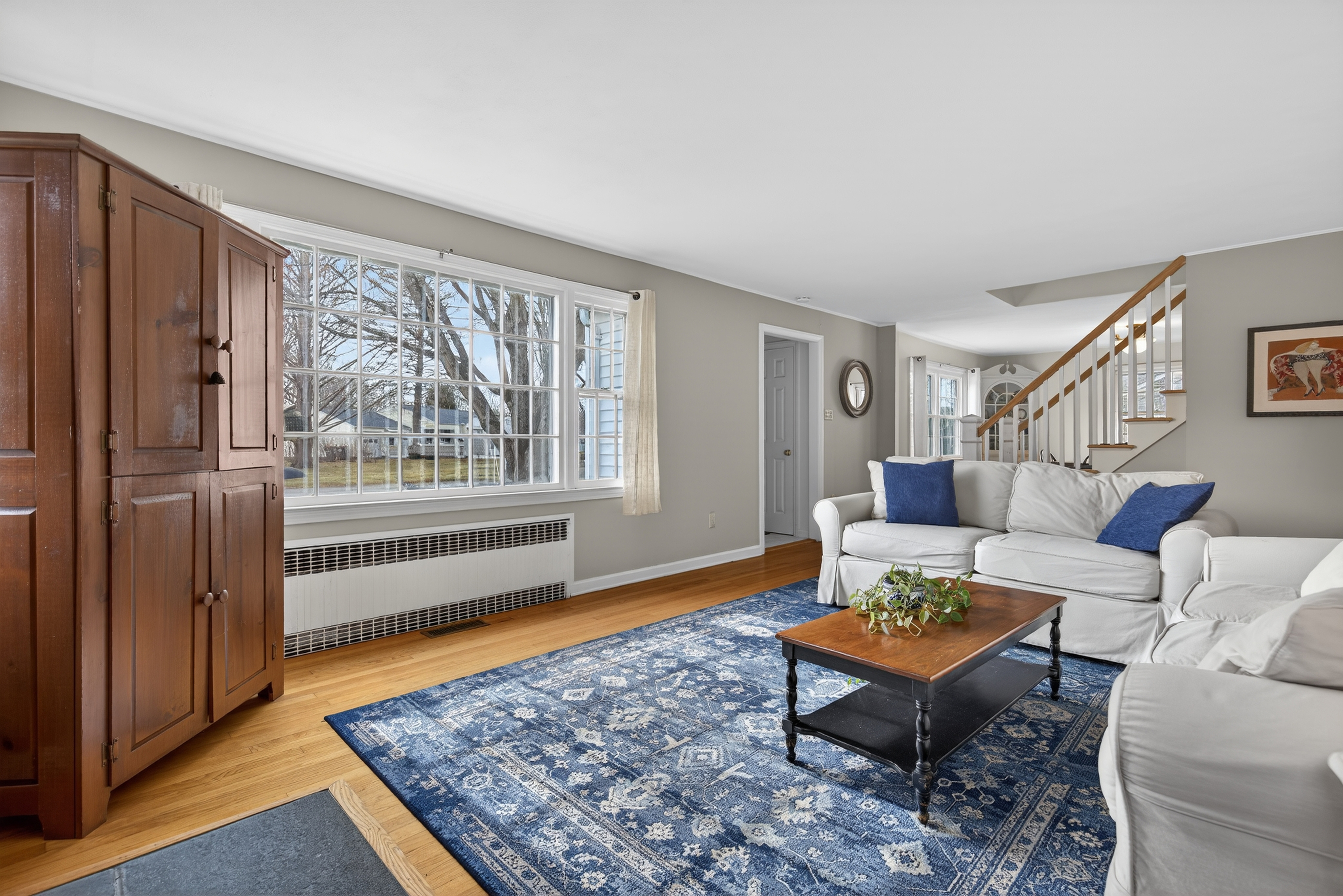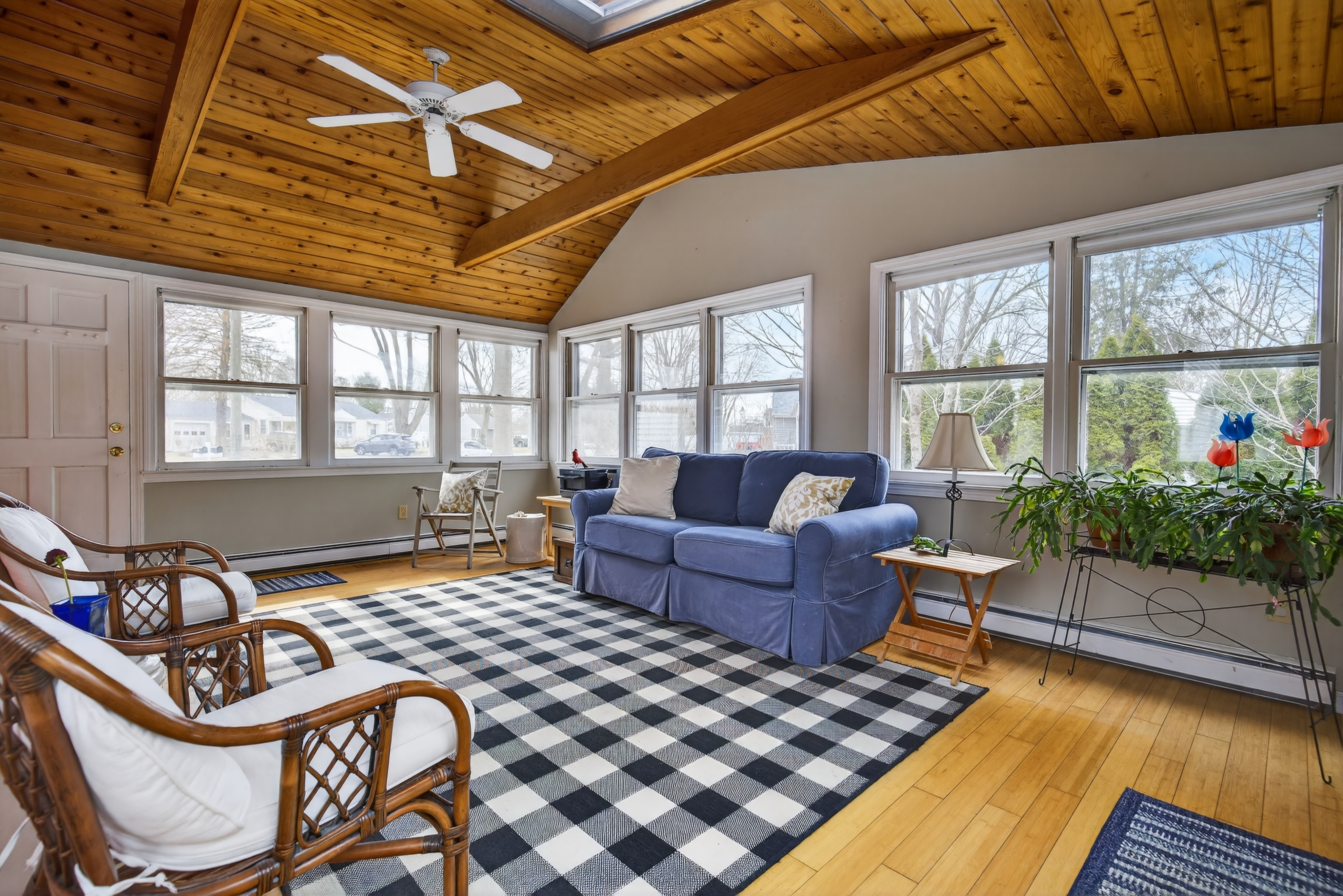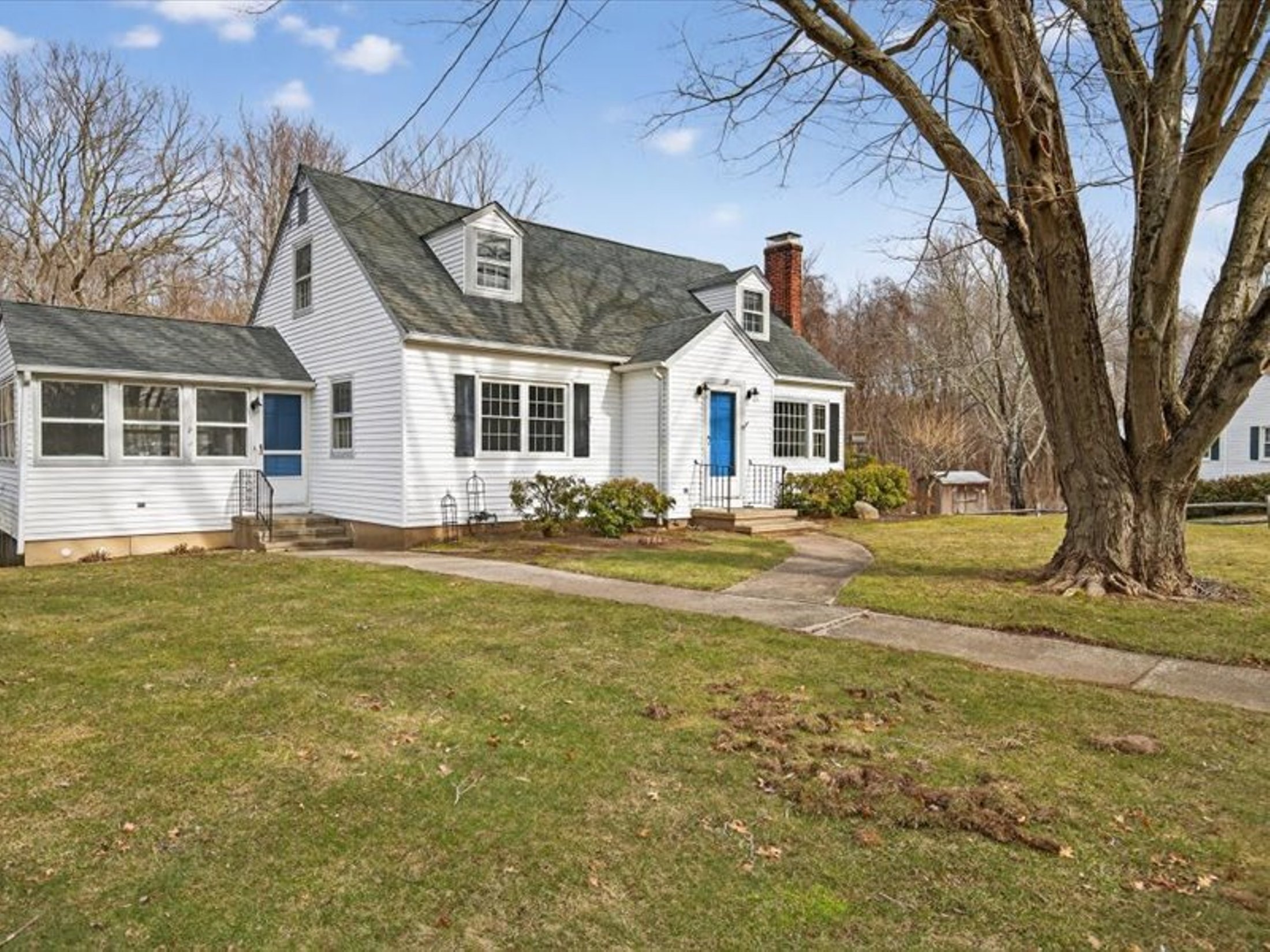 Discover the perfect blend of warmth, character, and lifestyle in this inviting four-bedroom Cape, ideally situated on a quiet street just minutes from Madison's Town Center and pristine beaches. The sun-drenched living room features an oversized front window and cozy wood-burning fireplace. Flow seamlessly into the dining room, sized beautifully for gatherings of any size. The updated kitchen boasts granite countertops, tumbled marble backsplash, and a functional center island, all open to the dining area. Step into the bright sunroom-your new favorite retreat-overlooking the deck, pool, and lush backyard. The convenient first-floor primary bedroom and full bath complete the main level, offering single-floor living potential. Upstairs, three additional bedrooms with gleaming hardwood floors and generous closets share a full bathroom. The finished lower level recreation room expands your living space, while the large utility area offers workshop, gym, or storage possibilities. The private, expansive rear yard features an in-ground pool, garden beds, and plenty of open space. The detached two-car garage provides ample parking and storage. Owned solar panels keep utility costs remarkably low-averaging under $20/month in summer. Minutes to beaches, town center, and I-95. This Cape offers comfort, character, and convenience in one of Madison's most desirable settings.