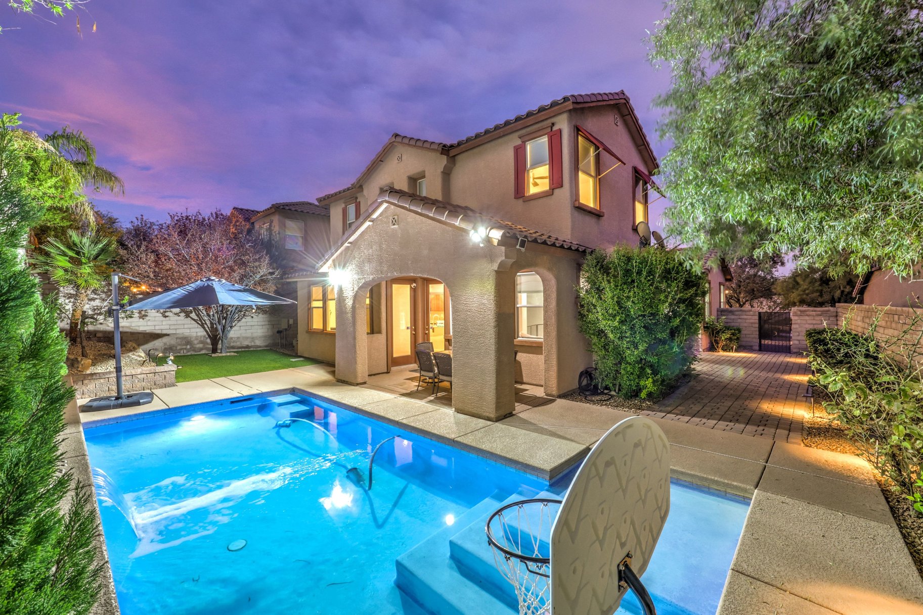 Located in a highly desirable gated community in Summerlin West, this beautifully upgraded residence offers 3 bedrooms, 3 baths, and 2,480 sq ft of thoughtfully designed living space. Over $125K in upgrades enhances both the interior and exterior, including a private backyard retreat featuring a sparkling pool with solar heating, side yard pavers, and professionally designed front and rear landscaping, perfect for relaxing or entertaining. Inside, the home showcases luxury vinyl flooring throughout, remodeled bathrooms, custom California Closet built-ins, and a modern kitchen with new microwave and oven. Updated ceiling fans and designer lighting add to the elevated feel. Ideally situated just minutes from nearby parks and Downtown Summerlin, enjoy convenient access to premier shopping, dining, and entertainment while living in one of Las Vegas’ most sought-after master-planned communities.