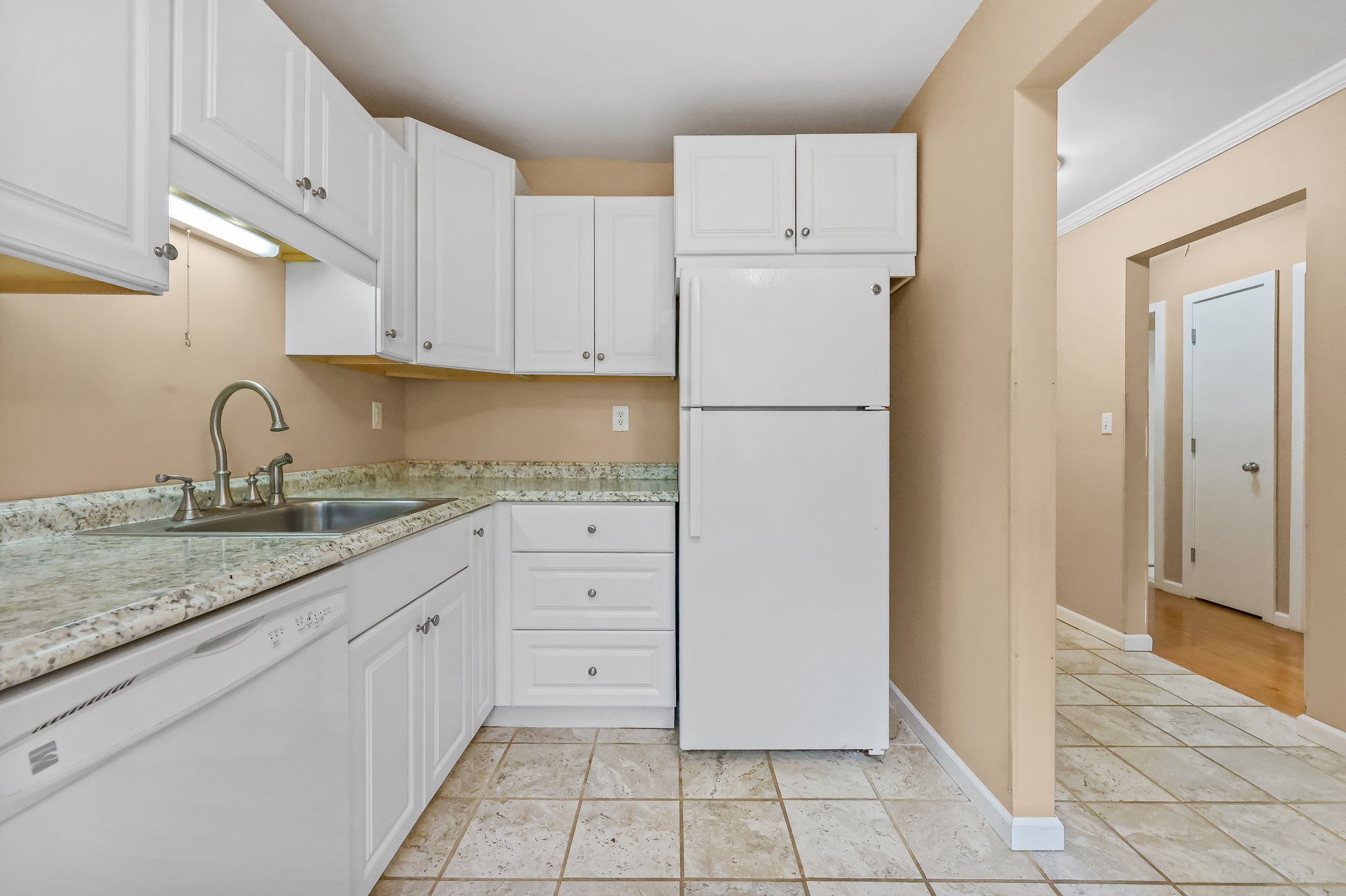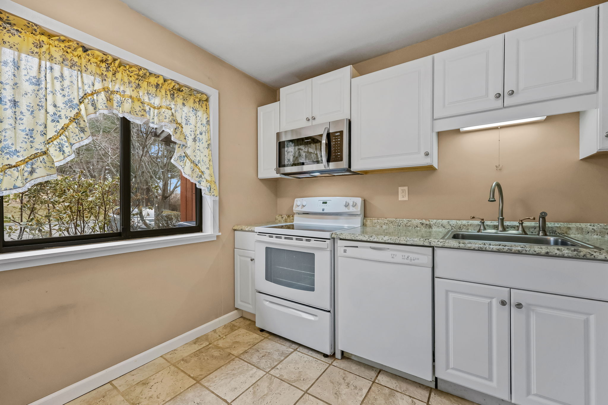 Beautifully maintained one level living condo awaits! Neatly placed in beginning of this sought after 55+ Adult community. Parking at your front door. No steps! Private entrance. Tiled hallway leads to Dining and Living room with soft neutral decor and hardwood flooring. Clean, crisp white kitchen with a cozy spot for small table. Fully remodeled bathroom , 2 nice size bedrooms with ceiling fans , central air, gas heat and updated flooring. Newer stackable washer and dryer in unit too! Sliding doors off living room lead to nice size patio to enjoy ! All this waiting for you at The Views of Long Hill...Welcome!