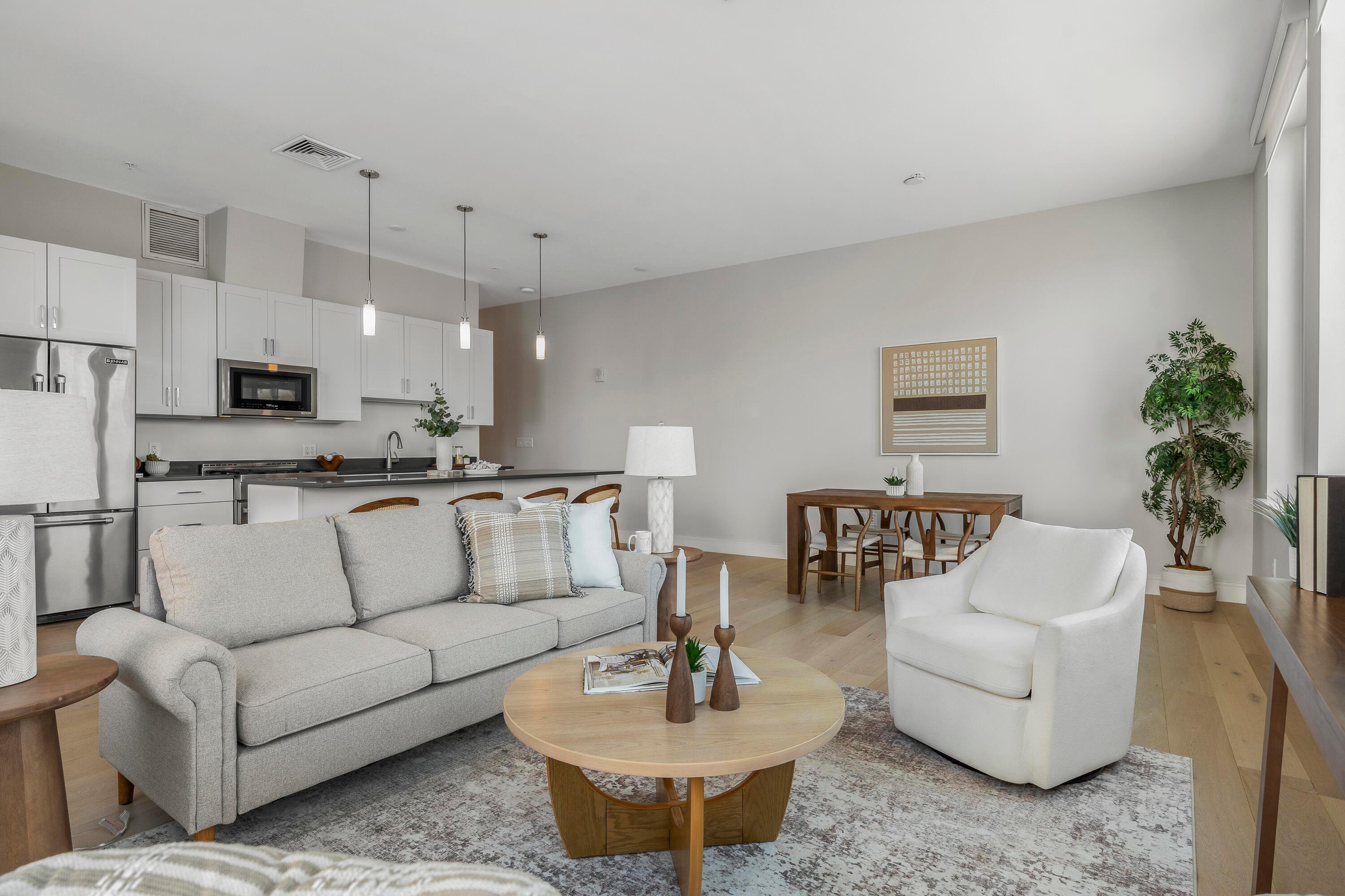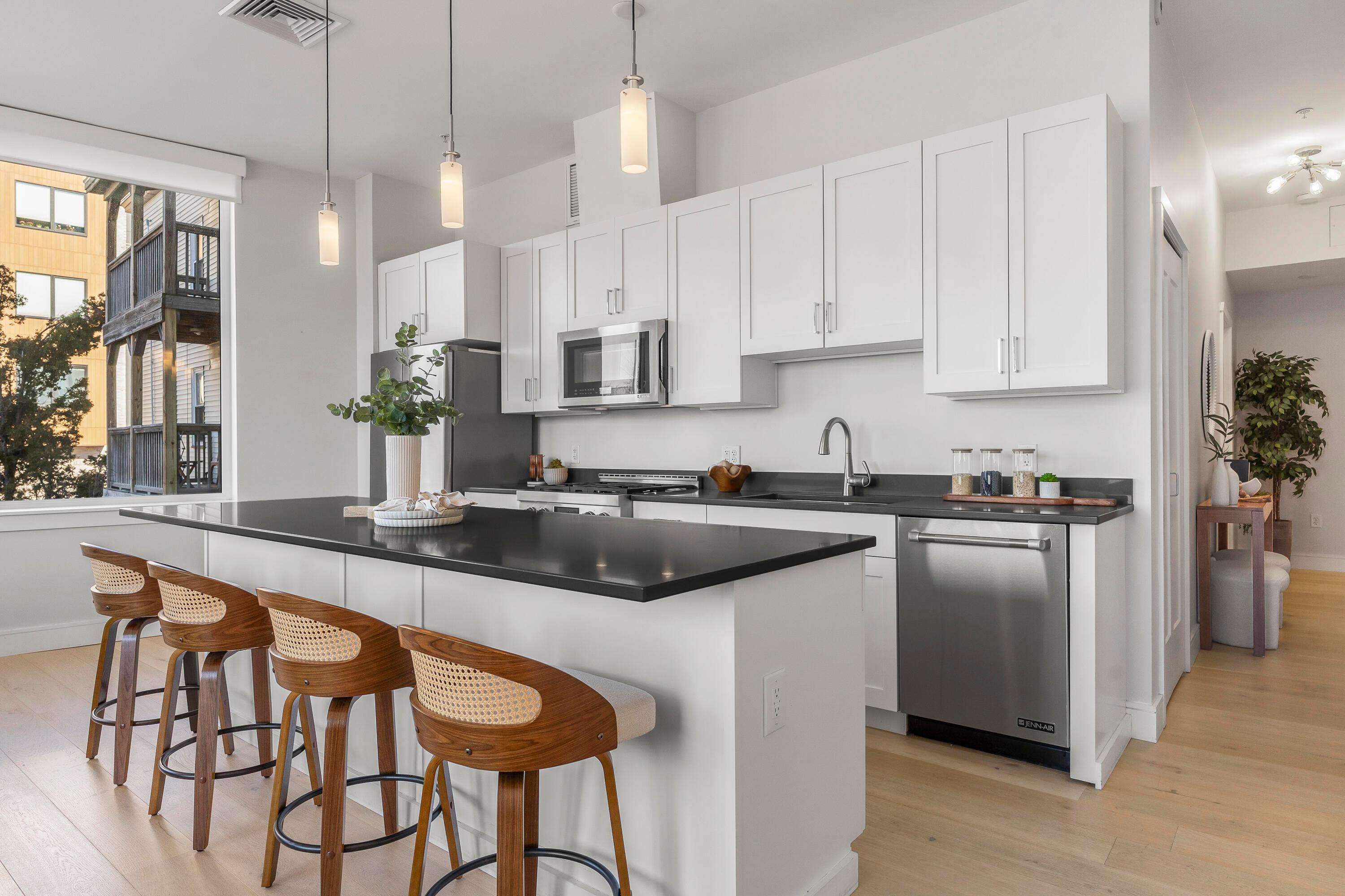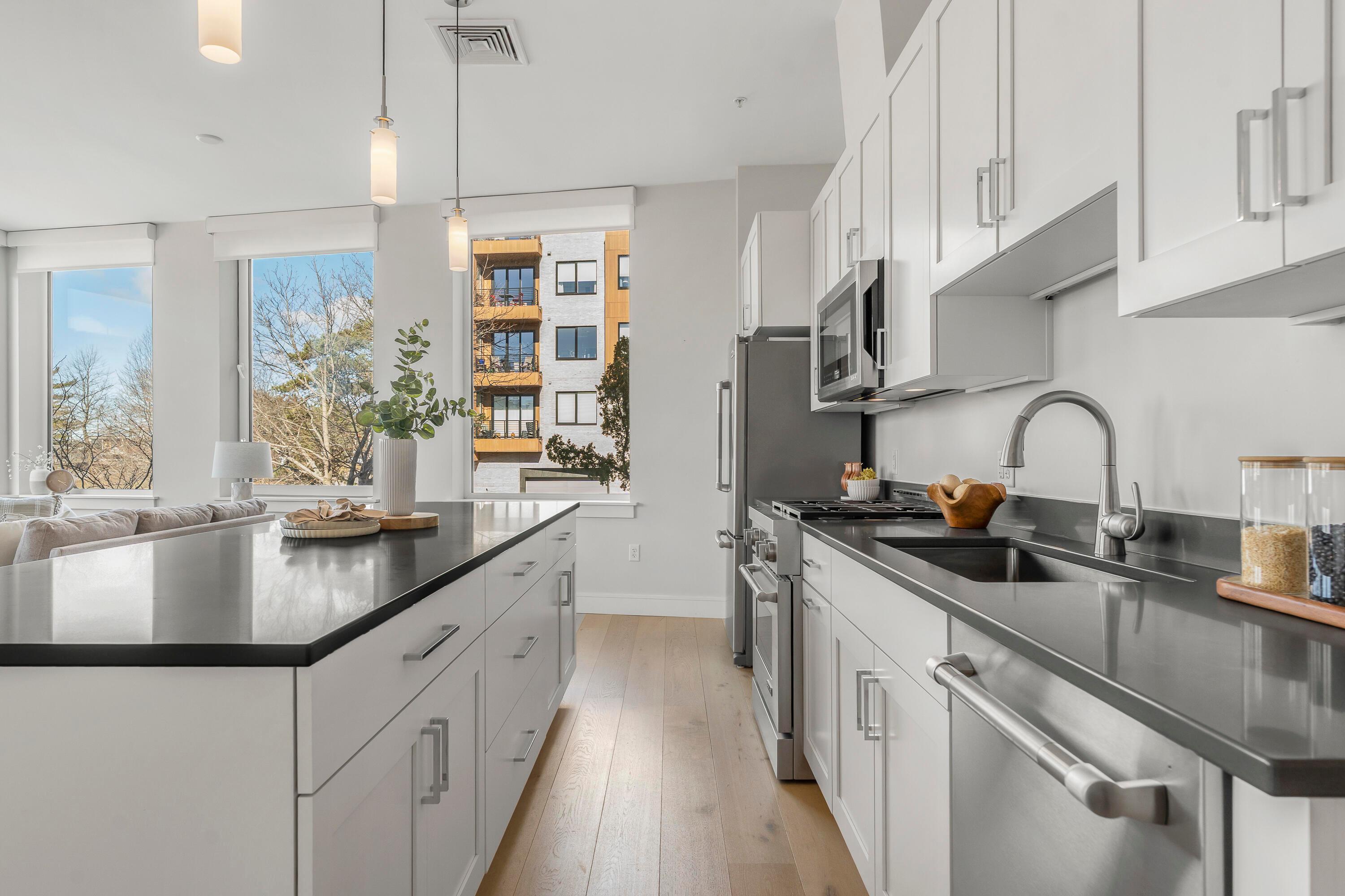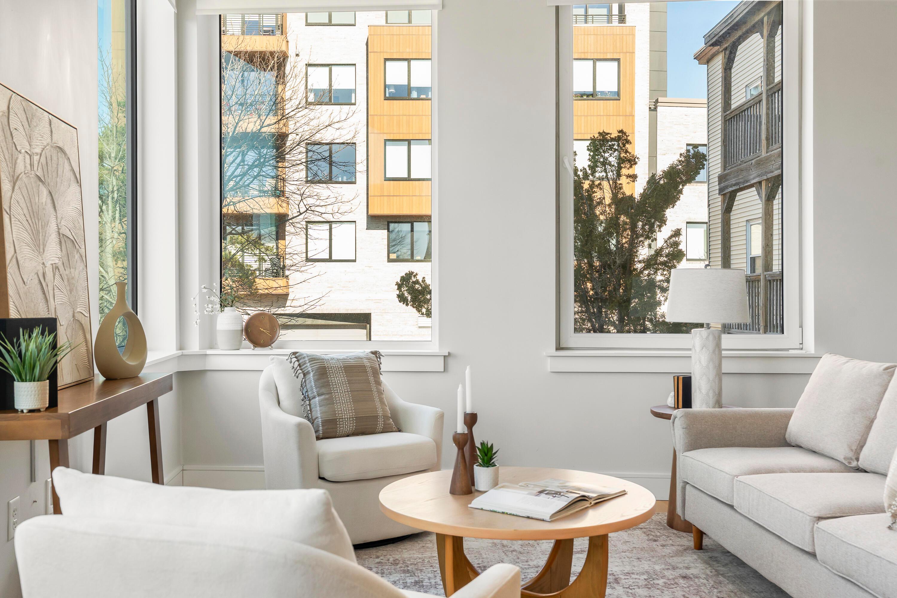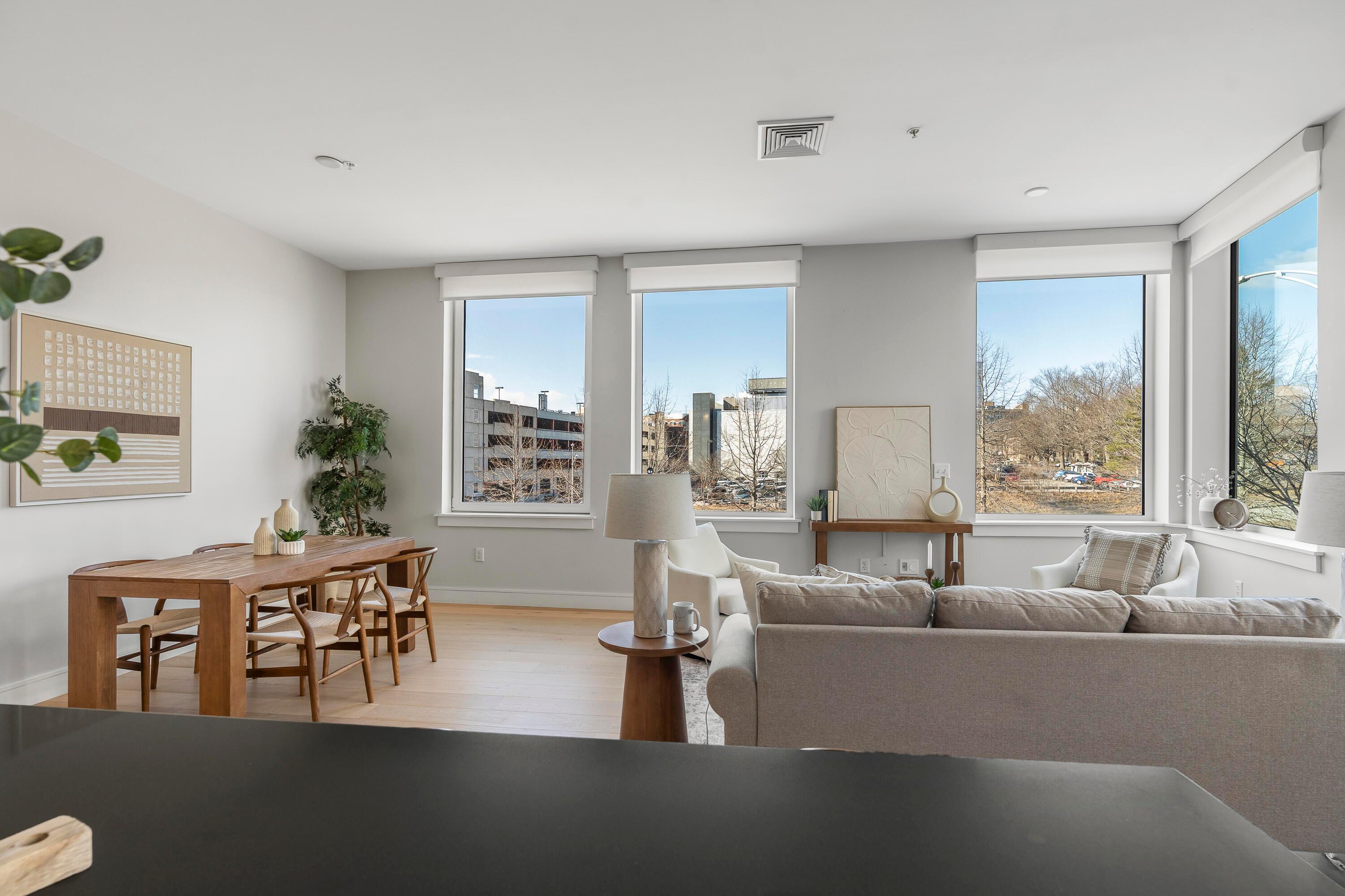 Modern design, exceptional light, and a premier location come together to create a truly elevated Portland lifestyle. This bright corner residence at The Luminato, located at the base of Munjoy Hill, offers refined downtown living just between the Old Port and the East End. Inside, expansive windows flood the space with natural light and frame sweeping city views. Ten-foot ceilings and an open-concept layout create an airy feel throughout the thoughtfully designed two-bedroom home. Wide-plank wood floors, modern cabinetry, and energy-efficient heat pumps provide both style and comfort year-round. The kitchen is beautifully appointed with Jenn-Air appliances, quartz countertops, and a generous center island--ideal for everyday living or entertaining. The primary suite features a striking shiplap accent wall that adds texture and character. The ensuite bath features dual vanities, a glass-enclosed shower, a separate water closet, and walk-in closet. Additional highlights include fiber-optic internet for seamless remote work and deeded garage parking for easy city living. Residents of The Luminato enjoy a sophisticated lobby, secure entry, fitness room, and resident lounge, along with the option to reserve a private guest suite for visiting friends and family. The rooftop terrace--with its green space and views of Casco Bay--offers a beautiful place to relax above the city. This vibrant downtown location places locally owned shops, acclaimed restaurants, and Portland's arts and entertainment scene close at hand--from live music and theater to galleries, waterfront parks, and the energy that defines the Old Port and East End neighborhoods.