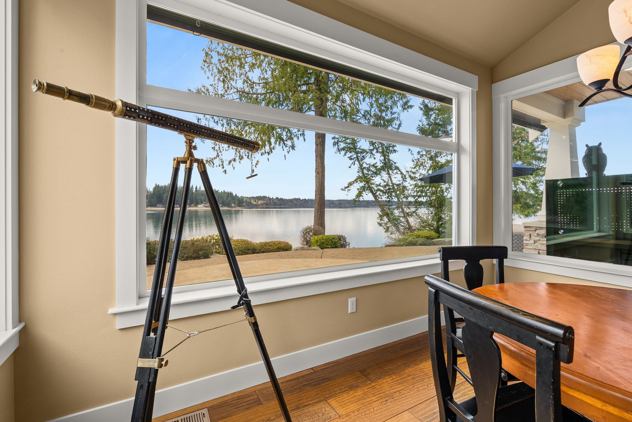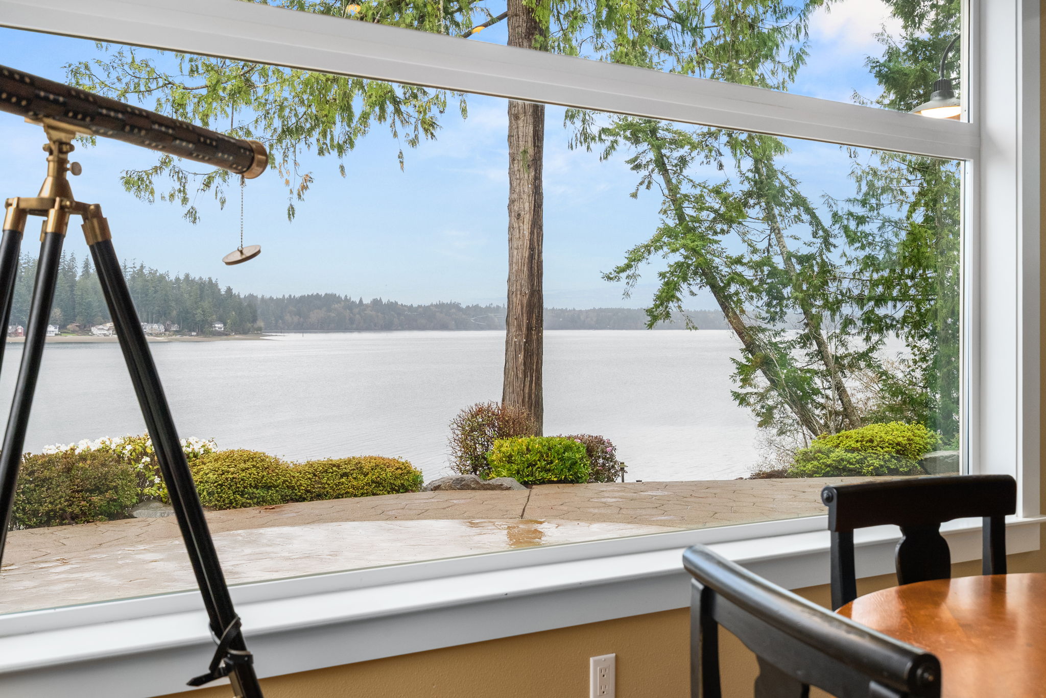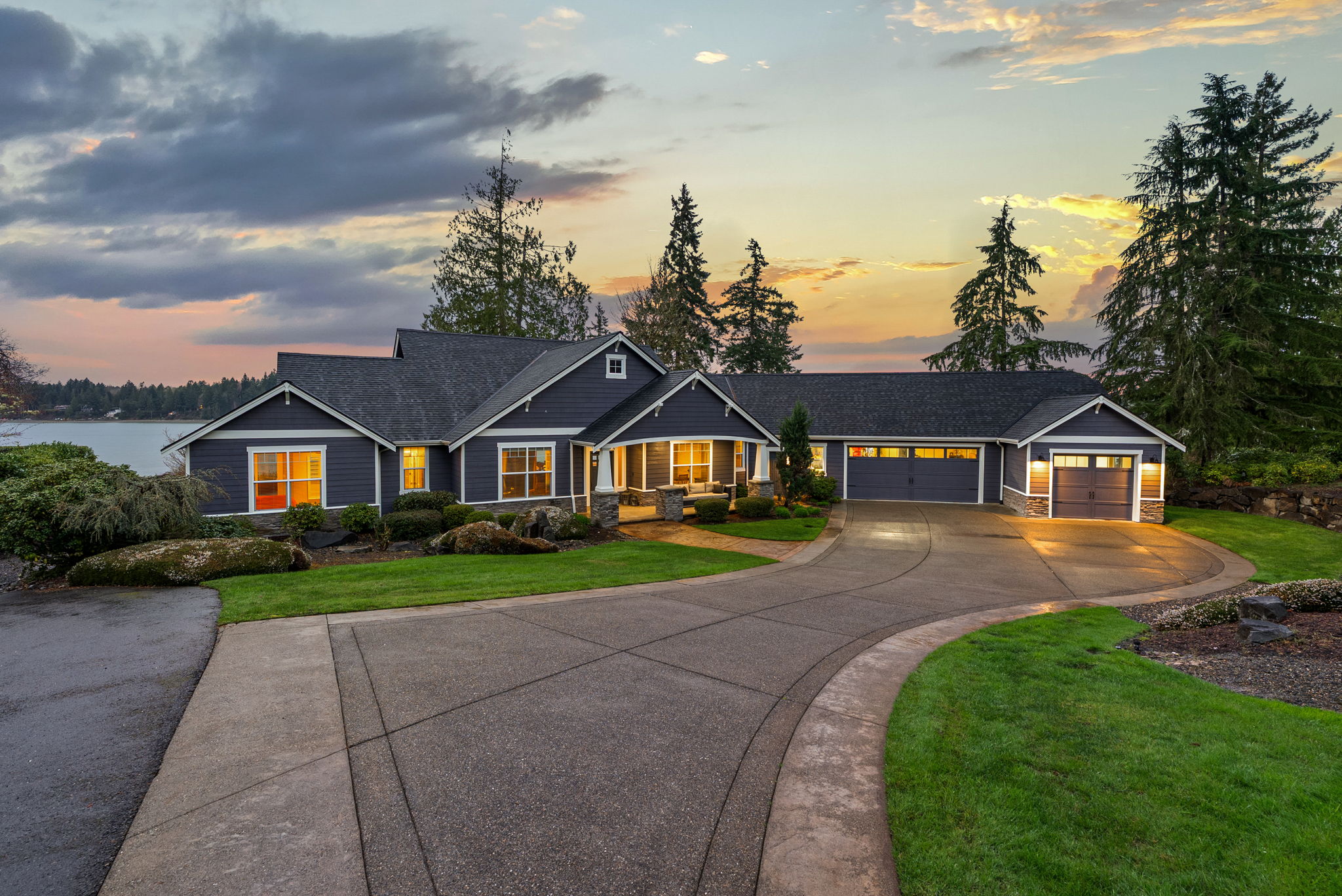 Take in breathtaking views on Bayshore with this beautifully designed, low-maintenance rambler. Offering 3 bedrooms plus a den & high tech wired media room, this home sits atop 147 feet of pristine Eld Inlet waterfront, includes tidelands and a buoy! Soak in the sunsets on the massive stamped concrete patio with room for all your entertaining needs. The impressive primary suite showcases sweeping Olympic Mountain views, a luxurious five-piece en-suite, & a spacious walk-in closet. Inside, you’ll find vaulted ceilings, impressive wood-wrapped beams, gorgeous masonry work and custom built-ins surrounding the fireplace, chef's kitchen w/ stainless steel appliances, custom details throughout, thoughtfully designed to check every box. 1242 Sq. Ft garage to store all your toys! NEW ROOF and NEW EXTERIOR PAINT! Located in a small, upscale community surrounded by high-end homes, this property includes rare deeded dock access for the ultimate waterfront lifestyle.