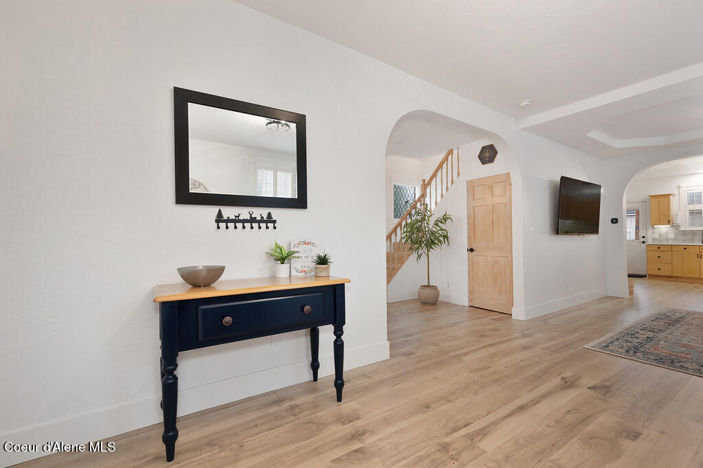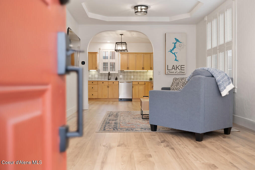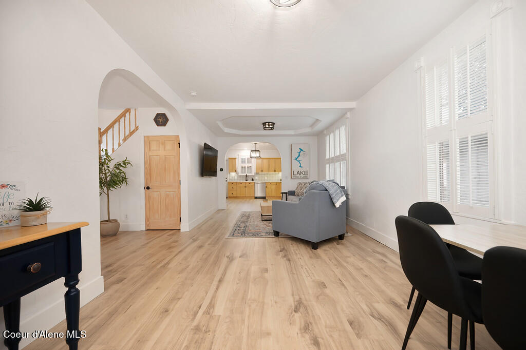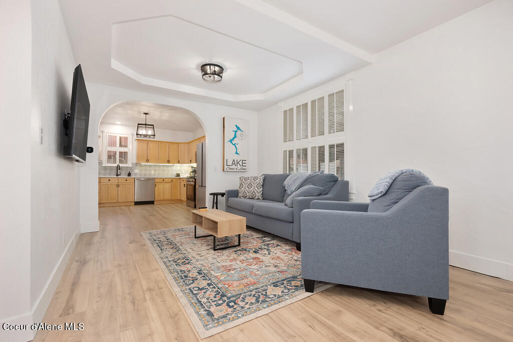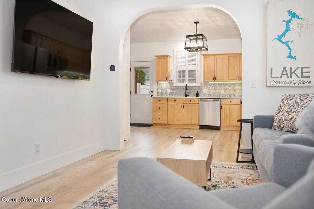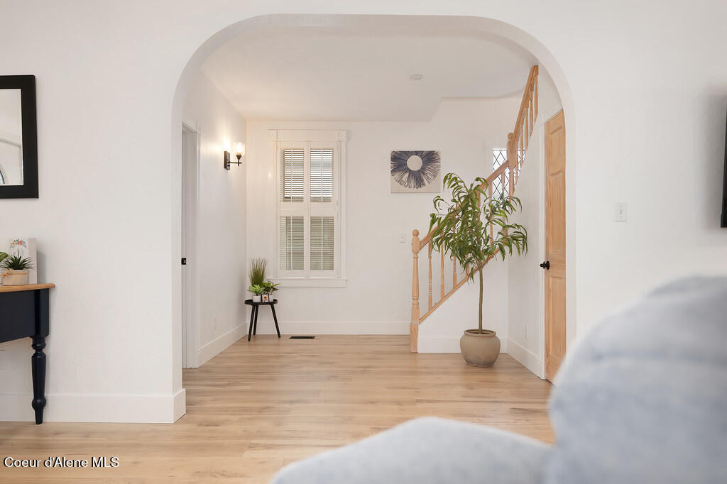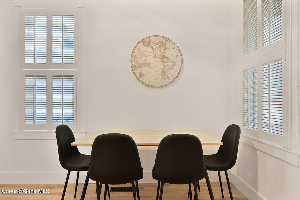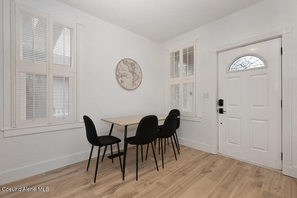 Remodeled and thoughtfully updated in 2024, this home blends modern finishes with timeless character. Nearly every surface has been refreshed, including new countertops, flooring, trim, paint, tiled showers, vanities, lighting, and fixtures throughout--offering a true ''like-new'' feel while preserving its original charm. Located in the heart of Downtown Coeur d'Alene, this property offers the lifestyle everyone is searching for. Walk to the lake, restaurants, coffee shops, boutiques, pubs, ice cream, grocery stores, and the gym--all just minutes from your front door. Tucked just off the main path, you'll enjoy a quiet setting without sacrificing proximity to the action. The property is beautifully framed by mature trees and lush landscaping, creating a private and inviting outdoor space. A durable metal roof adds long-term value with decades of life remaining. Inside, the main level features an open-concept living, dining, and kitchen area, along with a bedroom and full bathroom. Upstairs, you'll find a spacious primary suite with its own bathroom. Start your mornings on the south-facing porch swing, soaking in the sunshine with your coffee in hand. Additional features include a fully insulated, temperature-controlled one-car garage with attached flex space--perfect for a home office, gym, hobbies, or additional storage. The backyard offers a storage shed, garden area, and patio ideal for entertaining and summer BBQs. This is a rare opportunity to own a historic home in a prime downtown location--with all the updates of a modern home.