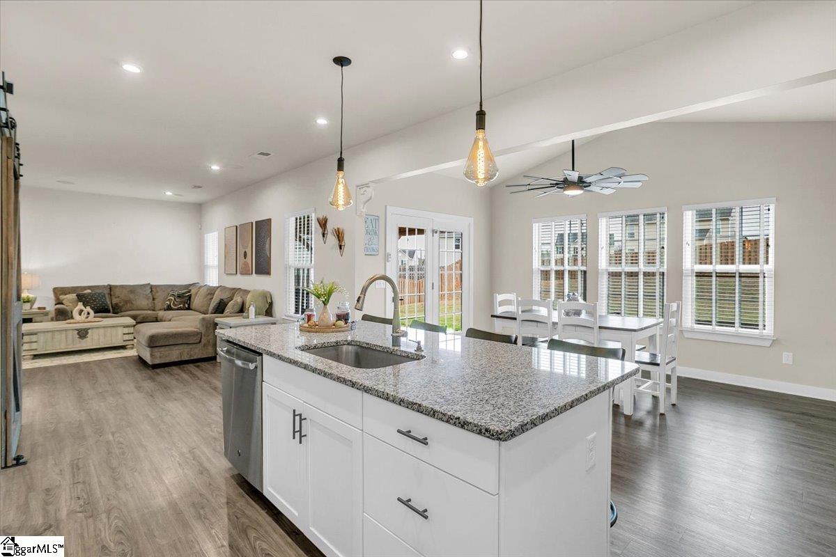 From the moment you step inside, you will notice how bright and pristine 307 Vicksburg Drive feels, with abundant natural light and a fresh, well-kept interior that creates an inviting first impression. Built in 2018 and beautifully maintained, this property offers comfortable, well-designed living spaces, quality finishes, and a location that makes daily life easy - just 15-20 minutes from downtown Greenville. Step inside to an open-concept layout designed for both everyday living and entertainment. The stunning white kitchen features granite countertops, a large island, stainless steel appliances with a gas cooktop, eye-catching backsplash, and an oversized pantry complete with a coffee bar. The kitchen flows seamlessly into the spacious living room, highlighted by a beautiful accent wall that adds warmth and character, along with a bright morning room/dining area. A versatile flex room on the main level provides the ideal space for a home office, playroom, or additional living area. Upstairs, you will find three additional bedrooms and a generous loft, offering plenty of room to spread out. The huge primary suite is a relaxing retreat with a trey ceiling, custom walk-in closet system, dual vanities, and a large walk-in shower. Outdoor living is just as inviting, with a covered back porch overlooking a fully fenced backyard featuring privacy fencing, a custom shed with built-in shelving, and solar lighting along the fence - creating a cozy ambiance for relaxing evenings or entertaining guests. This home has been meticulously cared for and includes custom blinds, designer ceiling fans in all bedrooms, pendant lighting in the kitchen, ceiling speakers in the living room, an epoxy-coated garage floor, smart garage door opener, in-ground sprinkler system, wired alarm system, and a French drain along the side of the home. The garage was extended an additional two feet during construction for added space and functionality. Located in the quiet, established community of The Oaks at Shiloh Creek, near shopping, dining, and schools, this move-in ready home stands out for its easy access to I-85 - making commuting and travel a breeze.