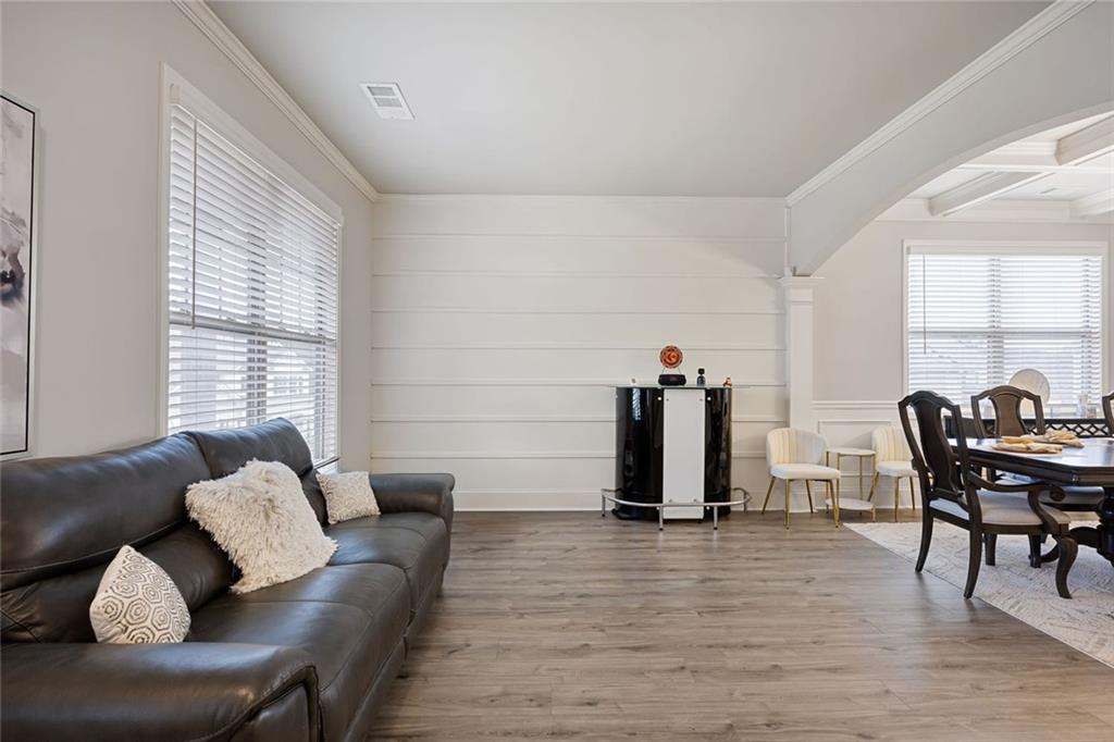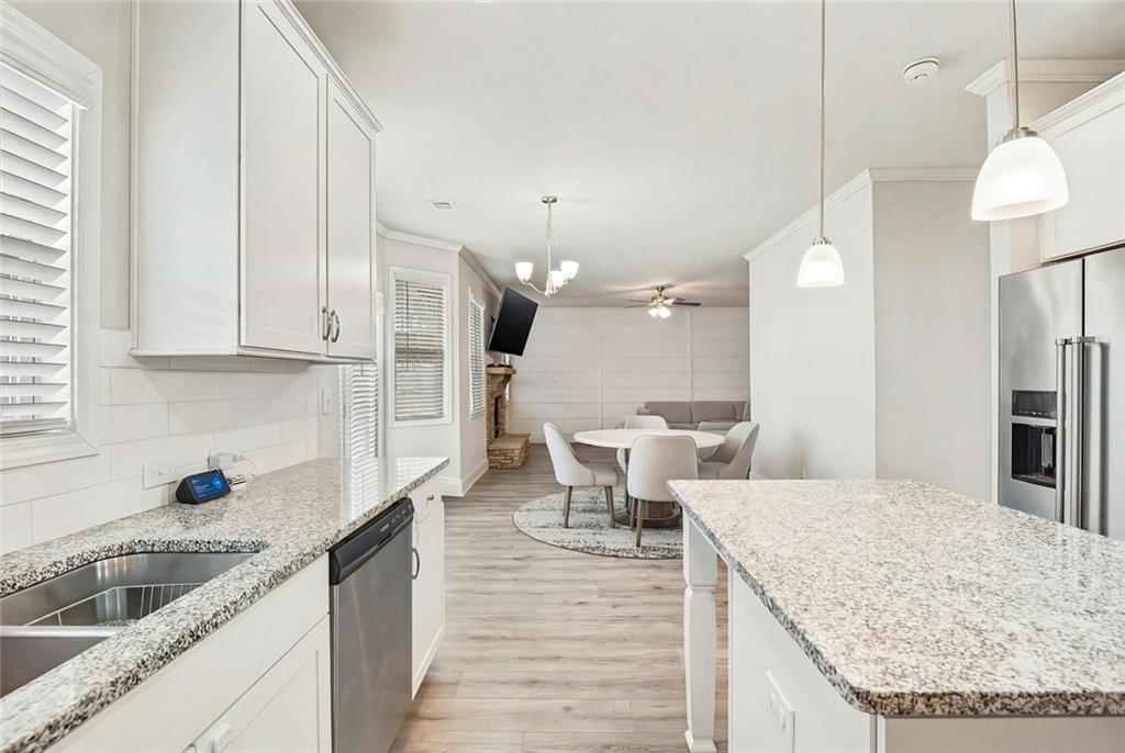 This Beautiful Herrington floorplan home with its Stacked Stone and Baton Board exterior and welcoming covered front porch is just a start of what this exquisite home has to offer. Step inside to a beautifully appointed main level where the living room with its accent wall flows seamlessly into a formal dining room adorned with a coffered ceiling, wainscoting, crown molding and beautiful archways - creating an ideal setting for both intimate gatherings and upscale entertaining,. The kitchen features crisp white cabinetry, pendant lighting over the island which has additional seating, stainless appliances including a new KitchenAid refrigerator, gas cooking, granite countertops, recessed lighting, pantry, all opening effortlessly onto the breakfast area and inviting family room. The family room exudes warmth and style with a striking stone gas fireplace and raised hearth, and a custom accent wall - perfect for relaxing evenings at home. Upstairs, retreat to the expansive primary suite complete with a tray ceiling, spacious sitting area, and a spa inspired bath offering a soaking tub, large tiled shower, double vanities and a custom walk-in closet. Three additional secondary bedrooms, a large bathroom with double vanities, and a loft area provide flexibility for guests, work or play. Upgrades, including new luxury vinyl plank flooring, stylish accent walls enhance the home's modern appeal. Step outside to enjoy a spacious fenced in backyard with an extended patio - ideal for outdoor entertaining or quiet relaxation. Located in Great Sky, a highly sought after community, residents enjoy resort like amenities including three pools, basketball, tennis and pickleball courts, playground, clubhouse and walking trails - delivering a lifestyle of comfort, convenience and leisure.