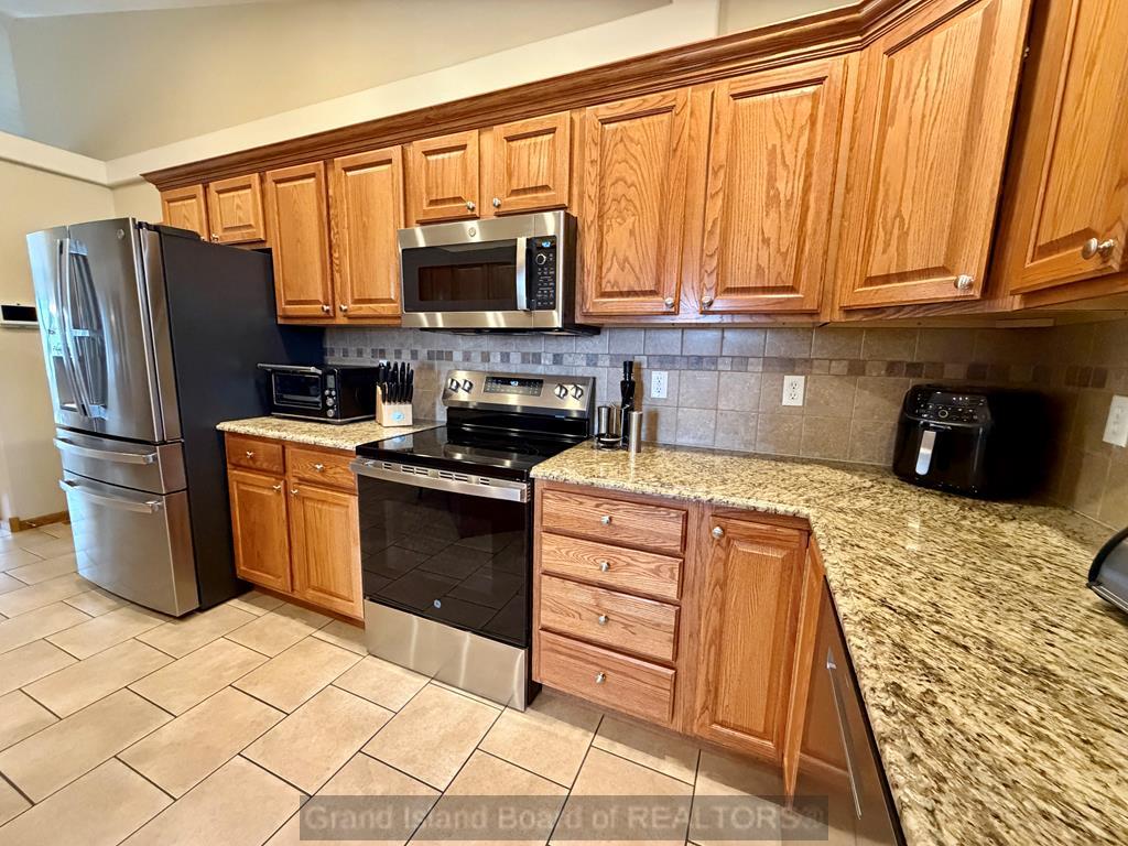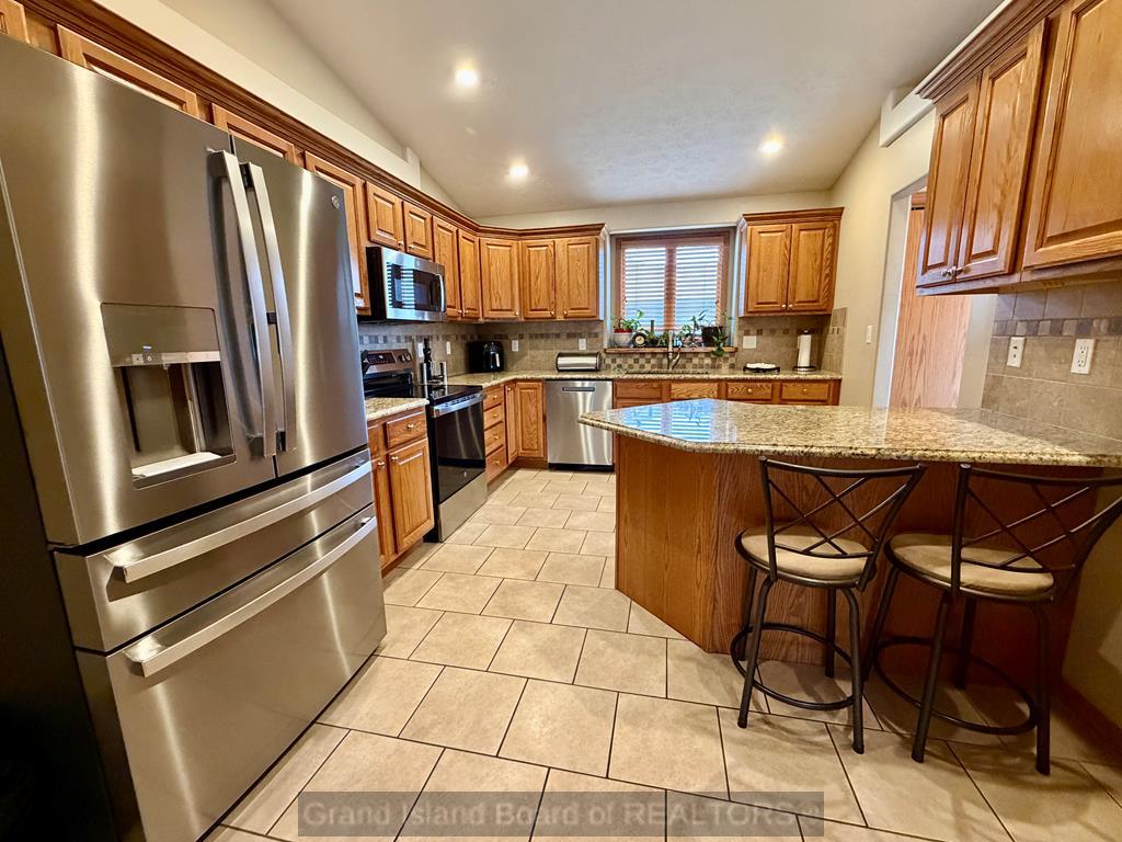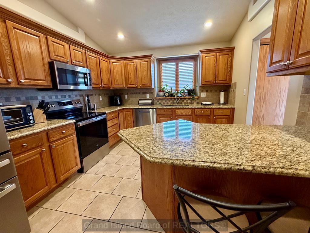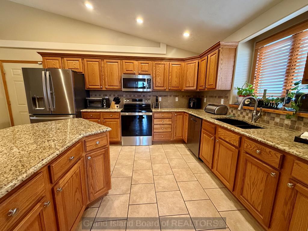Beautifully maintained ranch-style home located on the northwest side of Grand Island! Enjoy a prime setting perfect for evening walks and quiet neighborhood living. This property features a spacious three-car garage, an inviting and functional layout, and the added privacy of no rear neighbors. Recent updates include stunning stone countertops, newer appliances (just one year old), and a recently replaced roof. Step outside to a covered deck with additional composite decking, ideal for entertaining or relaxing. The backyard also includes a versatile shed with an overhang and electricity, offering excellent storage or workspace potential.