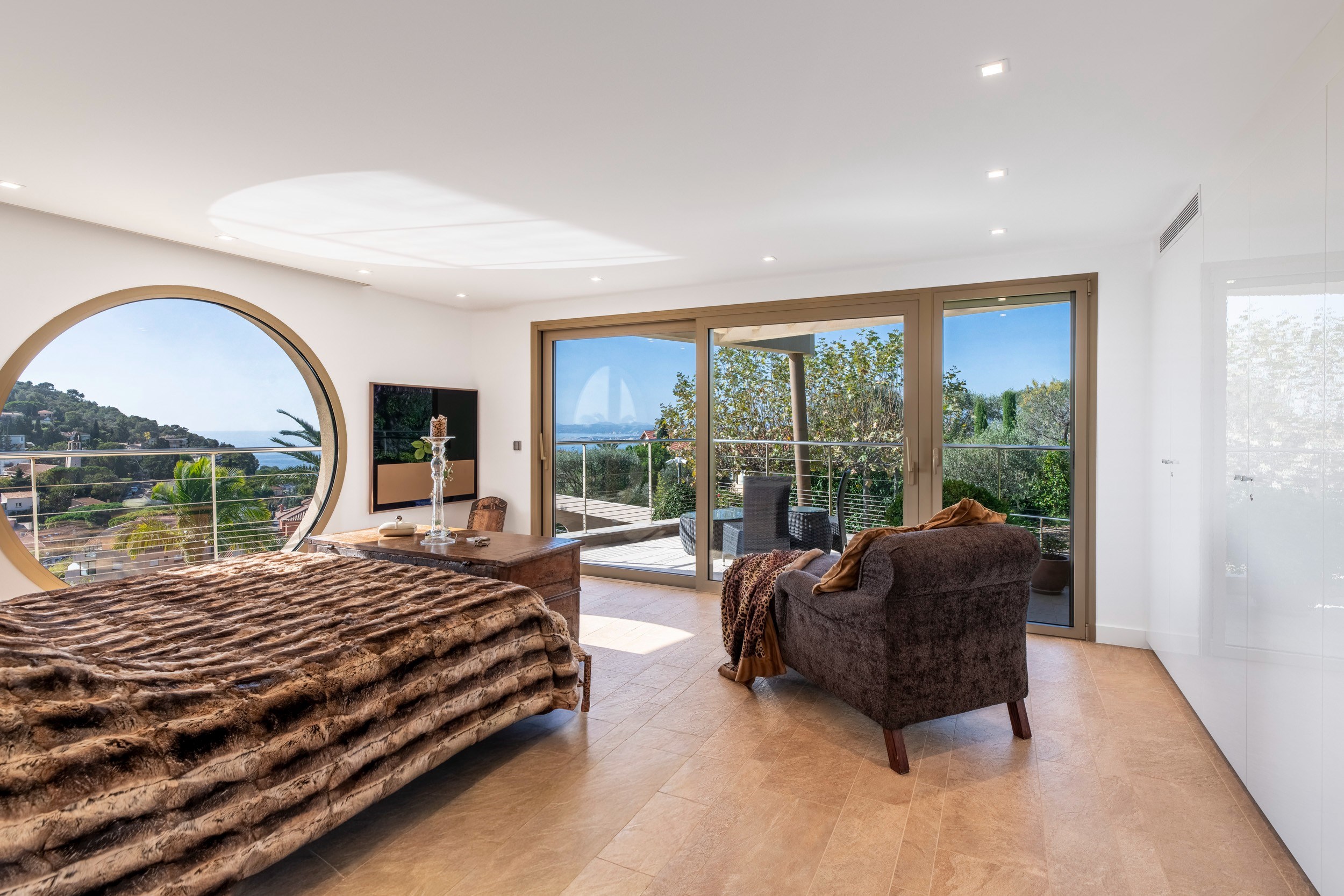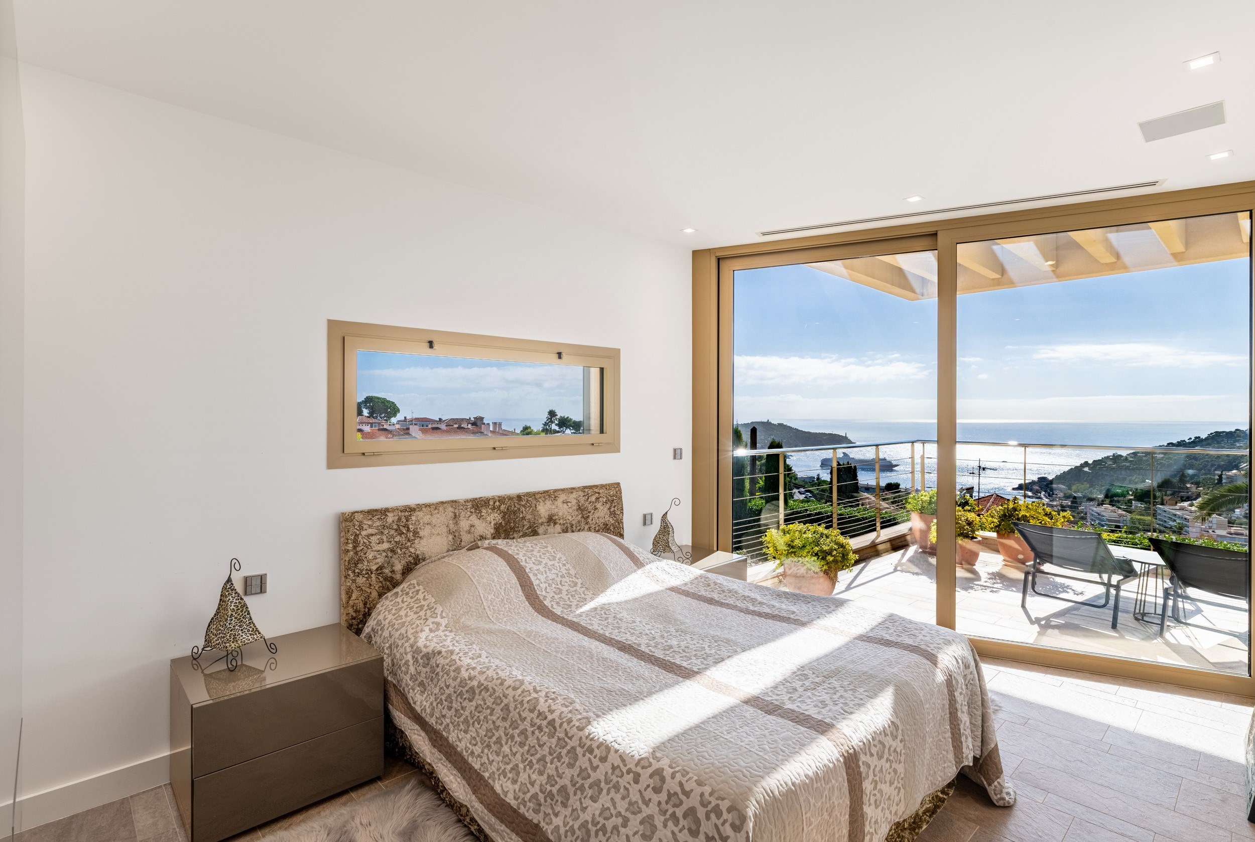 The upper level offers four beautiful bedrooms, three of which are en suite, each opening onto a large terrace overlooking the sea.