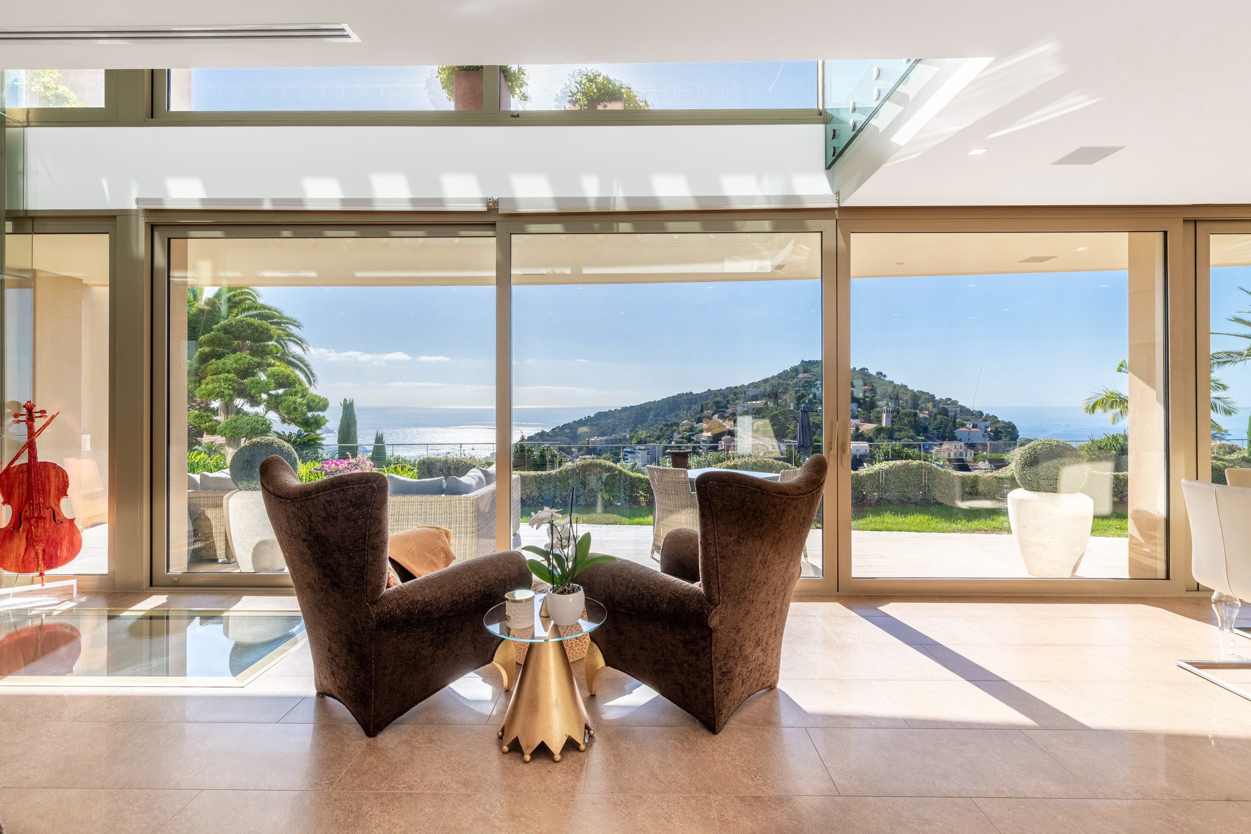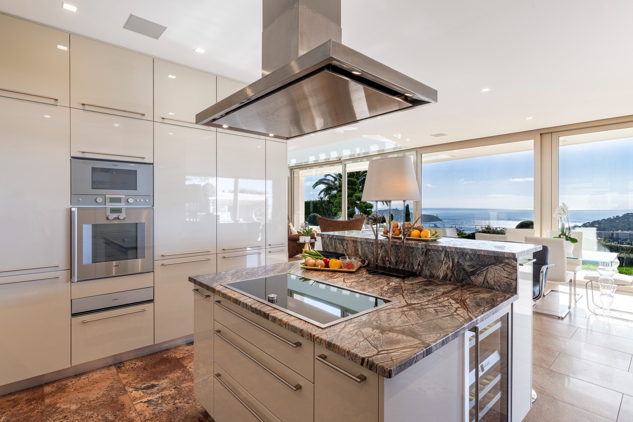 The main level features a large sunny living room, an elegant dining area, and a fully equipped kitchen opening onto a generous terrace with a fantastic sea view.