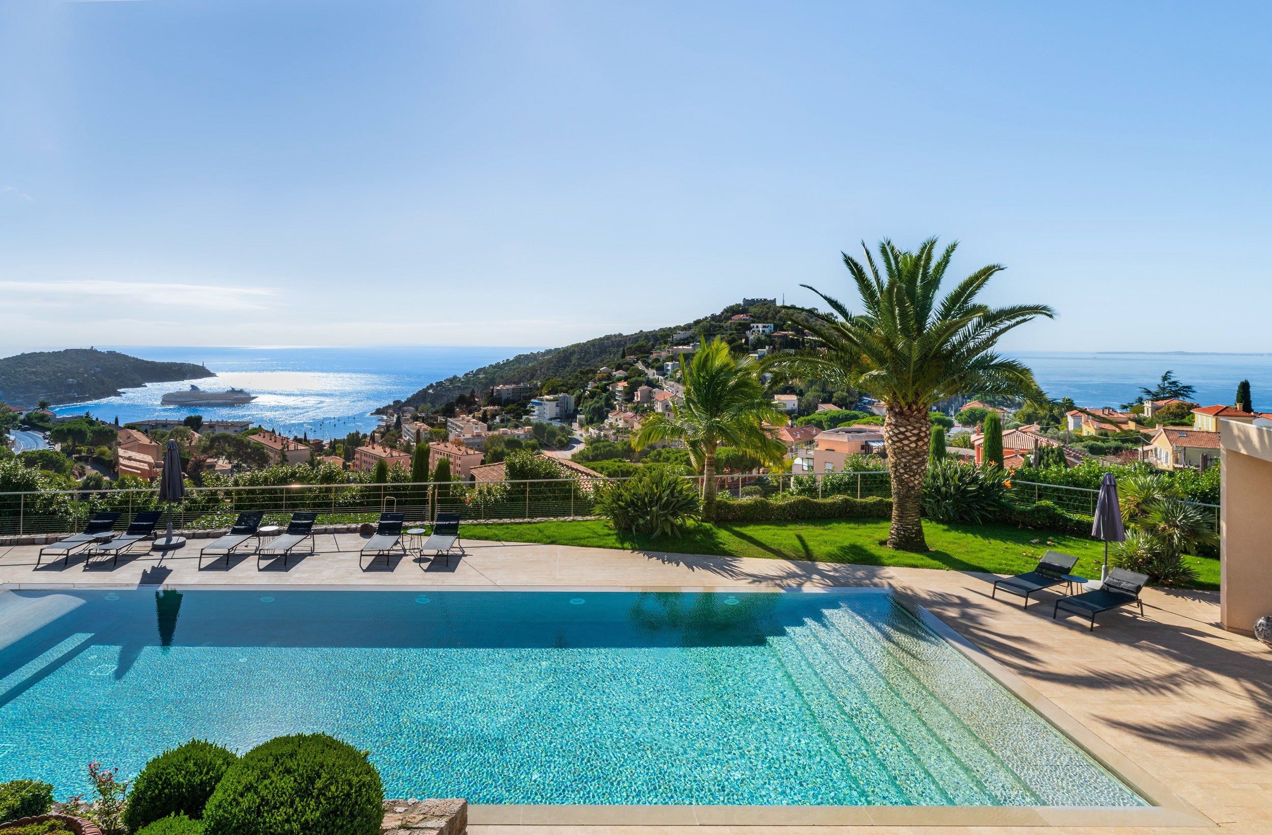The outdoor areas are designed for relaxation, with a heated infinity pool, a pool house, shaded terraces, and lovely Mediterranean gardens.