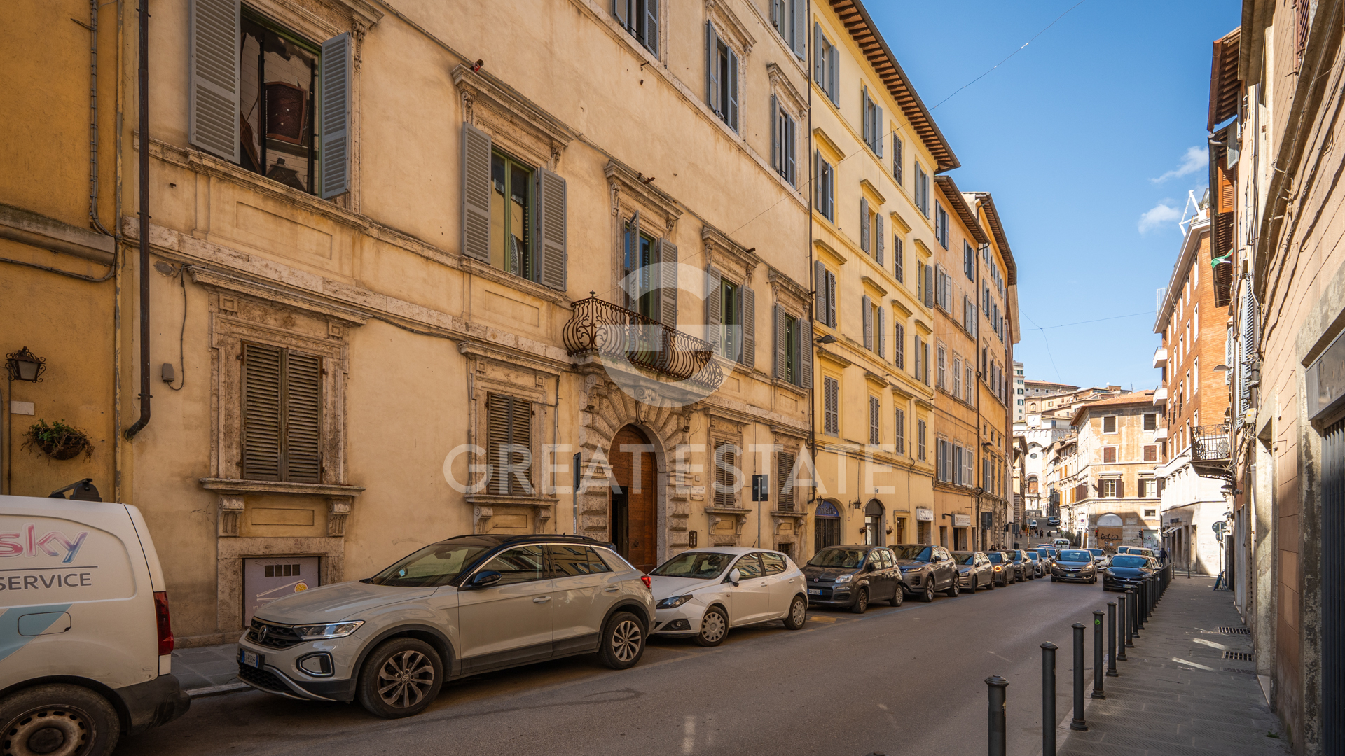 Within the historic Palazzo Baldeschi-Oddi, in the heart of Perugia old town center, we offer for sale a prestigious representative apartment, located on the piano nobile, dating back to the 16th century. The property, measuring approximately 200 cadastral square meters, was fully renovated in 2006.The residence stands out for its magnificent frescoes, predominantly from the 17th century, with later interventions from the 18th and 19th centuries, making each room unique and of extraordinary artistic value. The impressive ceiling heights, exceeding 5 meters, further enhance the nobility and monumentality of the interiors. A particularly charming feature is the enfilade layout: four spacious halls follow one another harmoniously along the same perspective axis, according to a refined Baroque-inspired design. This configuration creates striking visual vistas, amplifies natural light, and lends the rooms a grand, theatrical elegance.The property comprises five large rooms in total, in addition to a hallway separated from the main areas by an elegant glass gallery, allowing the richness of the fresco decorations to be admired from the very entrance. The layout is completed by a practical storage room and two bathrooms, finished with fine materials such as Portuguese pink marble and Iranian yellow granite. The apartment benefits from two independent entrances, a feature that offers the possibility of dividing it into two separate units, also ideal for hospitality or short-term rental use.Currently registered as an office, the property is already prepared for a simple and swift conversion to residential use, subject to change of use approval.The renovation, carried out with great attention to detail and under the supervision of the Cultural Heritage Authority, enhanced the original materials while integrating modern solutions: teak parquet flooring, elm baseboards, and wooden window frames with double glazing, ensuring excellent acoustic insulation. The result is a perfect balance between history, elegance, and contemporary comfort.The building itself has recently undergone refurbishment, including works on the facade and roof, as well as the installation of a modern elevator.