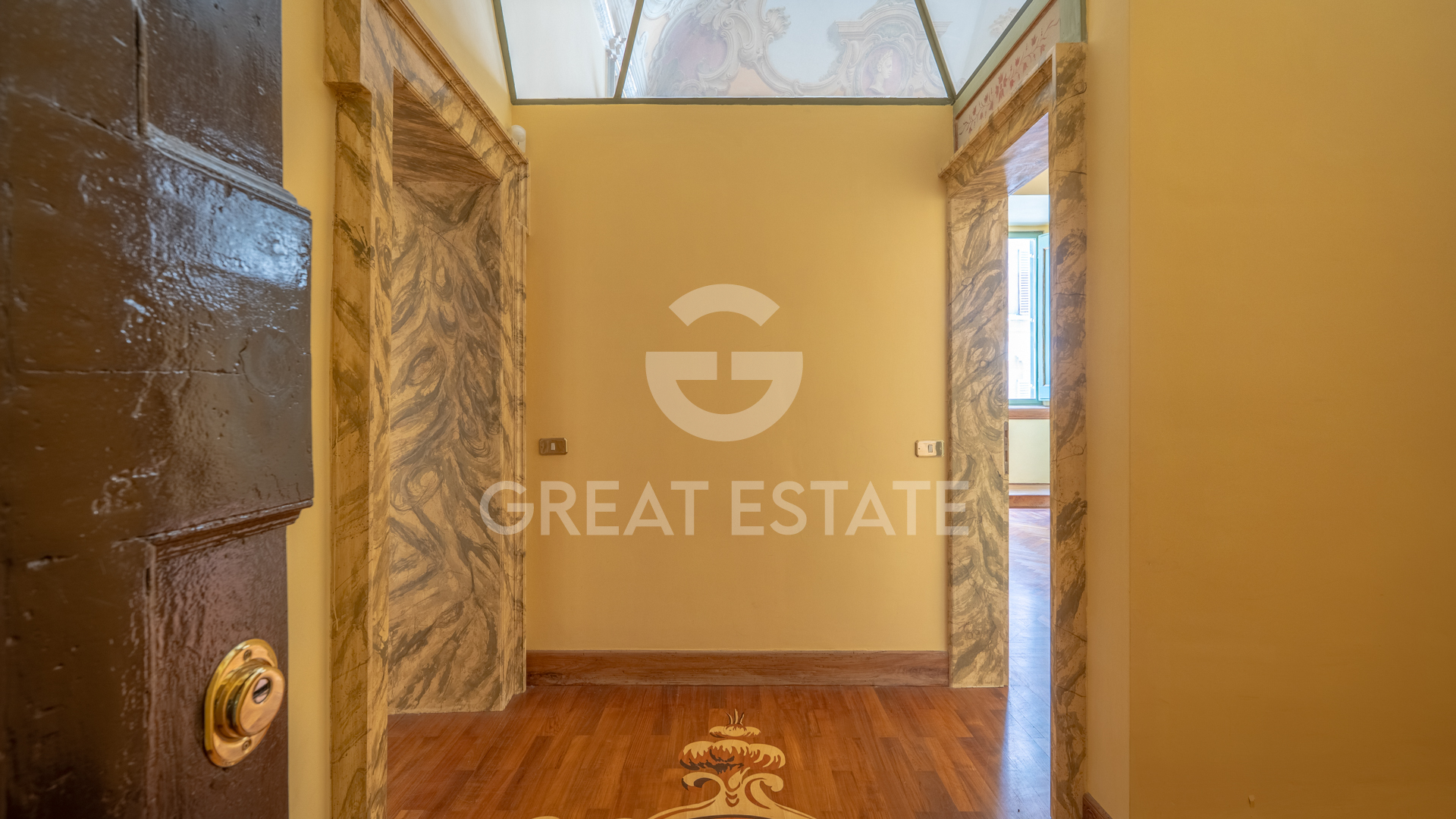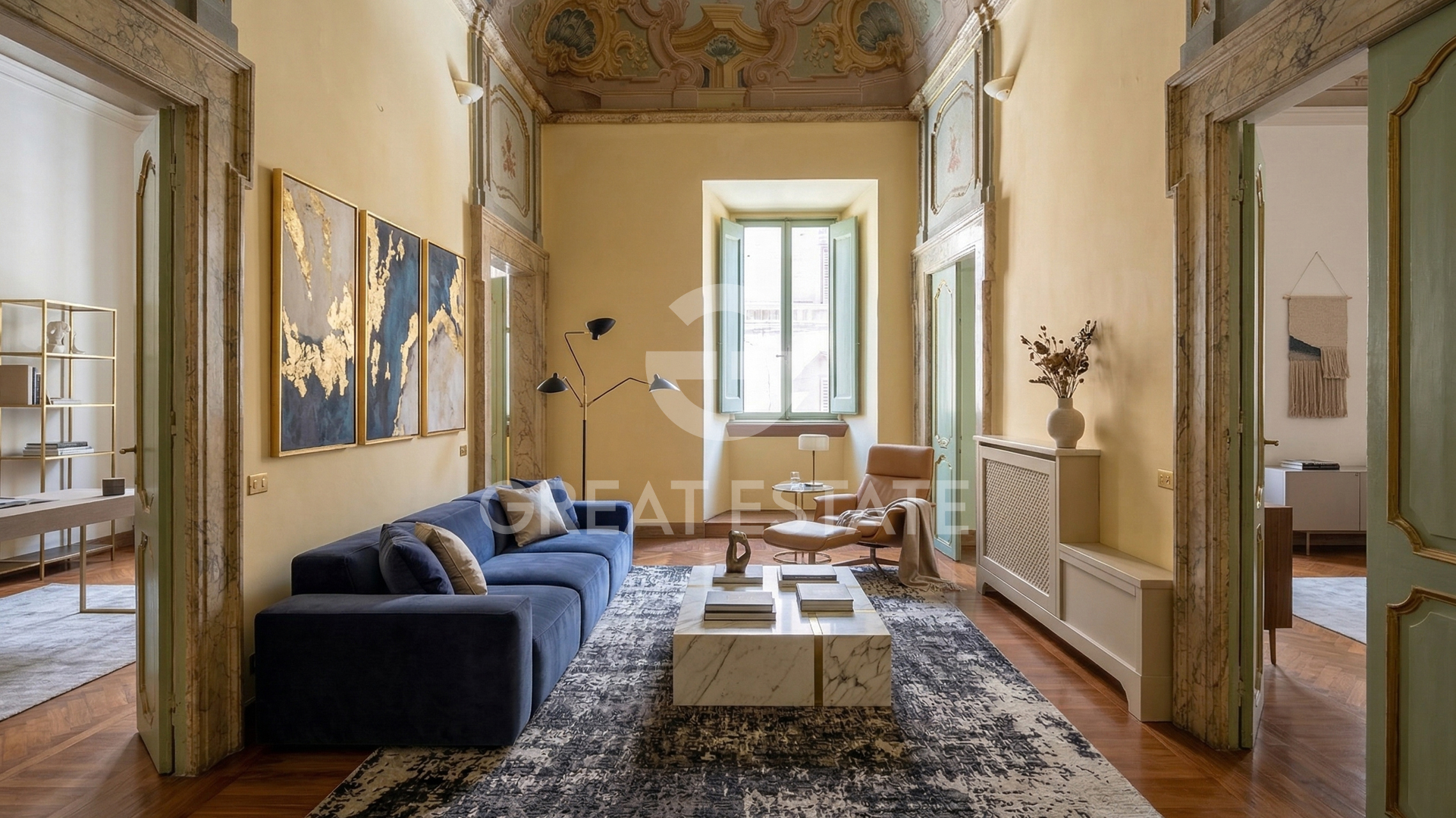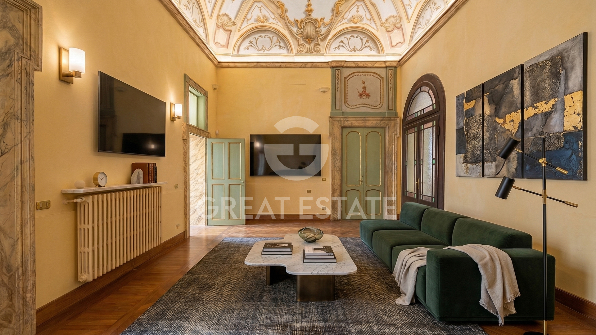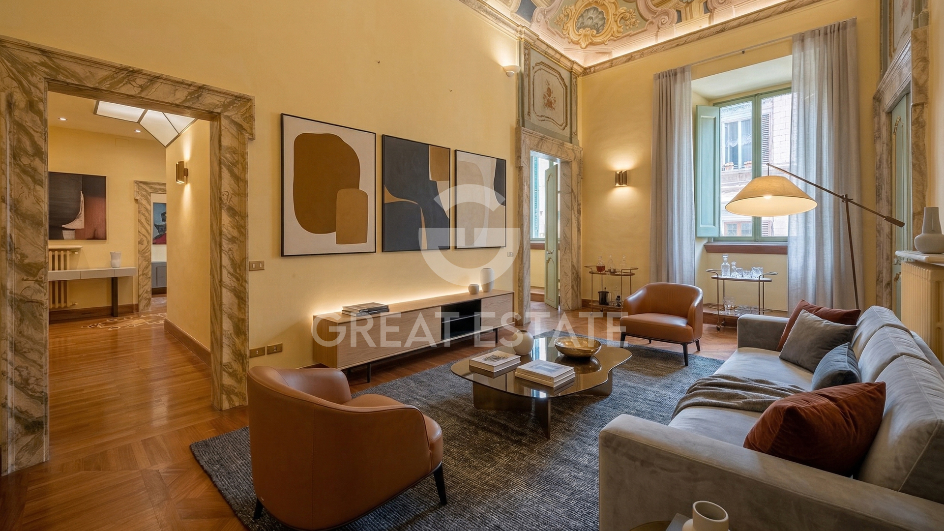 The apartment is presented in exellent condition thanks to a complete and conservative restoration carried out under the direct supervision of the Cultural Heritage Authority.Among its distinctive features are ceilings over 5 meters high, entirely frescoed, sorbo wood window frames with double glazing, teak flooring laid in a herringbone pattern with border inlay, antique painted and gilded doors, and elm wood baseboards.Every detail has been carefully curated to enhance the historic authenticity of the property, while seamlessly incorporating modern comfort.