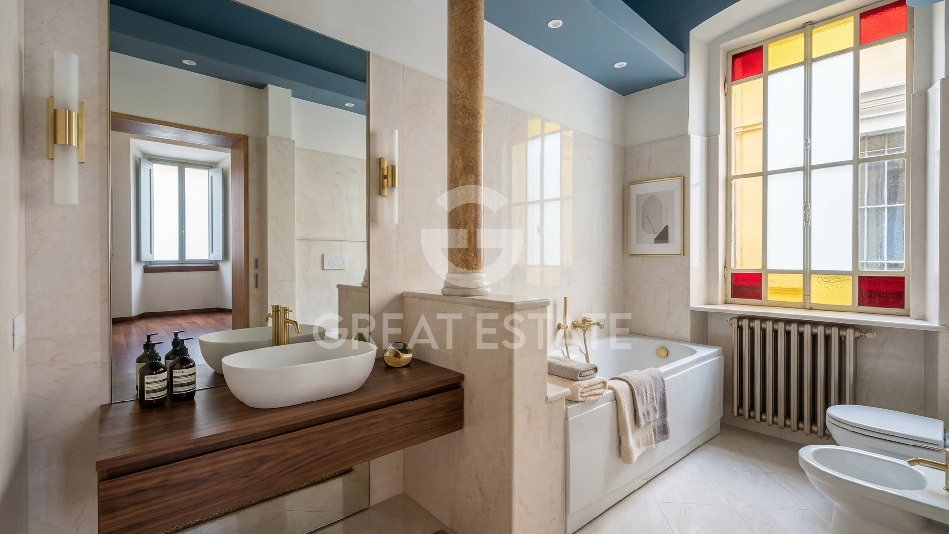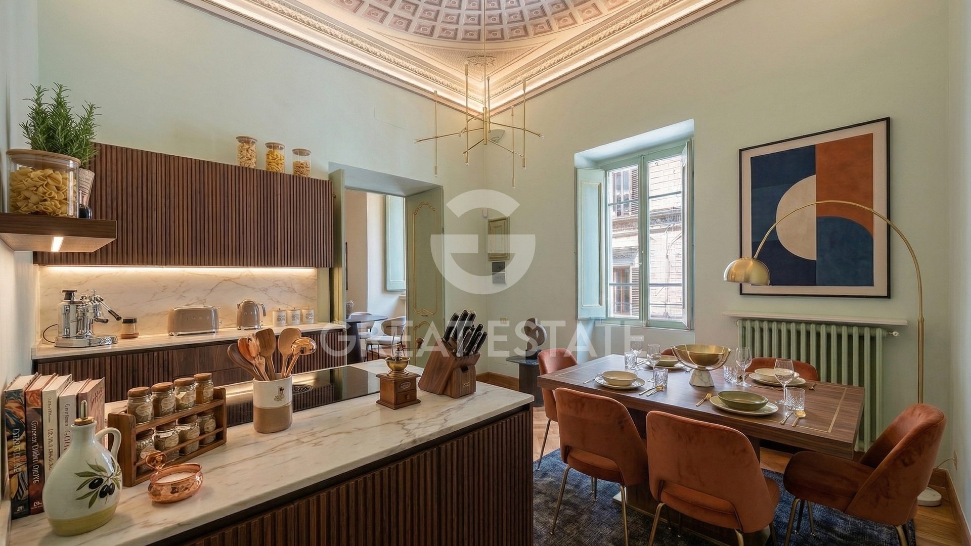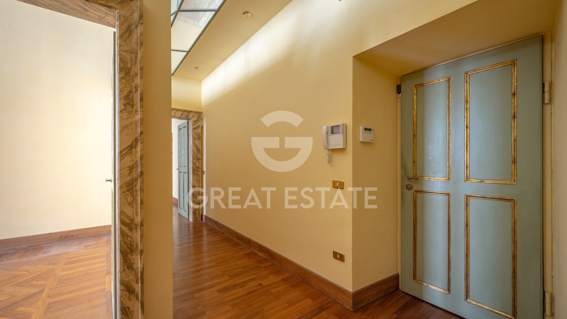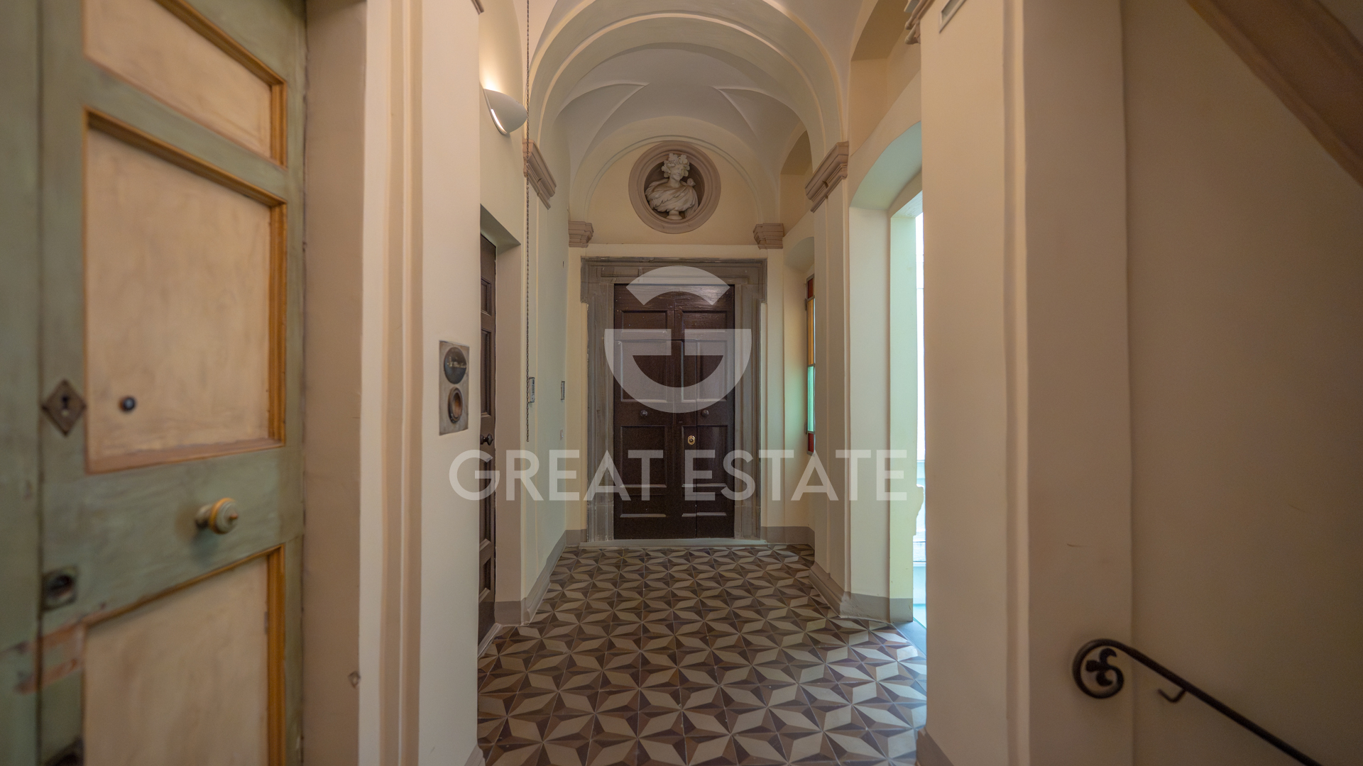 The apartment is presented in exellent condition thanks to a complete and conservative restoration carried out under the direct supervision of the Cultural Heritage Authority.Among its distinctive features are ceilings over 5 meters high, entirely frescoed, sorbo wood window frames with double glazing, teak flooring laid in a herringbone pattern with border inlay, antique painted and gilded doors, and elm wood baseboards.Every detail has been carefully curated to enhance the historic authenticity of the property, while seamlessly incorporating modern comfort.