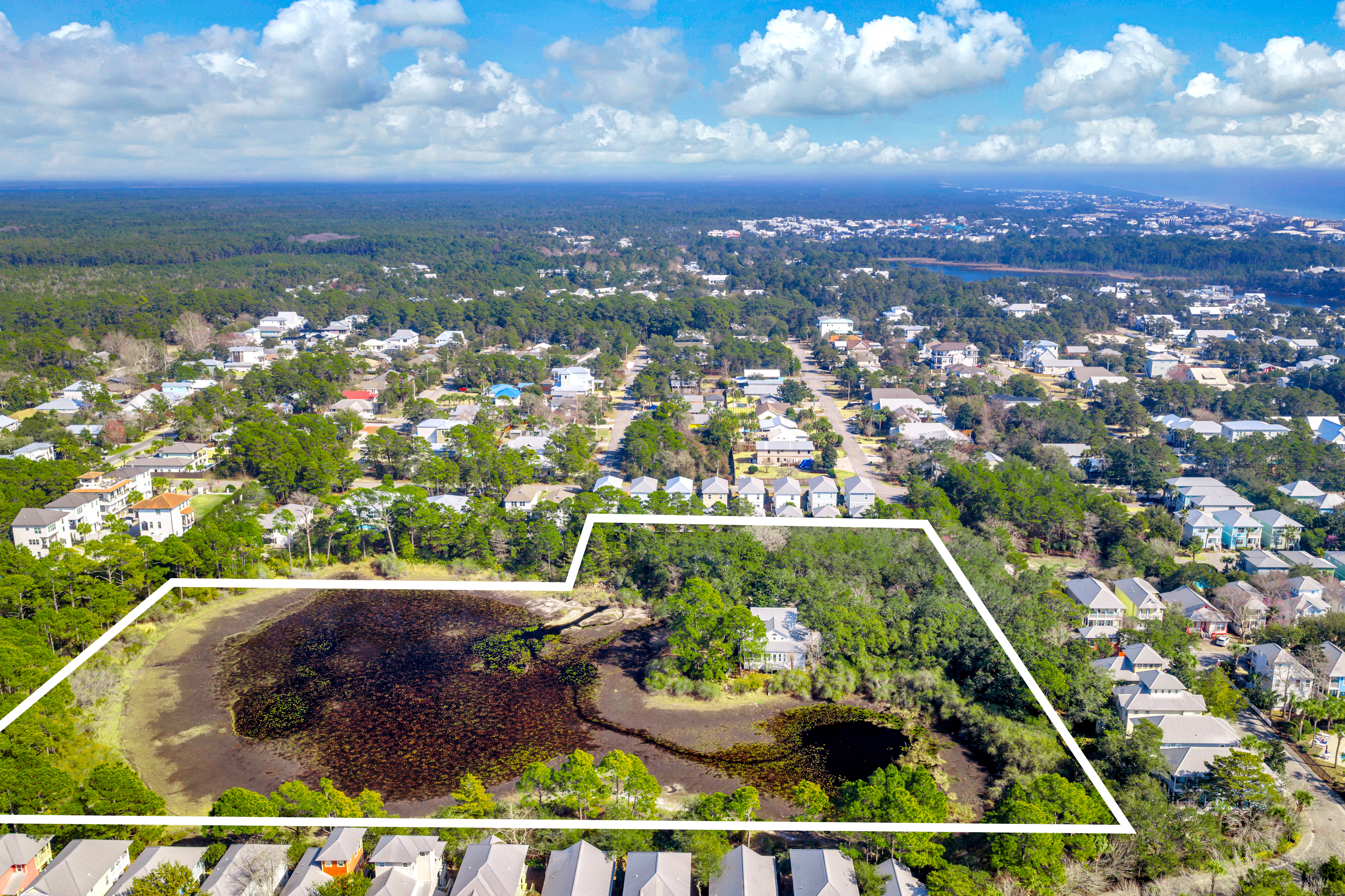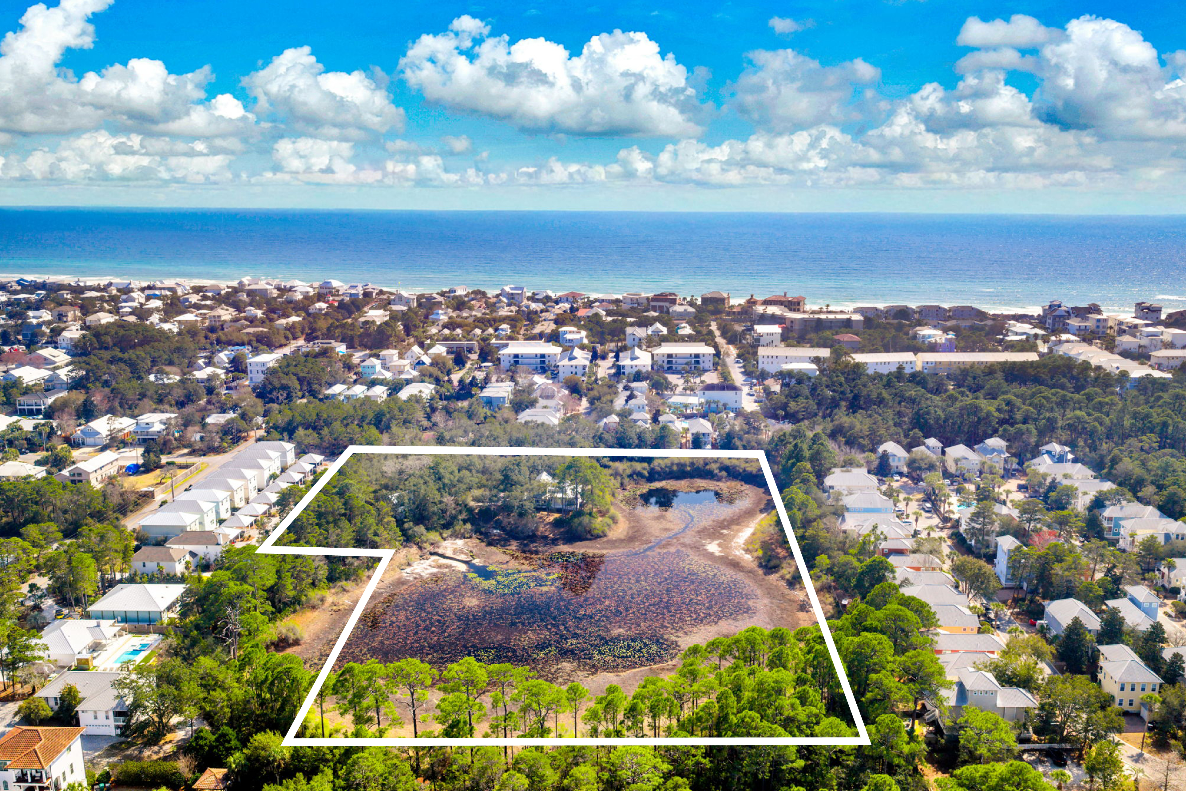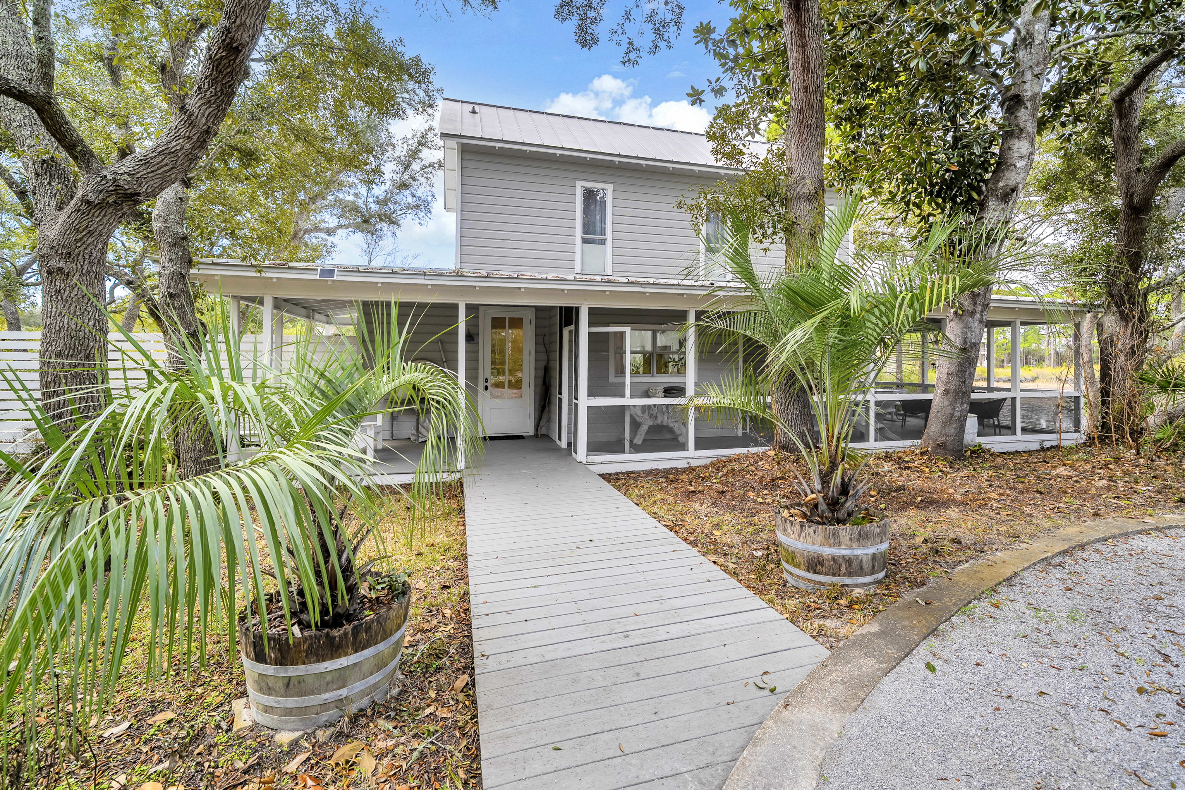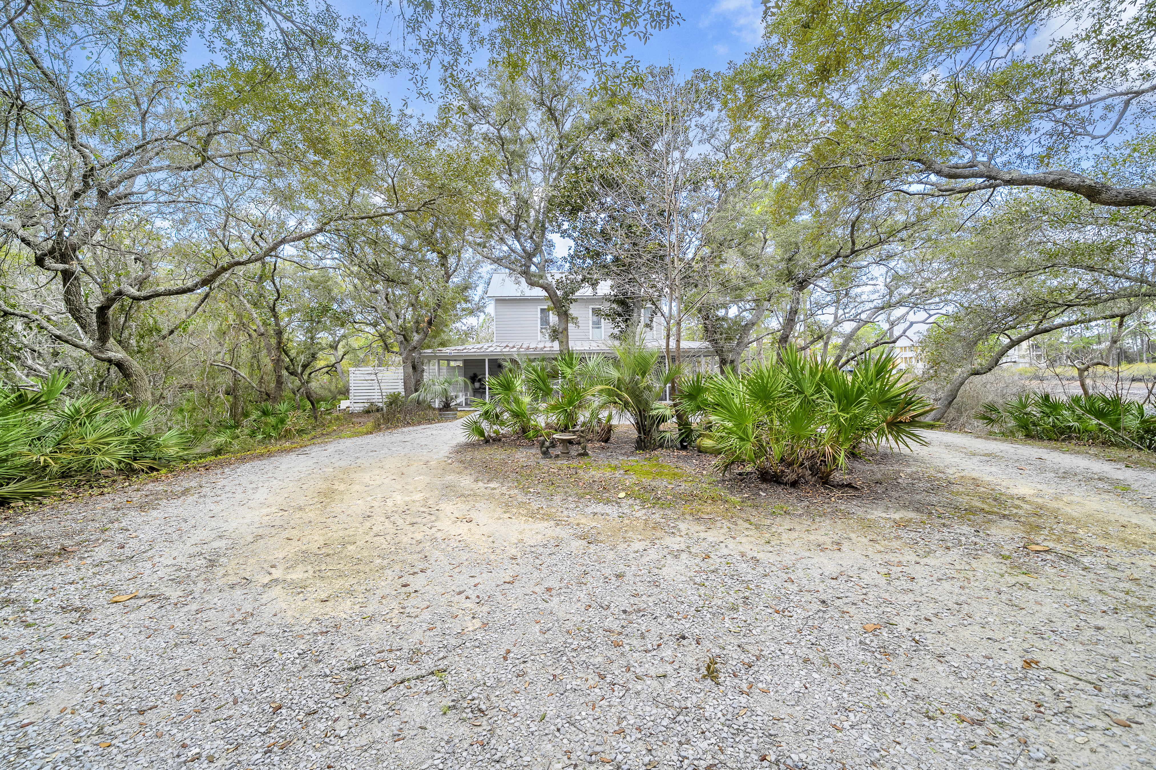 Tucked away from the noise of the world, yet uniquely positioned in Blue Mountain and only three blocks to the Gulf of Mexico, this extraordinary six-acre sanctuary is a living, breathing landscape where time moves differently and the ordinary weight of daily life simply falls away. At its heart lies a three-acre spring-fed lake, its water so clear and still on quiet mornings that the ancient live oaks surrounding it see their own reflection. And those oaks — they are the true soul of this place. Centuries old, draped in cascading Spanish moss, their cathedral arms stretch wide enough to shelter generations. Standing beneath them is a charming 2200 sf coastal cottage that has been showcased in various magazines with views of the lake from every room. The property also boasts an artist's studio, and a shed.