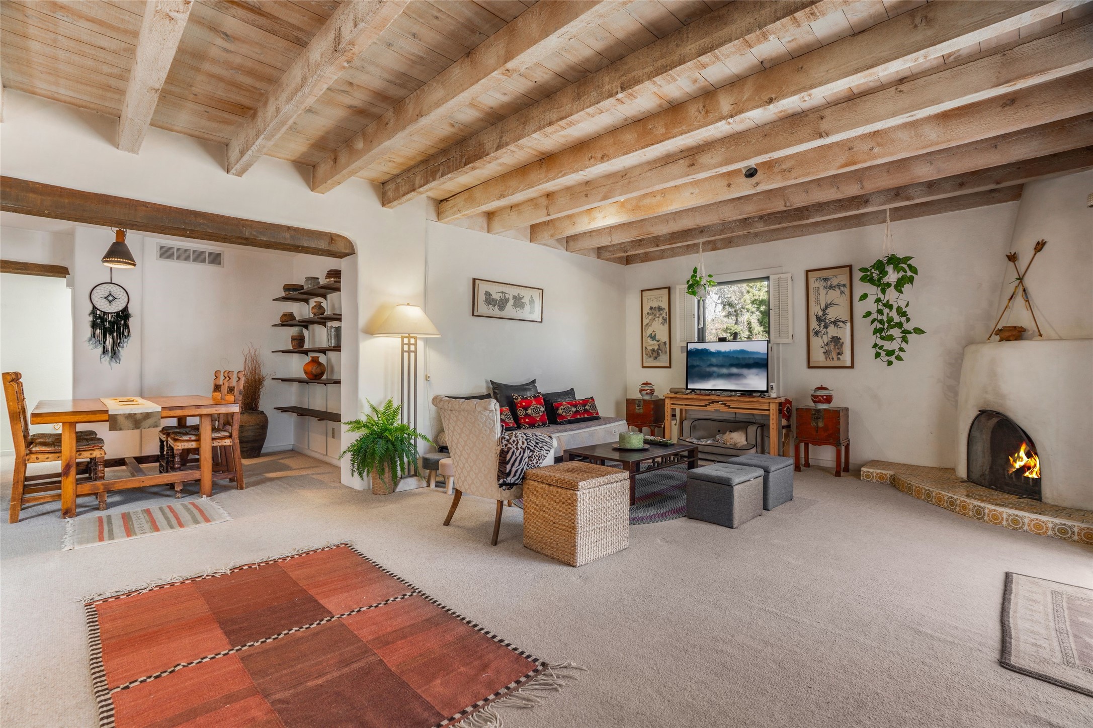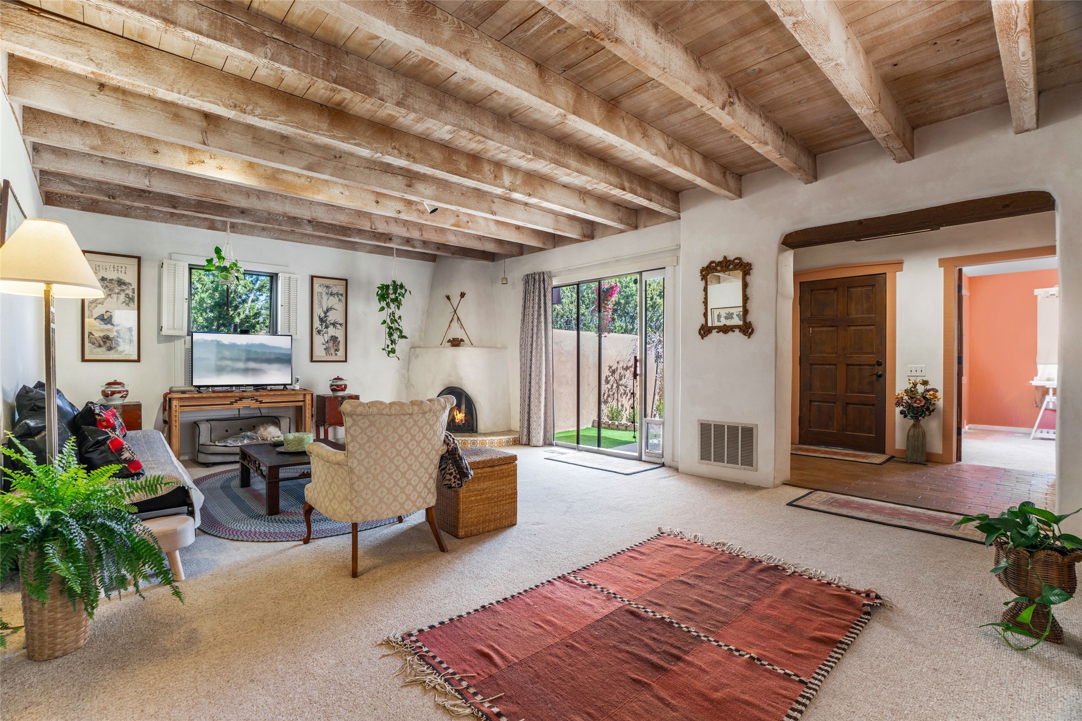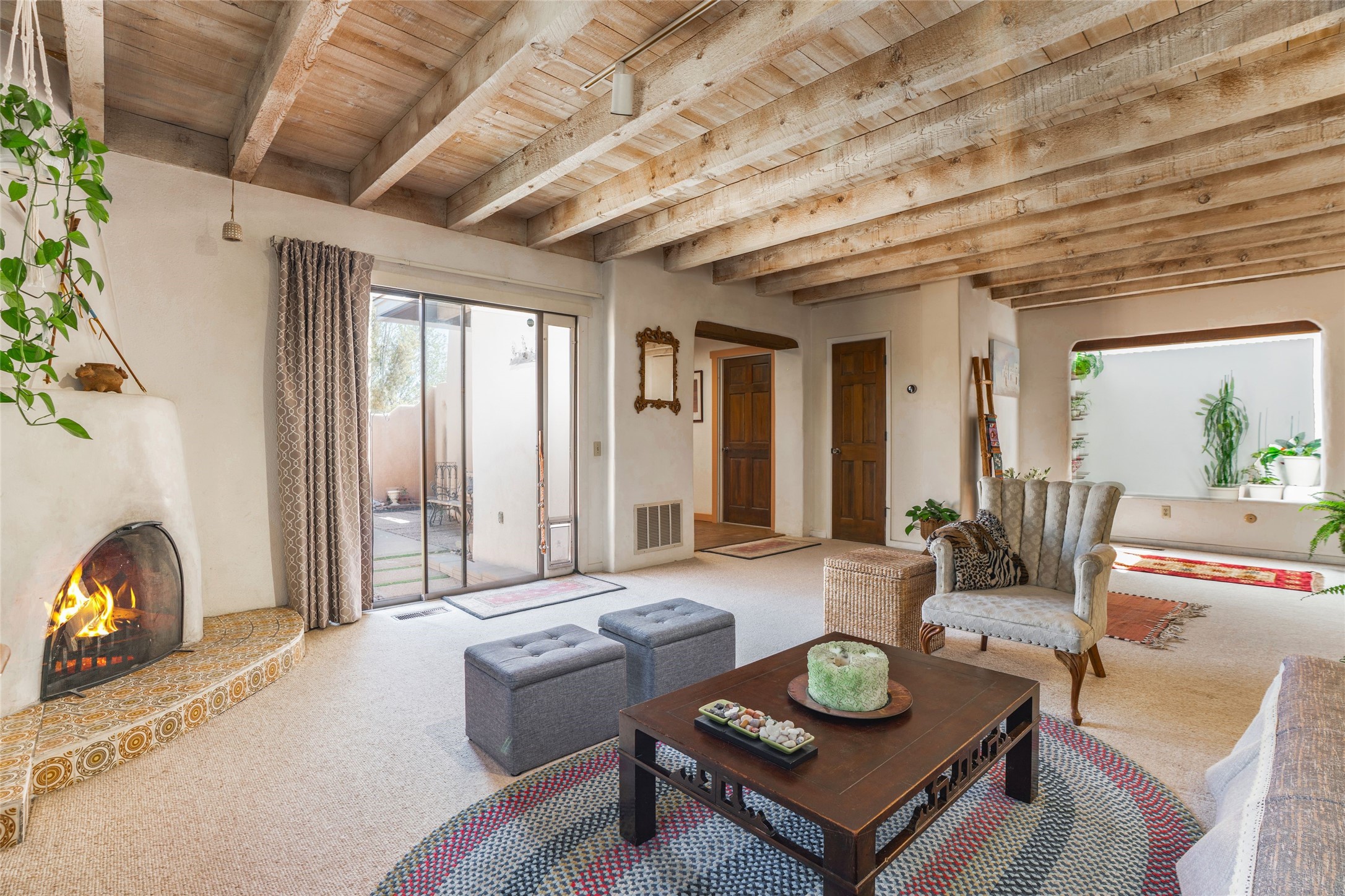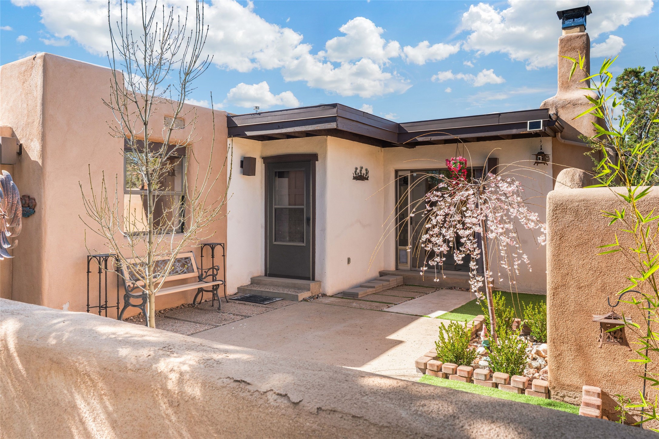 Desirable Northside single-level corner-unit condo with timeless Pueblo character, abundant natural light, and spacious living areas. Enter through a charming walled courtyard, where a blooming cherry blossom tree adds seasonal beauty to the approach. Inside, a dramatic skylit atrium forms the heart of the home, beautifully framed by a large architectural opening from the living room that creates a signature focal point. Exposed beams throughout, banco seating, sculptural stepped Pueblo-style forms, and a kiva wood-burning fireplace bring warmth and authentic Santa Fe character. The southeast-facing orientation welcomes the first light of sunrise onto the living room floor, while moonlight through the atrium adds a rare sense of calm and beauty at night. The thoughtfully separated bedroom layout offers comfort and flexibility, and the attached one-car garage provides additional storage. This property has been lovingly maintained and is priced accordingly for expected renovations. Ideally situated on Santa Fe’s coveted Northside, the home enjoys a setting that offers both tranquility and convenient access to the Plaza, the Santa Fe Opera, and Ski Santa Fe, along with the quiet pleasure of frequent deer sightings that add to the natural beauty of the neighborhood.