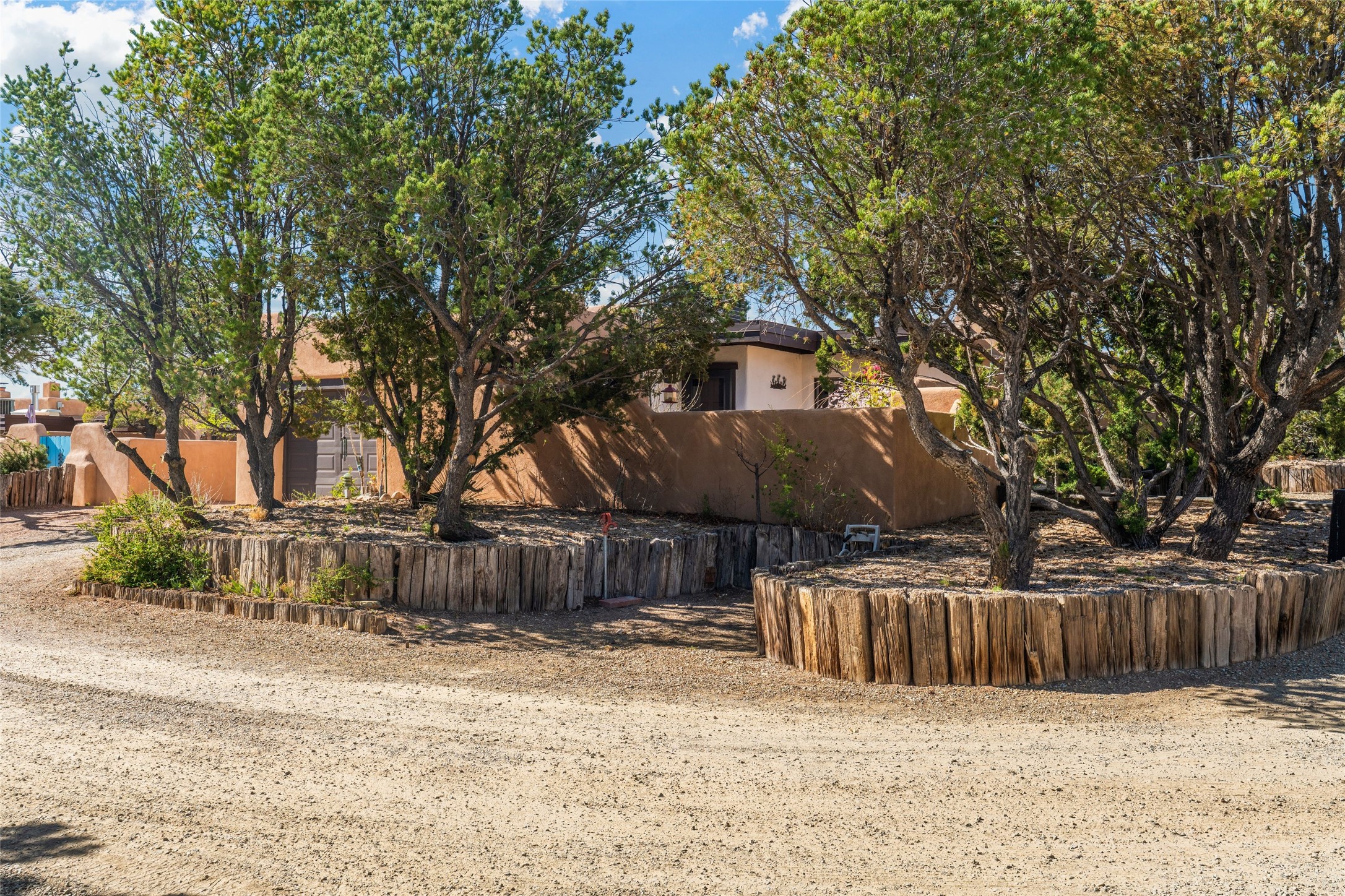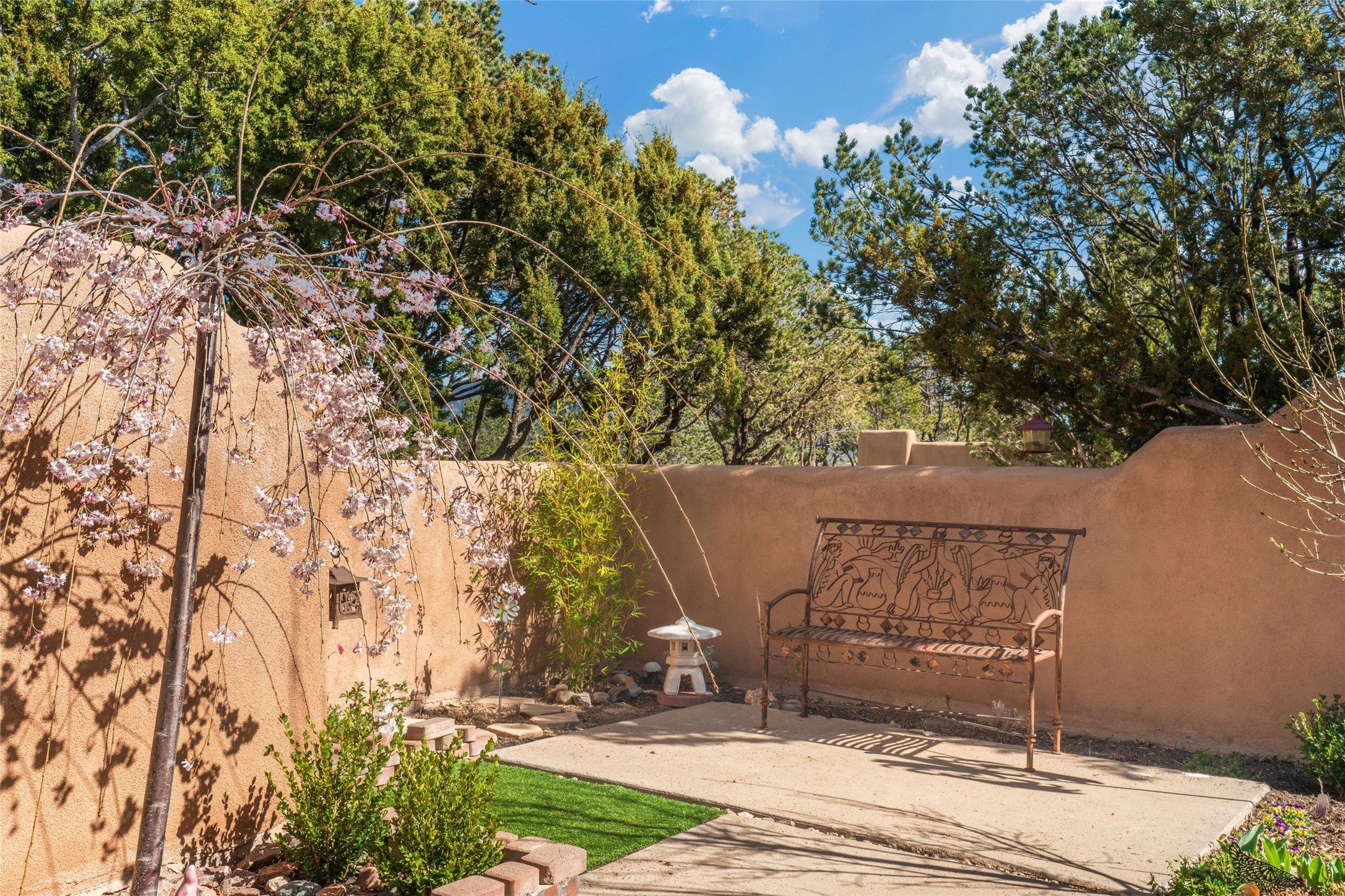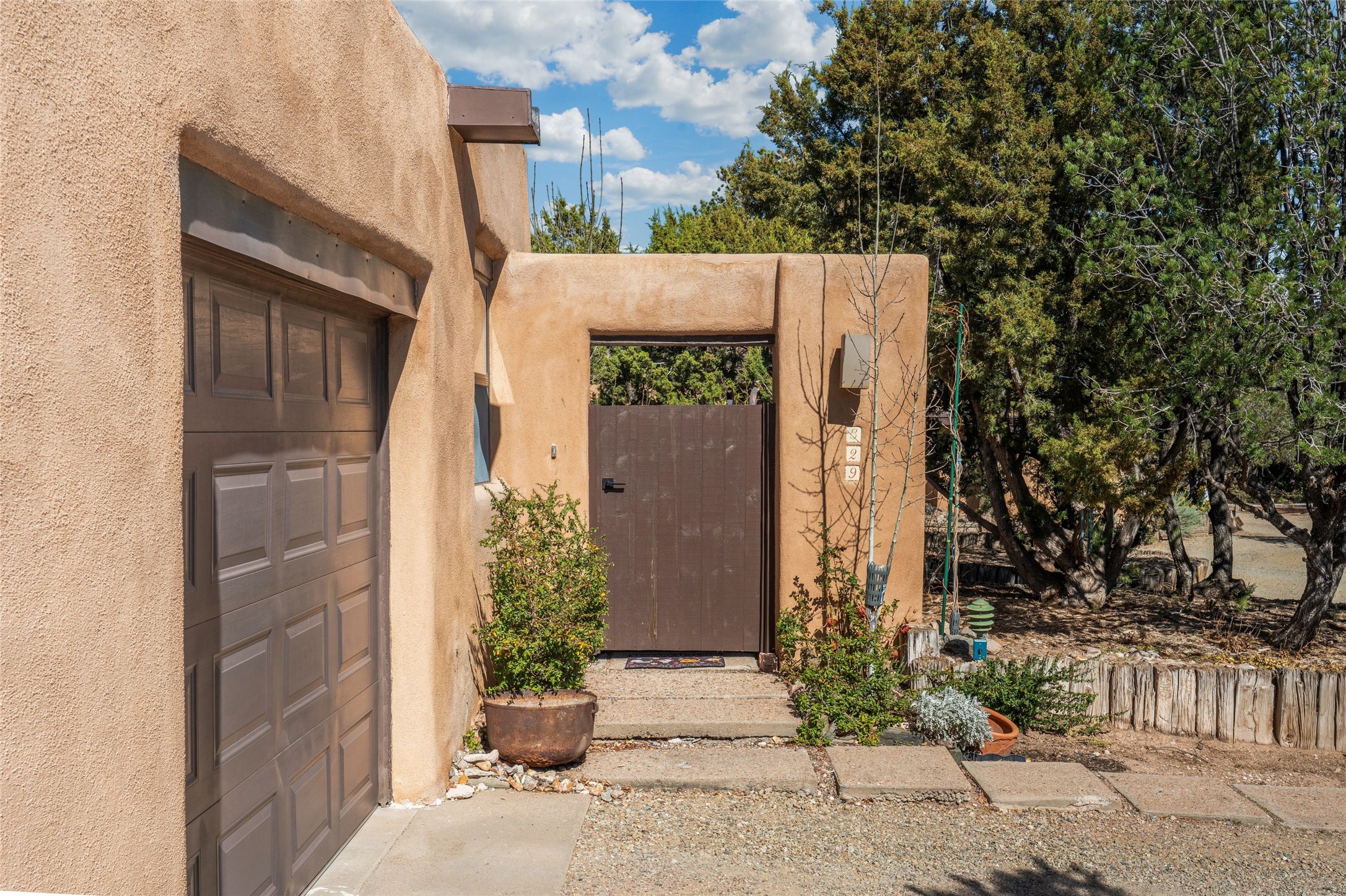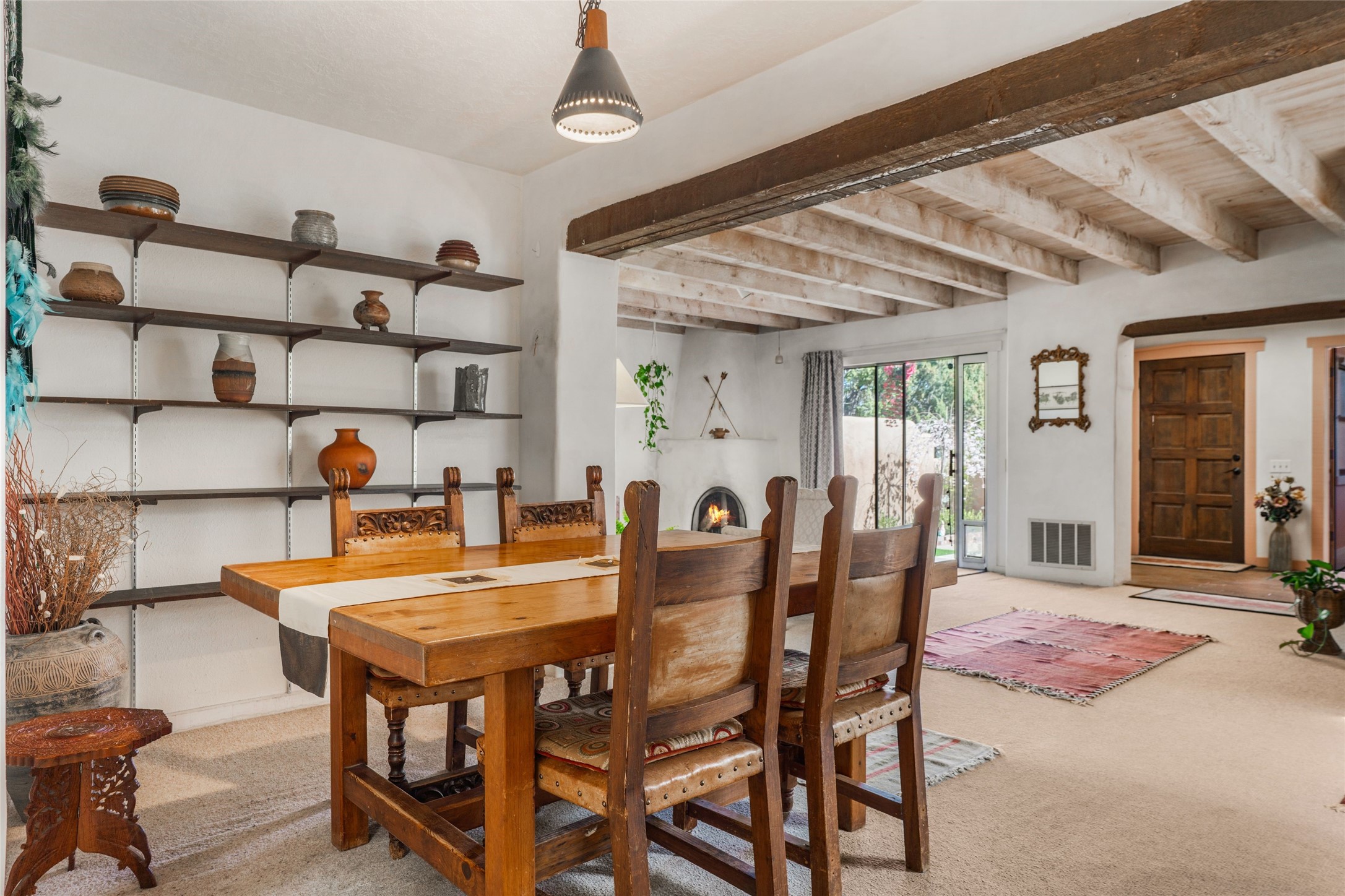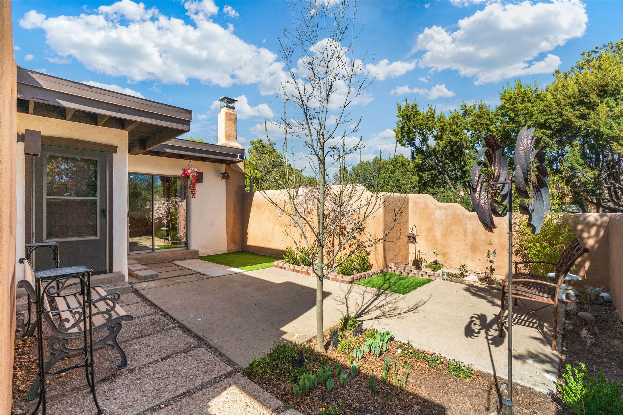 Desirable Northside single-level corner-unit condo with timeless Pueblo character, abundant natural light, and spacious living areas. Enter through a charming walled courtyard, where a blooming cherry blossom tree adds seasonal beauty to the approach. Inside, a dramatic skylit atrium forms the heart of the home, beautifully framed by a large architectural opening from the living room that creates a signature focal point. Exposed beams throughout, banco seating, sculptural stepped Pueblo-style forms, and a kiva wood-burning fireplace bring warmth and authentic Santa Fe character. The southeast-facing orientation welcomes the first light of sunrise onto the living room floor, while moonlight through the atrium adds a rare sense of calm and beauty at night. The thoughtfully separated bedroom layout offers comfort and flexibility, and the attached one-car garage provides additional storage. This property has been lovingly maintained and is priced accordingly for expected renovations. Ideally situated on Santa Fe’s coveted Northside, the home enjoys a setting that offers both tranquility and convenient access to the Plaza, the Santa Fe Opera, and Ski Santa Fe, along with the quiet pleasure of frequent deer sightings that add to the natural beauty of the neighborhood.