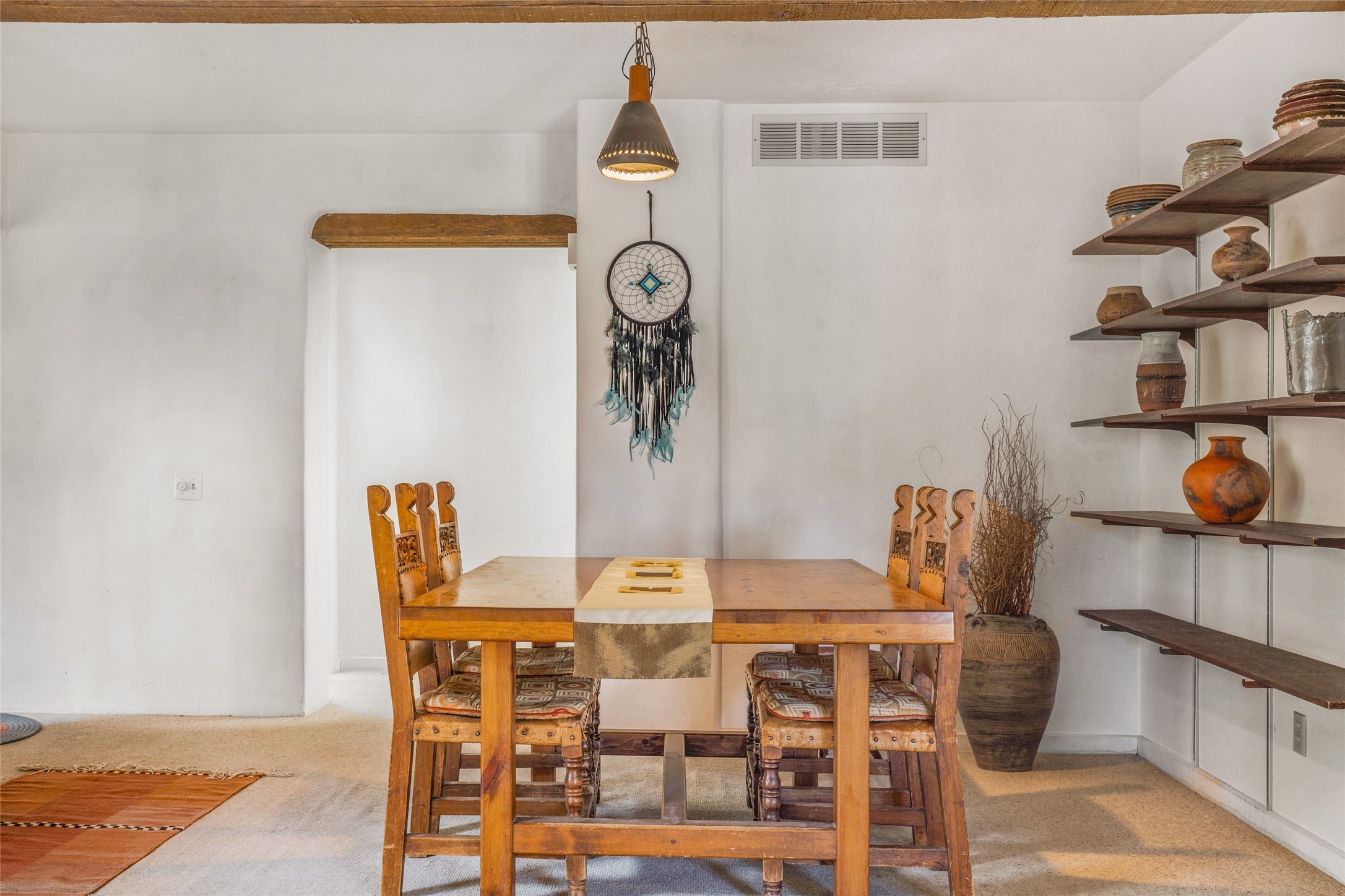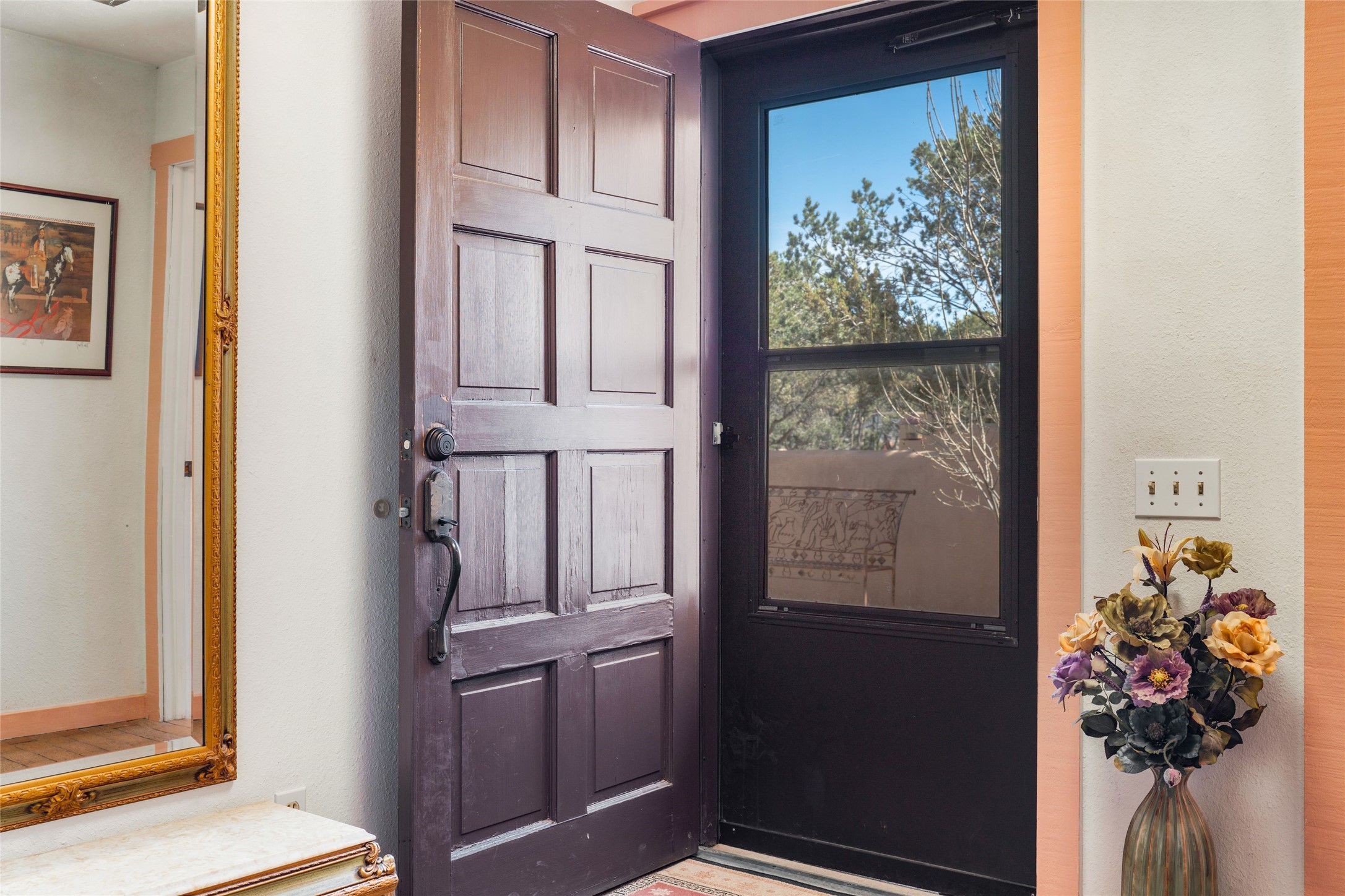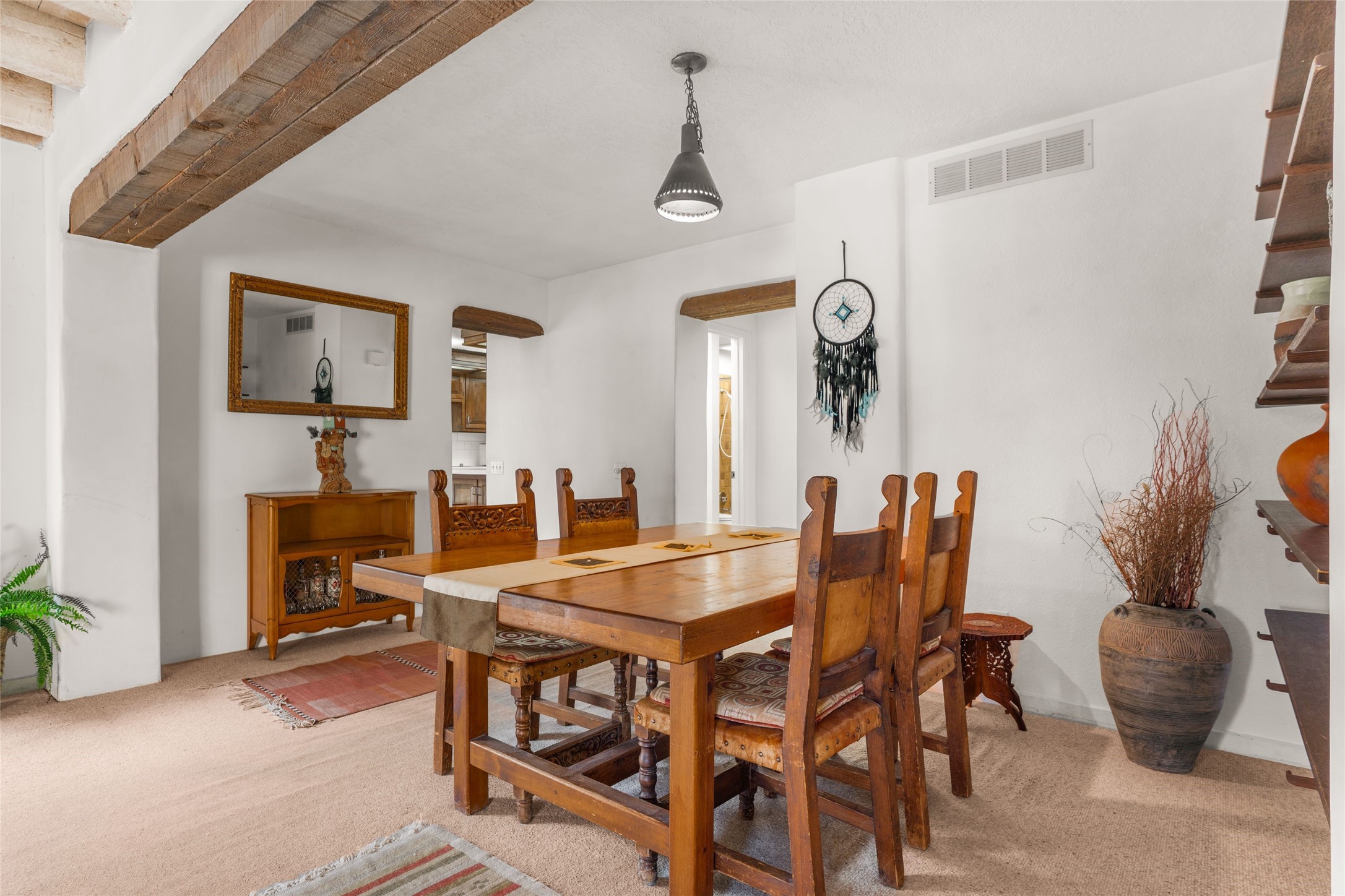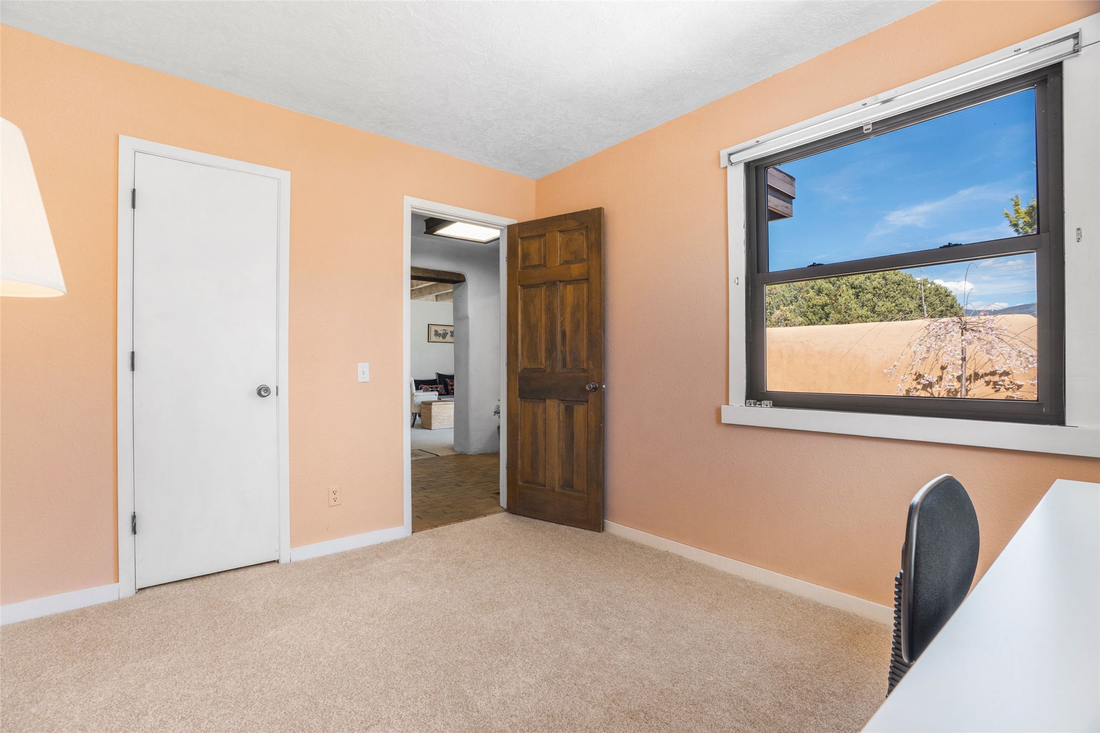 Desirable Northside single-level corner-unit condo with timeless Pueblo character, abundant natural light, and spacious living areas. Enter through a charming walled courtyard, where a blooming cherry blossom tree adds seasonal beauty to the approach. Inside, a dramatic skylit atrium forms the heart of the home, beautifully framed by a large architectural opening from the living room that creates a signature focal point. Exposed beams throughout, banco seating, sculptural stepped Pueblo-style forms, and a kiva wood-burning fireplace bring warmth and authentic Santa Fe character. The southeast-facing orientation welcomes the first light of sunrise onto the living room floor, while moonlight through the atrium adds a rare sense of calm and beauty at night. The thoughtfully separated bedroom layout offers comfort and flexibility, and the attached one-car garage provides additional storage. This property has been lovingly maintained and is priced accordingly for expected renovations. Ideally situated on Santa Fe’s coveted Northside, the home enjoys a setting that offers both tranquility and convenient access to the Plaza, the Santa Fe Opera, and Ski Santa Fe, along with the quiet pleasure of frequent deer sightings that add to the natural beauty of the neighborhood.