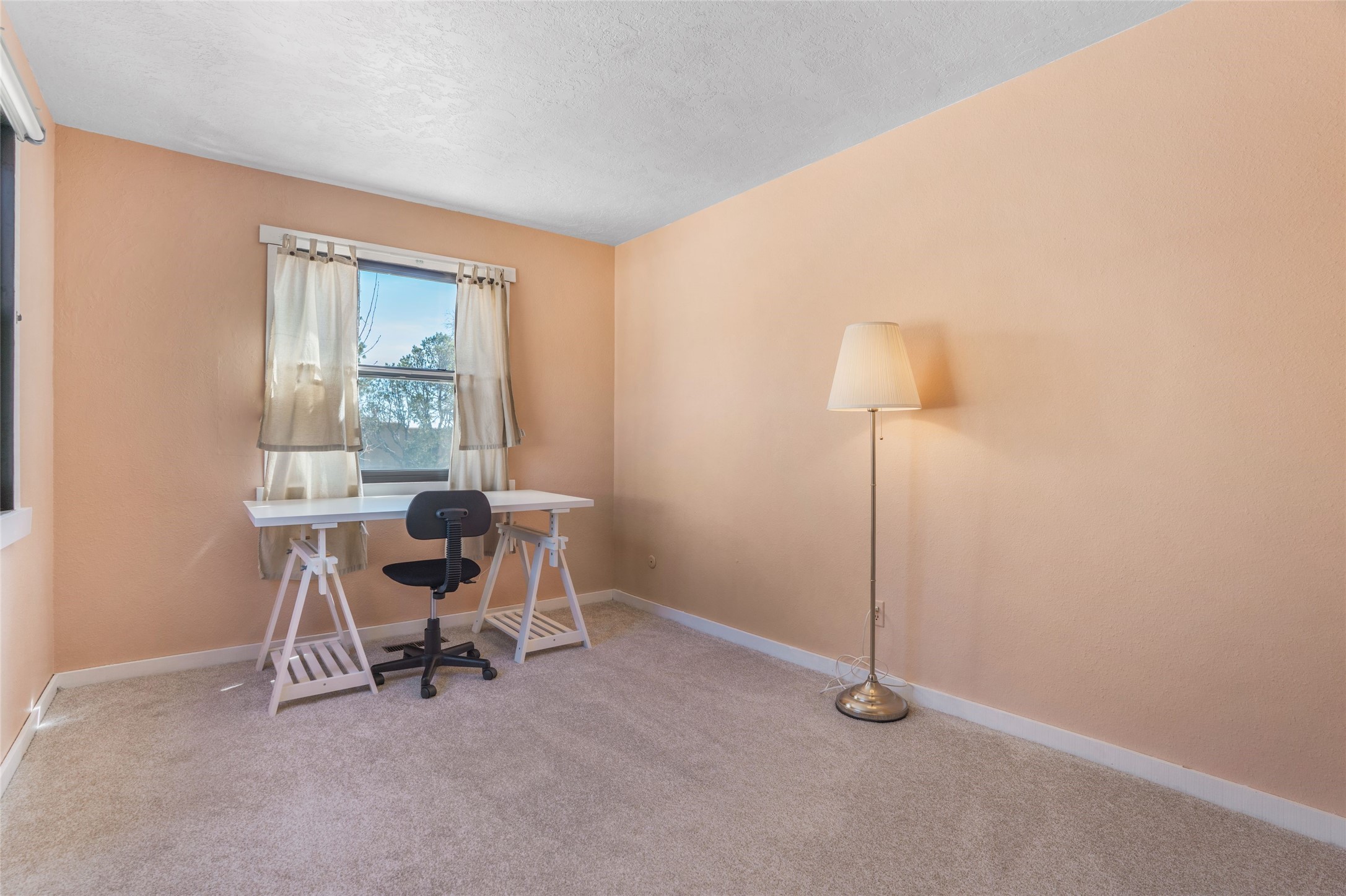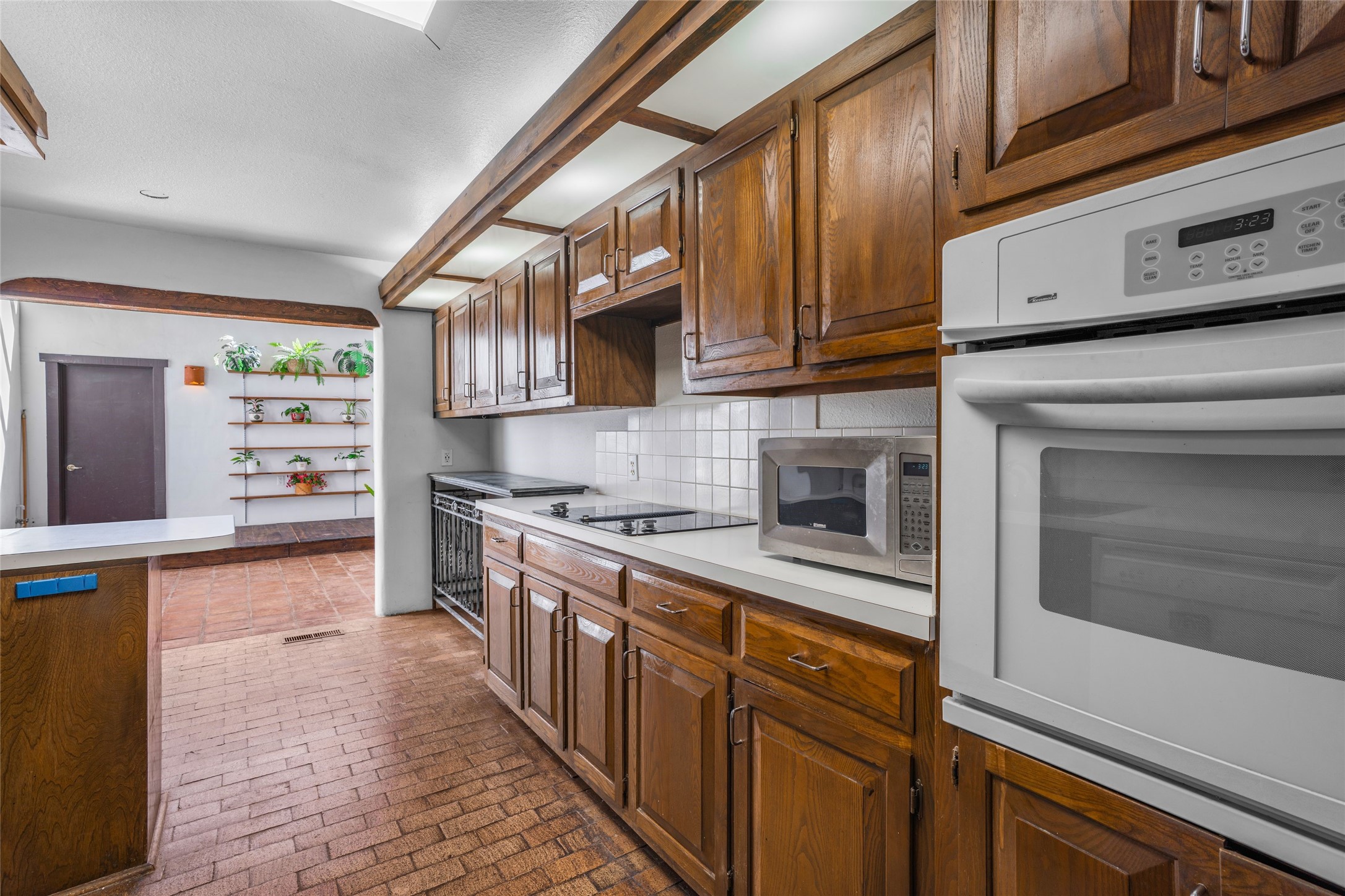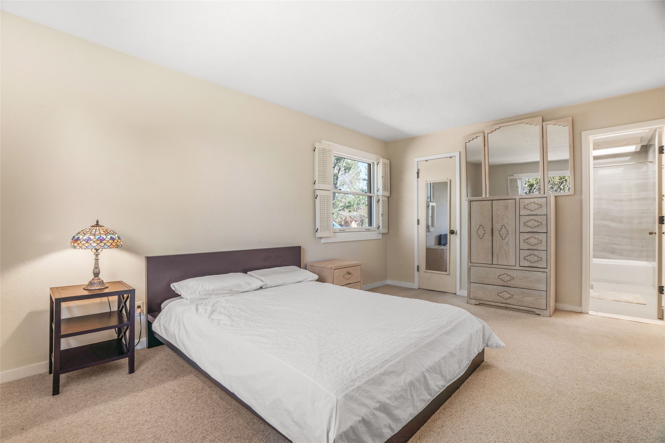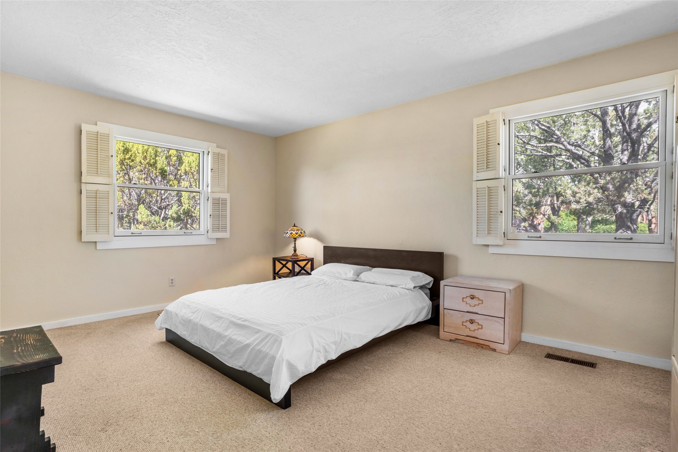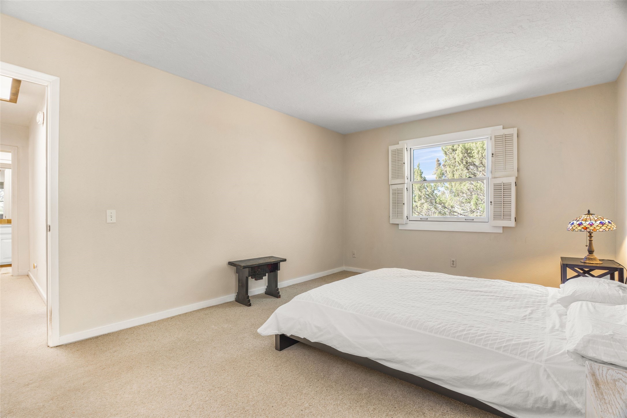 Desirable Northside single-level corner-unit condo with timeless Pueblo character, abundant natural light, and spacious living areas. Enter through a charming walled courtyard, where a blooming cherry blossom tree adds seasonal beauty to the approach. Inside, a dramatic skylit atrium forms the heart of the home, beautifully framed by a large architectural opening from the living room that creates a signature focal point. Exposed beams throughout, banco seating, sculptural stepped Pueblo-style forms, and a kiva wood-burning fireplace bring warmth and authentic Santa Fe character. The southeast-facing orientation welcomes the first light of sunrise onto the living room floor, while moonlight through the atrium adds a rare sense of calm and beauty at night. The thoughtfully separated bedroom layout offers comfort and flexibility, and the attached one-car garage provides additional storage. This property has been lovingly maintained and is priced accordingly for expected renovations. Ideally situated on Santa Fe’s coveted Northside, the home enjoys a setting that offers both tranquility and convenient access to the Plaza, the Santa Fe Opera, and Ski Santa Fe, along with the quiet pleasure of frequent deer sightings that add to the natural beauty of the neighborhood.