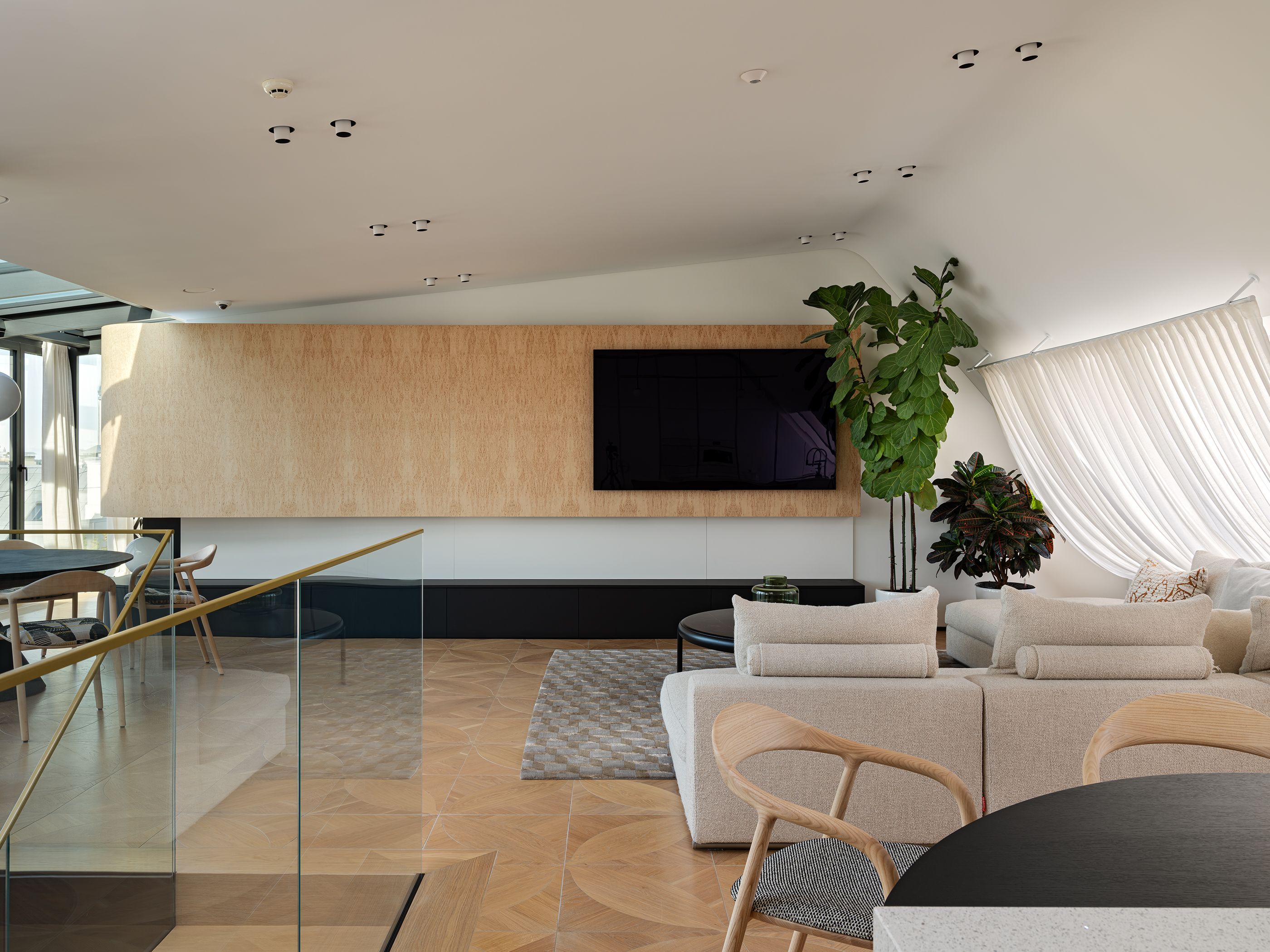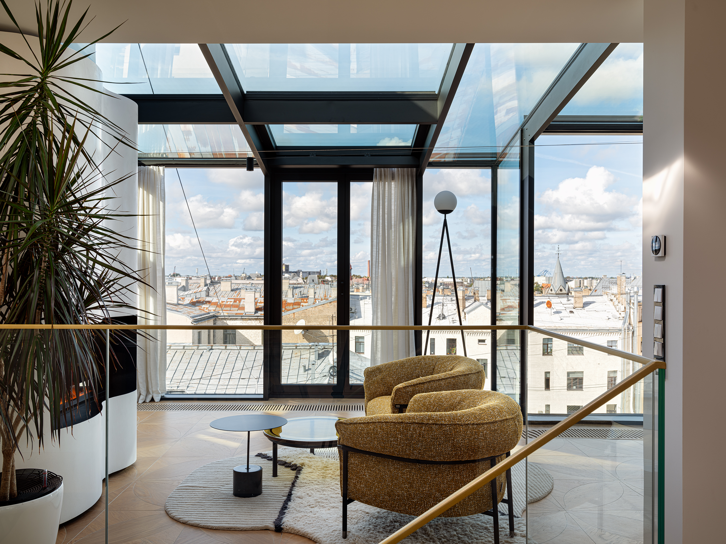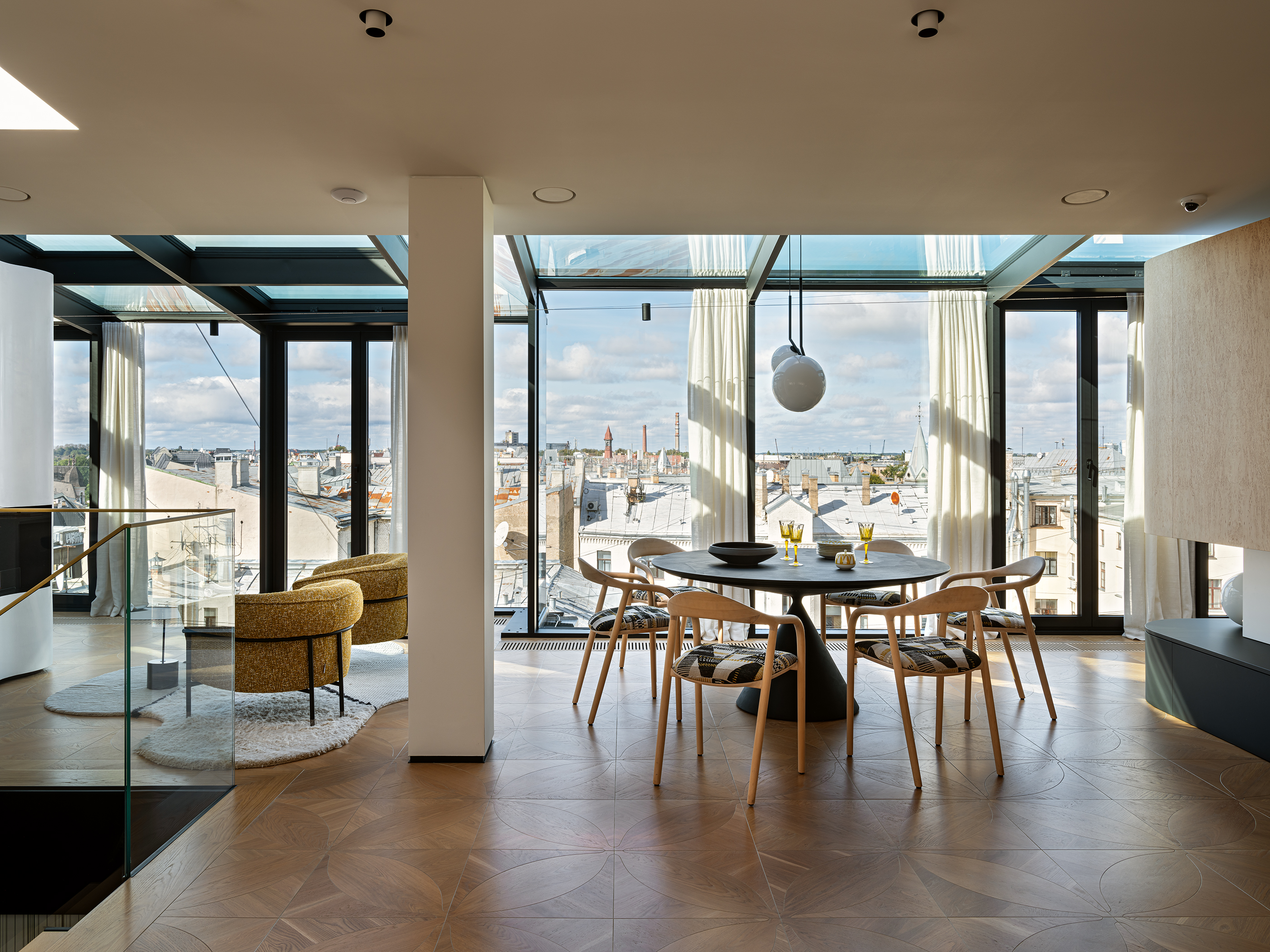 A two-level penthouse apartment in the TAL Residences project offers a spacious and functional living environment in Riga’s Quiet Centre. The total area of the apartment is 325.9 m², of which 275.6 m² is interior space, complemented by multiple outdoor areas designed for comfortable city living. The apartment is arranged across two levels. The upper floor features a spacious living area with a kitchen and panoramic windows overlooking Riga’s rooftops, creating a bright and open atmosphere suitable for everyday living and entertaining. The lower floor includes four bedrooms, providing ample space for a family or for separating work and leisure areas. This level also offers two terraces and two balconies, extending the living space and allowing for private outdoor enjoyment in the city centre. A video surveillance system is installed in the apartment for additional security. The interior features high-quality furniture and finishing materials, including Karelian birch, eucalyptus, Fenix surfaces, and bird’s-eye figured wood. The apartment is furnished with lighting and furniture from recognized design brands — Hästens, Maxalto, Flexform, Meridiani, B&B Italia, Desalto, Bonaldo, Vitra, CTO Lighting, and Flos — as well as textile elements by Pierre Frey and CC-Tapis. The building provides security services, and the Michelin Guide-listed restaurant “Snatch” is located on the ground floor. The price includes two parking spaces, adding convenience in the city centre. This property combines a well-thought-out layout, high-quality equipment, and a prestigious location, offering a comfortable and secure living environment in a major city.
