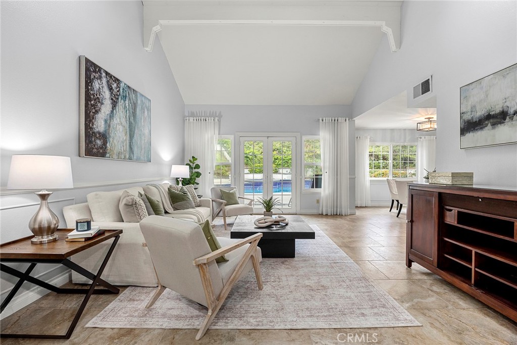This beautifully updated Cape Cod-inspired home blends timeless charm with modern comfort, offering the ease of mostly single-story living with a highly sought-after downstairs primary suite. From the moment you step inside, sleek tile flooring guides you into a stunning living room with soaring ceilings and a dramatic wall of windows that flood the space with natural light while showcasing serene views of the backyard. A dry bar with a wine fridge is accessible from the living and formal dining room. The updated kitchen is both stylish and functional, featuring sleek granite countertops, stainless steel appliances, abundant cabinetry in warm wood tones, customized with convenient roll-outs and appliance garage, generous prep space, and a charming garden window. A relaxing eat-in bistro area is accented with French doors conveniently accessible to the backyard entertaining area. The inviting family room is a seamless extension of the kitchen, where a brick-faced fireplace with raised hearth creates a cozy focal point - perfect for relaxing or entertaining. Enter through double doors to the downstairs primary suite, boasting a true retreat experience, highlighted by vaulted ceilings, multiple organized closets, and French doors that open to the rear grounds. The en-suite bath has been thoughtfully updated with a custom vanity, dual sinks, and separate soaking tub and shower for a spa-like experience. Upstairs, you'll find four generously sized bedrooms, each with walk-in closets (with one storage room-sized), along with an updated hall bath and abundant linen storage - ideal for family or guests. Step outside to enjoy a private backyard oasis featuring a sun-drenched patio, sparkling pool and spa, inviting BBQ center, all set against a very private setting of lush greenery and mature trees. The home's charming brick and siding exterior is complemented by a gated RV access area. Located in the highly desirable neighborhood of Pointe Quissett with excellent schools and close proximity to shopping and dining, this home offers the perfect balance of comfort, style, and convenience.