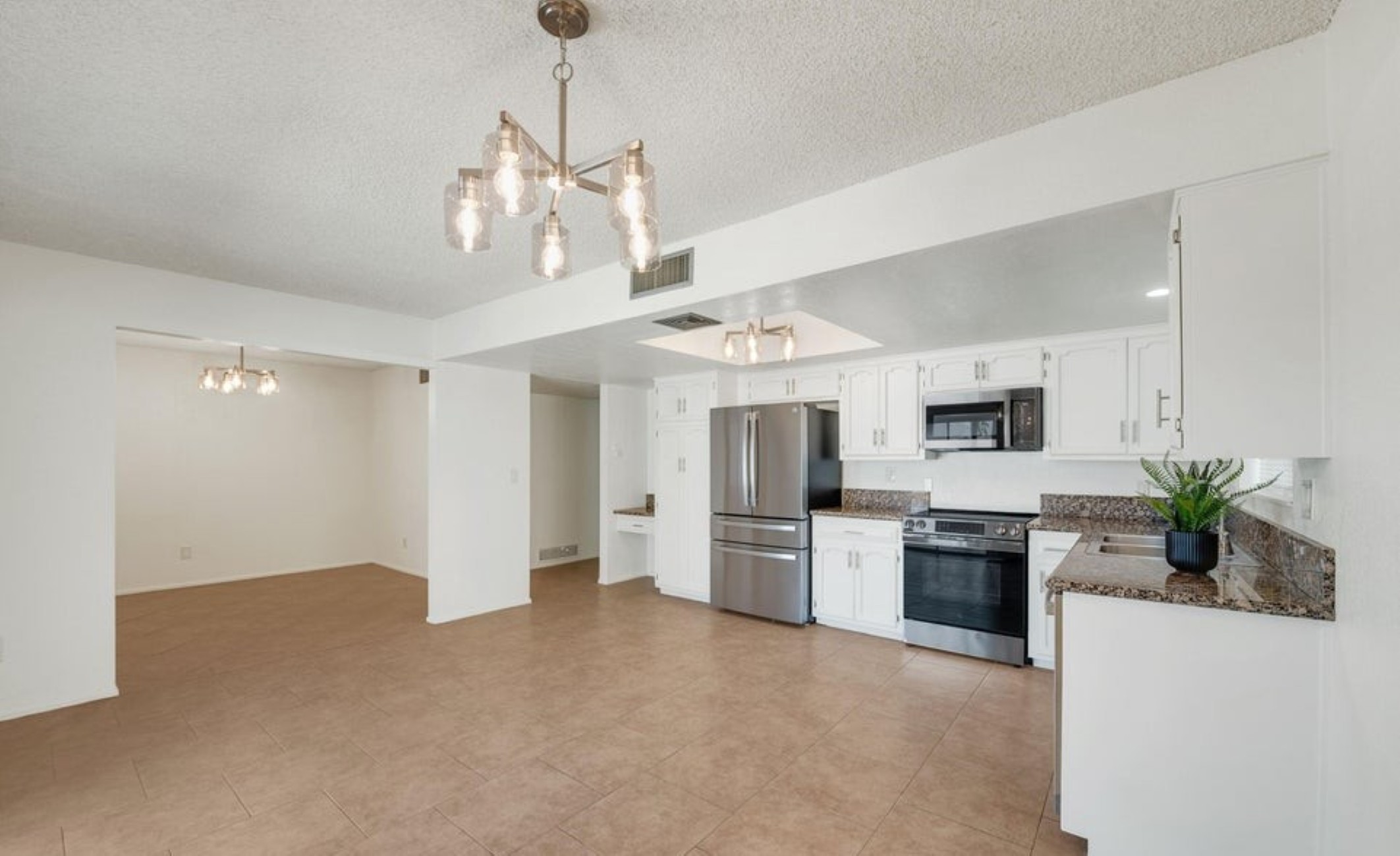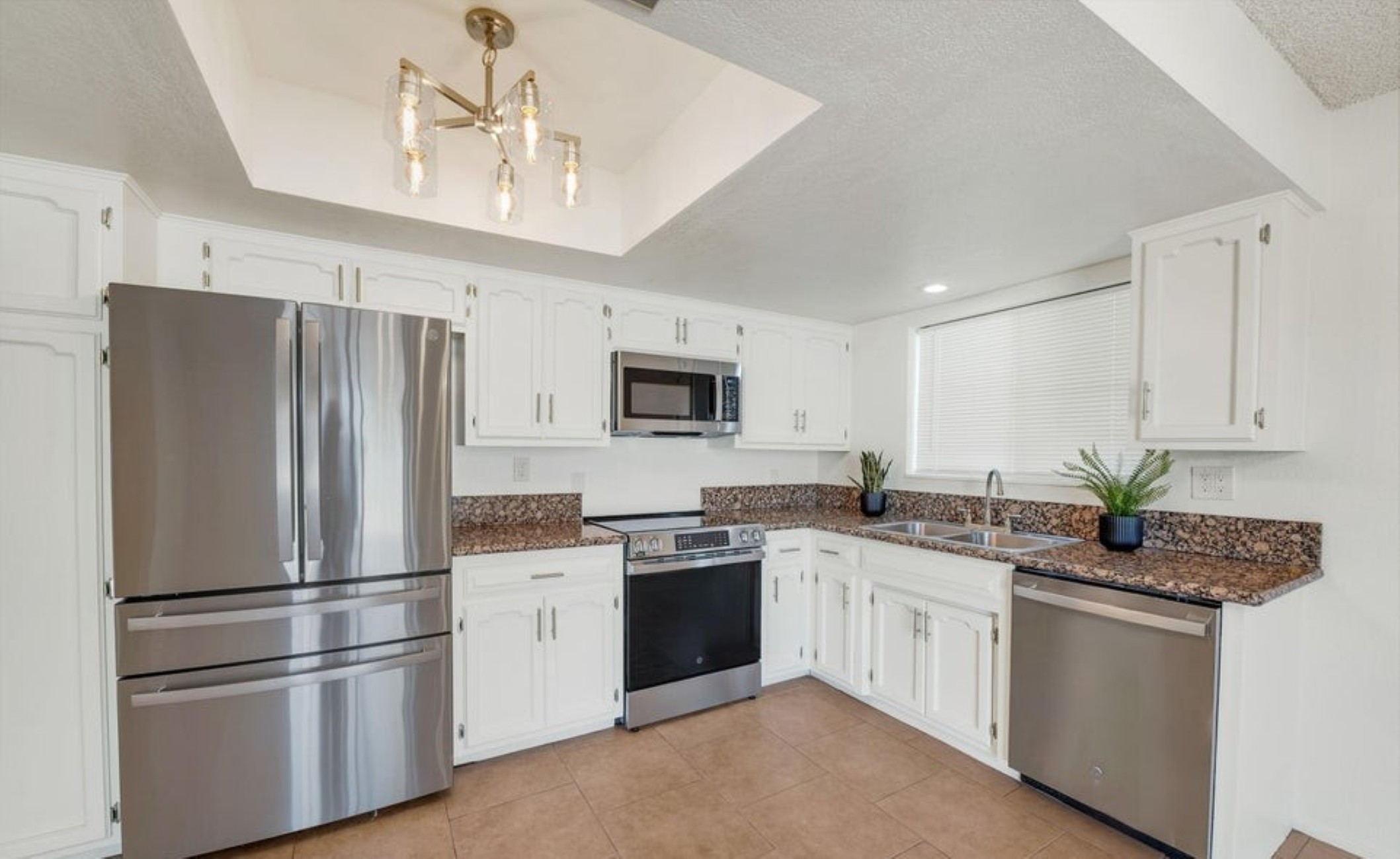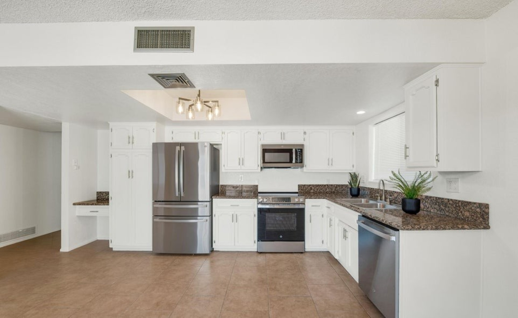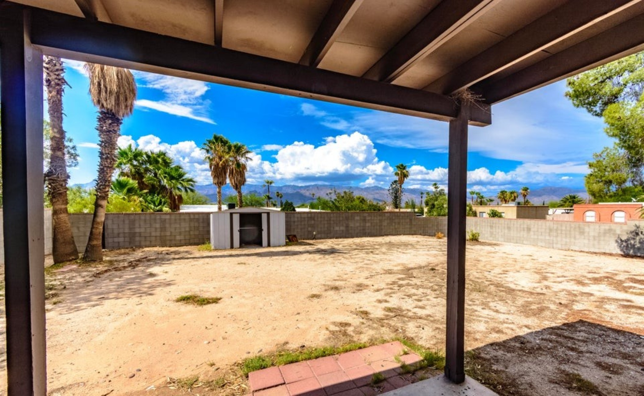 Charming masonry home set on a prime corner lot on a quiet cul-de-sac, offering beautiful mountain views, privacy, and an expansive fully enclosed yard with block wall construction. Situated on a superior quarter-acre parcel, this 3-bedroom, 2-bath residence has been lovingly maintained by the same family for decades and now features a recently completed remodel that blends timeless character with clean, modern finishes. Inside, spacious living areas showcase a cozy fireplace and tile flooring throughout (no carpet), creating a seamless, low-maintenance living environment with an easy, functional flow ideal for both everyday living and entertaining. The updated kitchen features wood cabinetry painted white with new satin nickel hardware, all-new GE Profile stainless steel appliances, and updated fixtures and lighting. Both the kitchen and bathrooms have been refreshed with new fixtures, hardware, and lighting throughout. The primary suite offers a beautifully updated bath with a dual vanity featuring dovetail construction and soft-close cabinetry, stone countertops, Kohler plumbing fixtures, a tiled walk-in shower with a rain shower head, and a new toilet. The secondary bathroom has also been fully updated with a new tub/shower surround, new vanity, updated fixtures, lighting, and a new toilet. Additional upgrades include new door hardware, updated lighting throughout, and a recently resurfaced roof for added peace of mind. A private front entry and covered patio create inviting spaces to relax or entertain, while the expansive backyard offers endless possibilities to enjoy the views or design a custom outdoor retreat. An oversized dual carport with enclosed storage provides ample space for vehicles, tools, or hobbies. Conveniently located yet offering a sense of seclusion, this is a rare opportunity to own a thoughtfully updated home on a premium lot with mountain views.