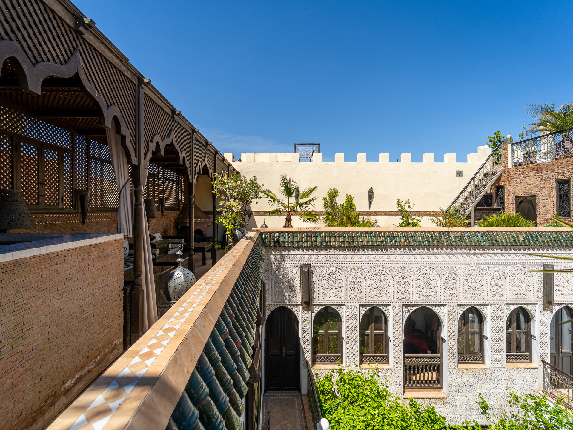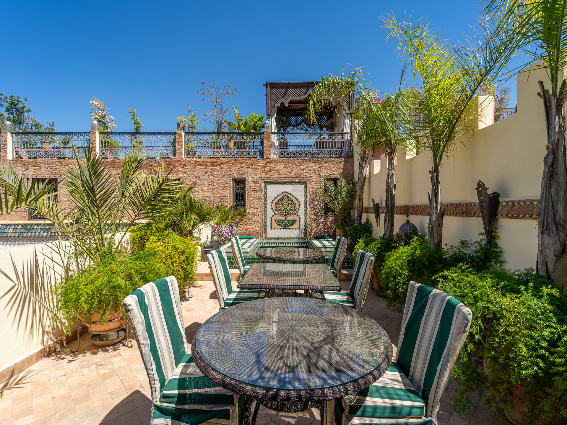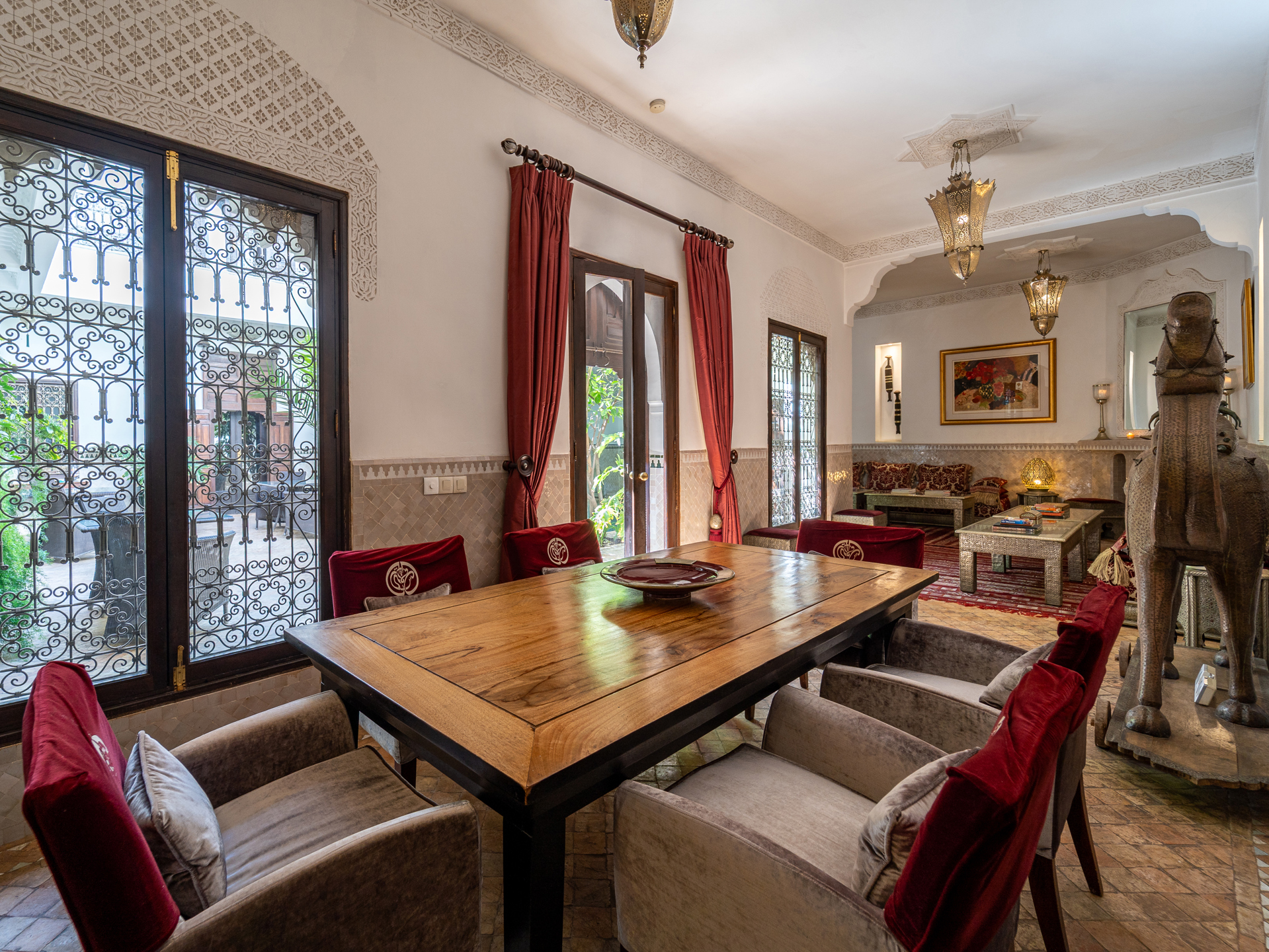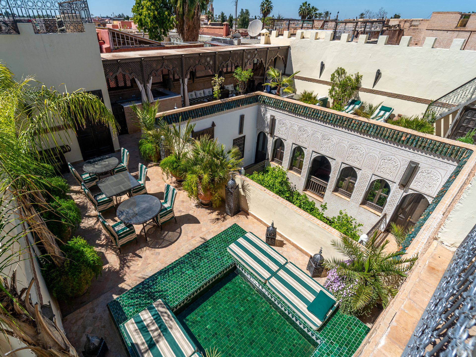 Located just steps from the renowned Bahia Palace and with car access only 30 meters away, this Riad, operating as a guesthouse for over 15 years, is a true sanctuary of tranquility. The Riad features a patio with a generous 6 m x 3 m swimming pool, seamlessly integrated into the spacious courtyard adorned with orange trees. On the ground floor, there are two elegantly appointed bedrooms with en-suite bathrooms, a double living room with fireplace and dining area, a bhou overlooking the pool, a fully equipped kitchen, an office, guest toilets, and ample storage. The first floor comprises two junior suites with bathrooms, two comfortable master suites, and a massage room. On the terrace, a 45 m² apartment includes a kitchen, living room, dressing area, bedroom, and bathroom, which can be configured as two bedrooms with bathrooms. The terrace also features a water point with solarium, a pergola for dining with an outdoor kitchen, and a panoramic upper terrace overlooking the medina, offering 360° views of the city and the Atlas Mountains. Originally, the Mellah was the Jewish quarter of the medina, evidenced by its synagogue and cemetery. Authentic and vibrant, it is dotted with cafés, fine dining establishments, and houses the Bab Mellah spice souk. For further information, please contact Charles Detchessahar at +212 6 61 06 32 49.