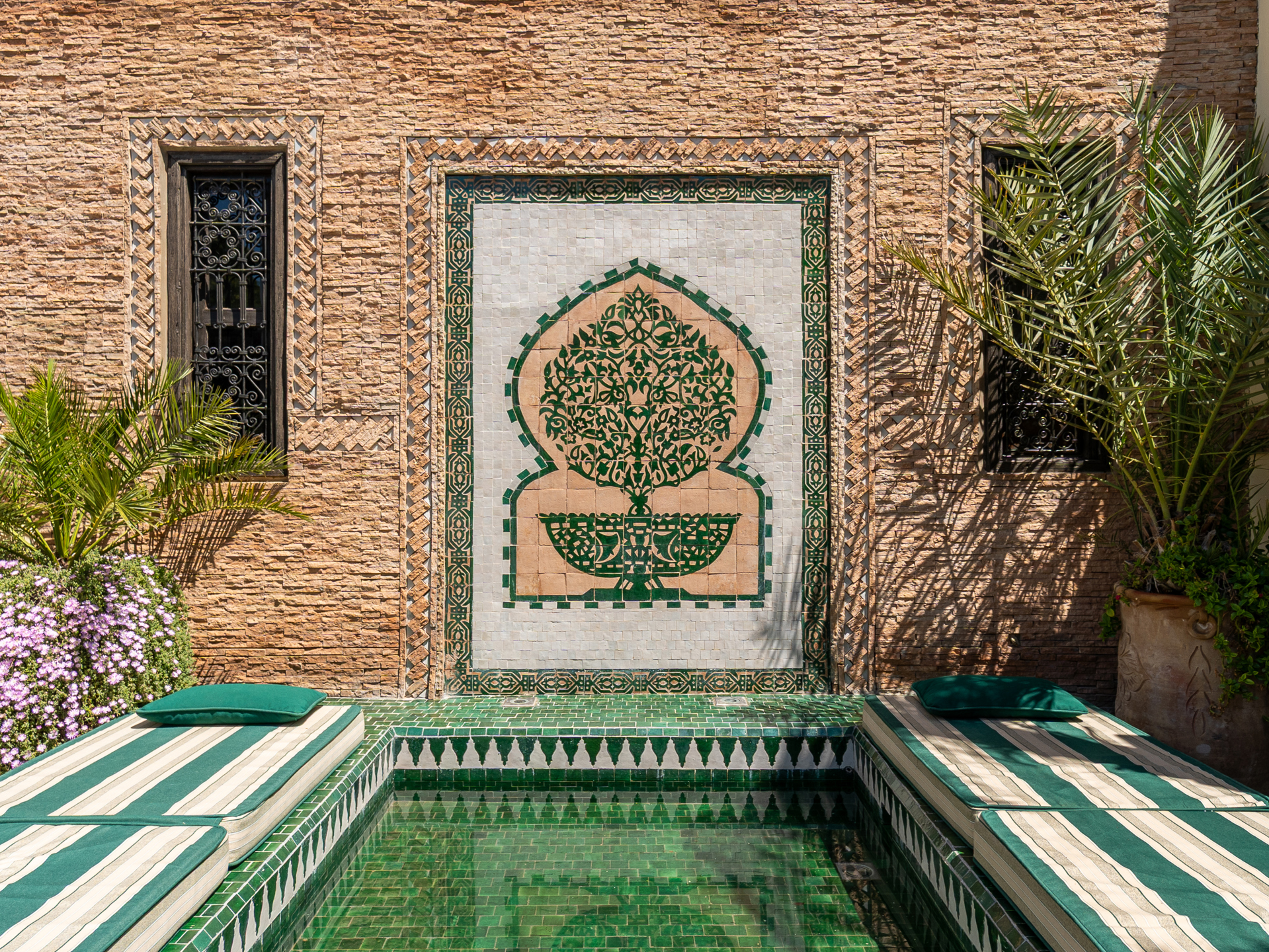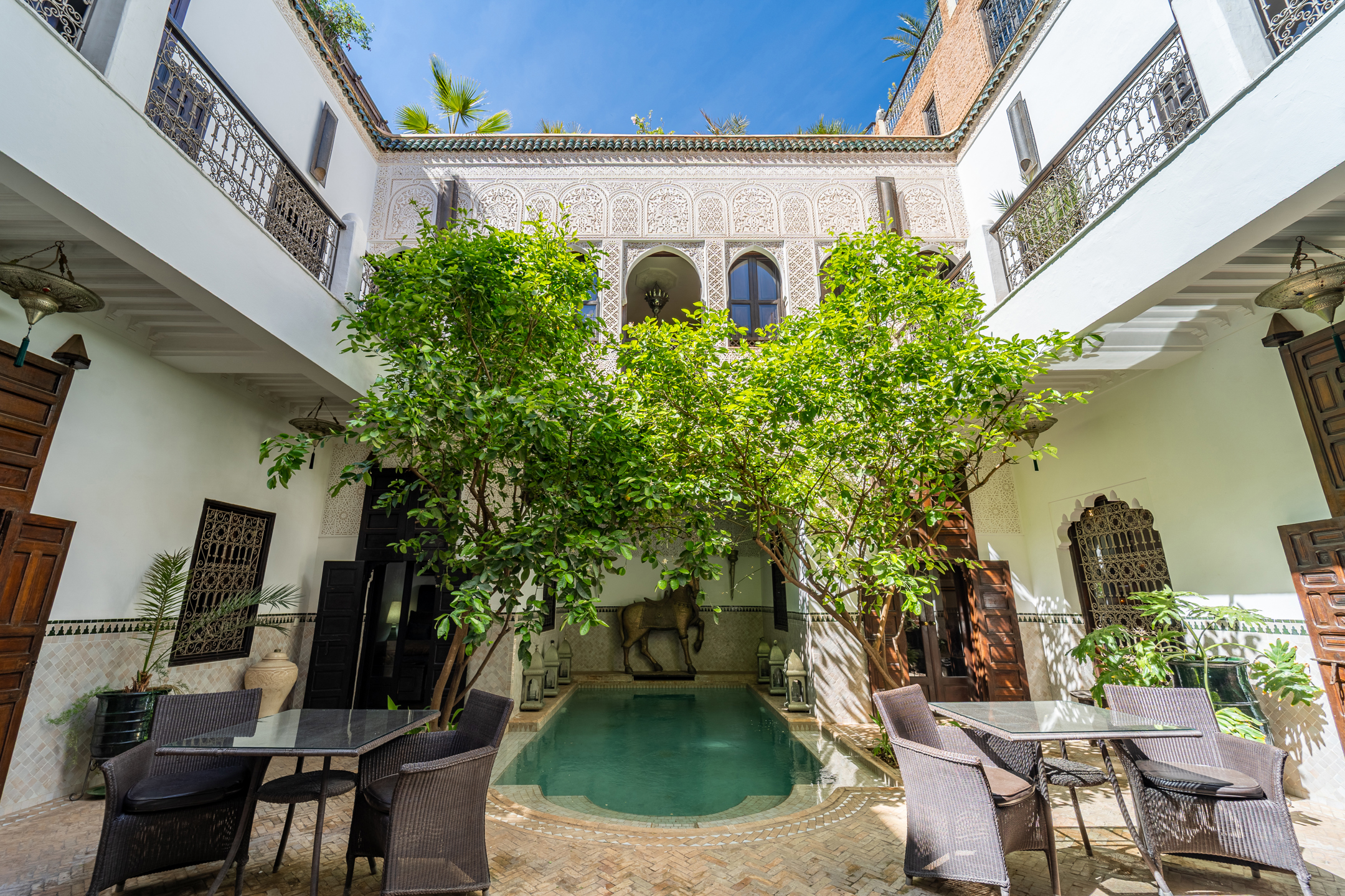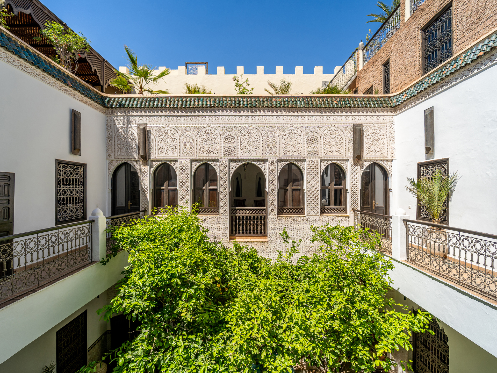 Located just steps from the renowned Bahia Palace and with car access only 30 meters away, this Riad, operating as a guesthouse for over 15 years, is a true sanctuary of tranquility. The Riad features a patio with a generous 6 m x 3 m swimming pool, seamlessly integrated into the spacious courtyard adorned with orange trees. On the ground floor, there are two elegantly appointed bedrooms with en-suite bathrooms, a double living room with fireplace and dining area, a bhou overlooking the pool, a fully equipped kitchen, an office, guest toilets, and ample storage. The first floor comprises two junior suites with bathrooms, two comfortable master suites, and a massage room. On the terrace, a 45 m² apartment includes a kitchen, living room, dressing area, bedroom, and bathroom, which can be configured as two bedrooms with bathrooms. The terrace also features a water point with solarium, a pergola for dining with an outdoor kitchen, and a panoramic upper terrace overlooking the medina, offering 360° views of the city and the Atlas Mountains. Originally, the Mellah was the Jewish quarter of the medina, evidenced by its synagogue and cemetery. Authentic and vibrant, it is dotted with cafés, fine dining establishments, and houses the Bab Mellah spice souk. For further information, please contact Charles Detchessahar at +212 6 61 06 32 49.